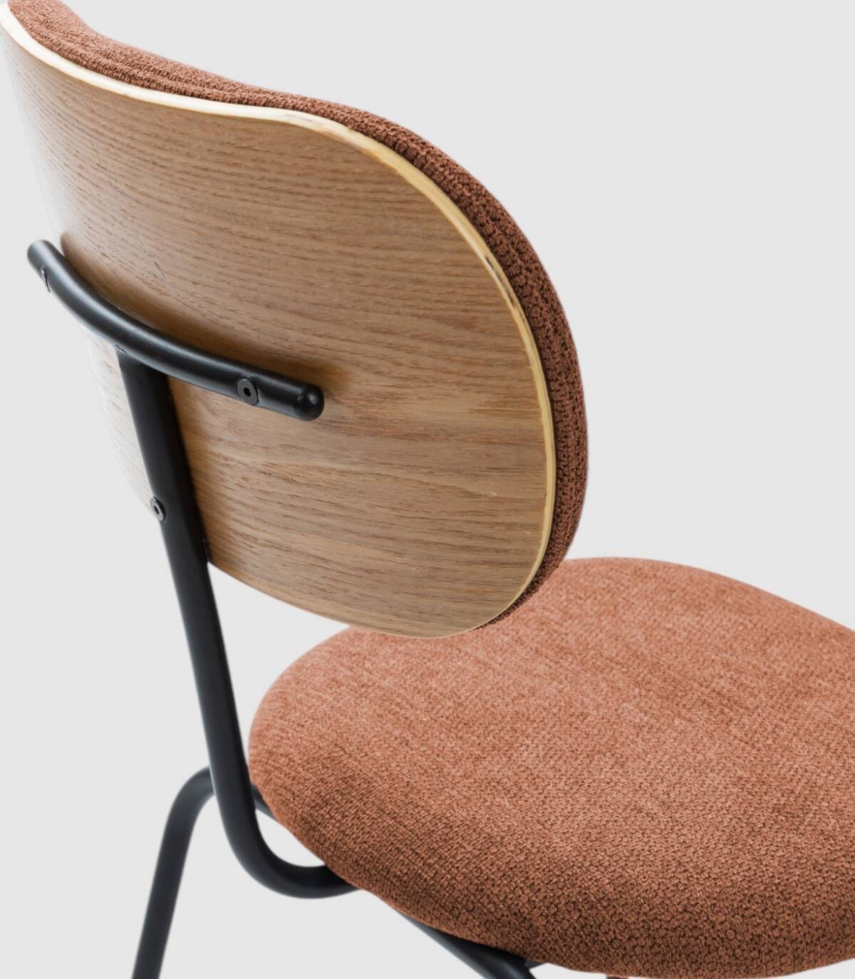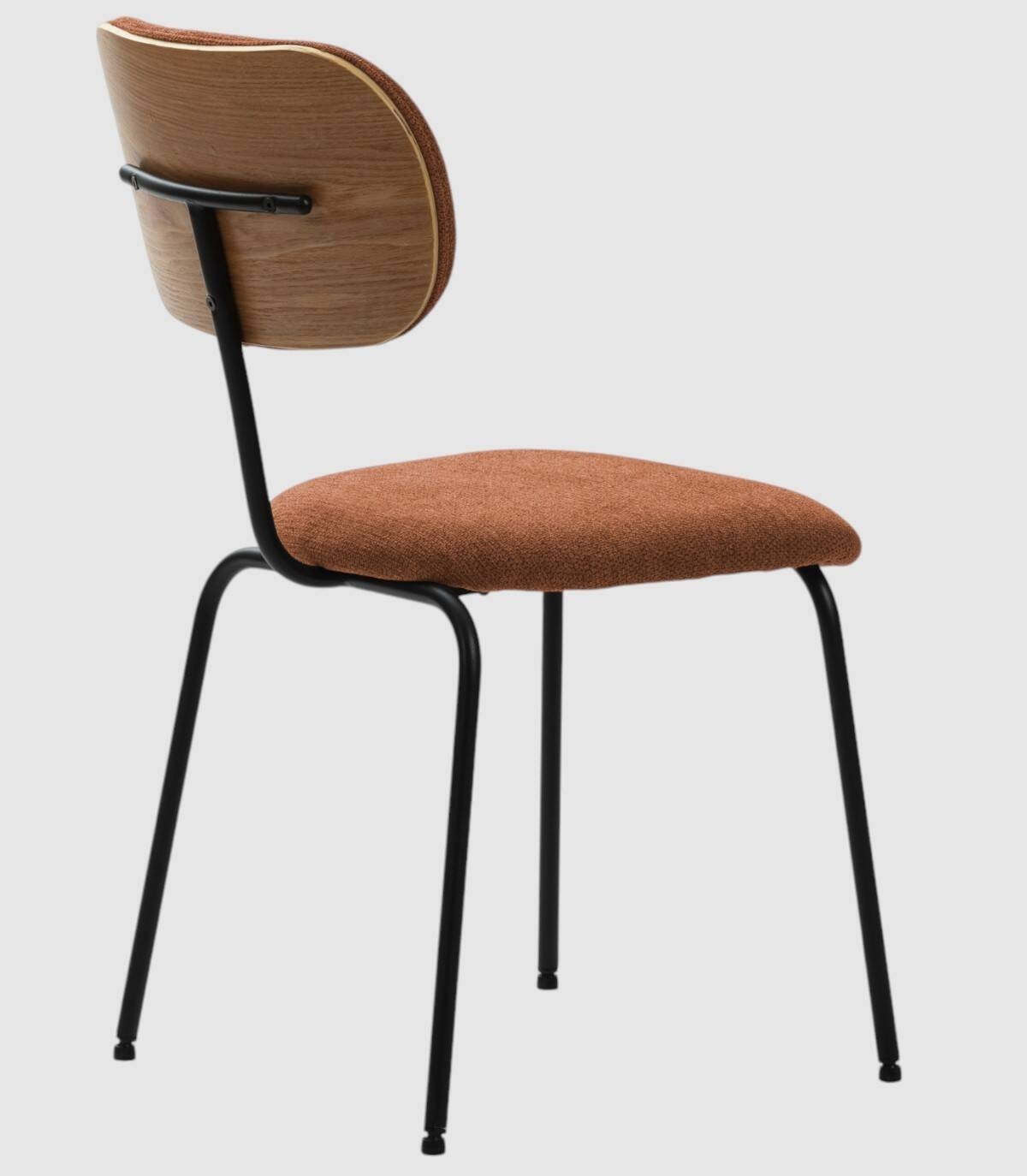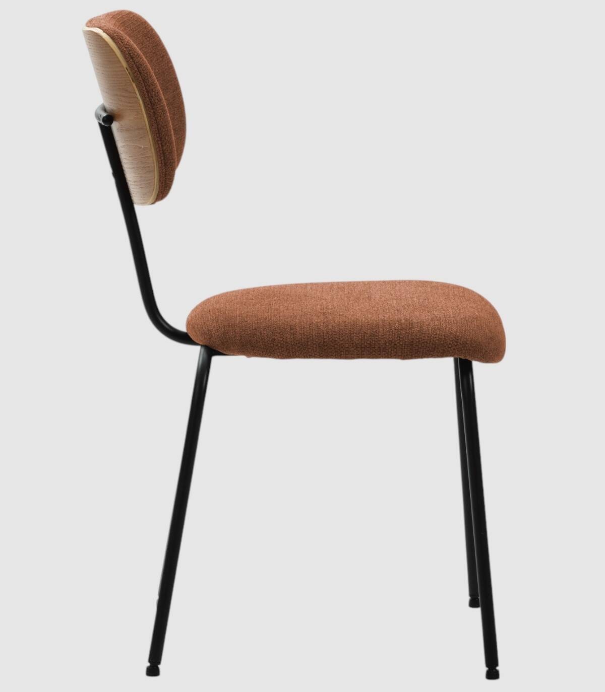 La silla Wame se compone de asiento y respaldo tapizados de color teja sobre estructura de metal con cuatro patas pintado de color negro.