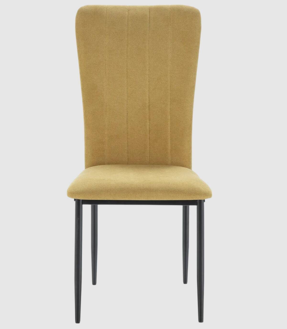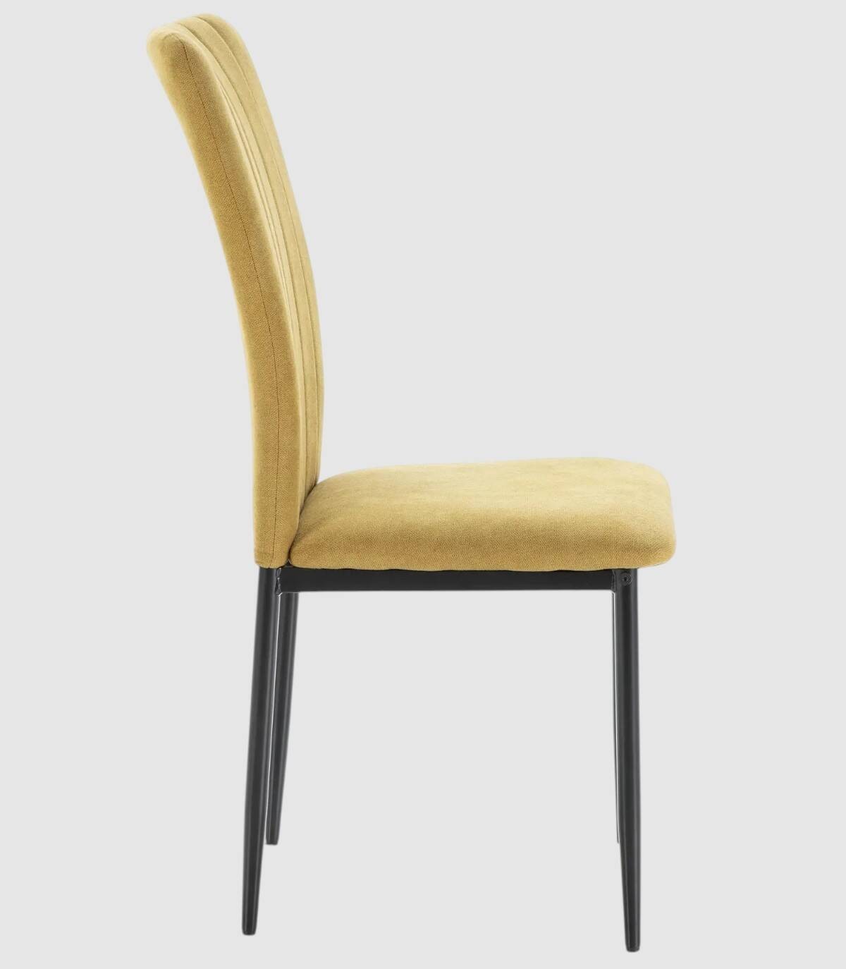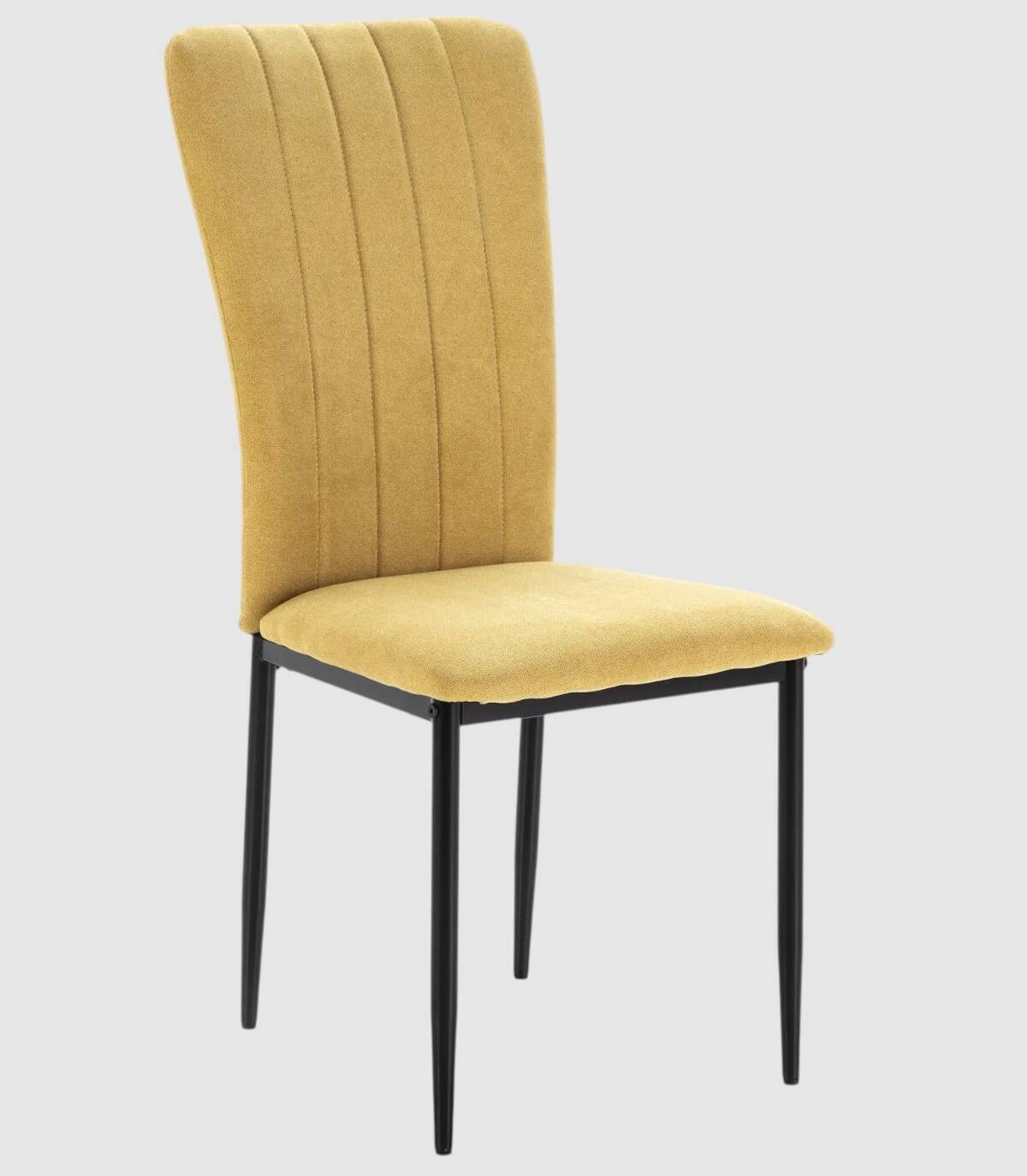La silla Tilan se compone de asiento y respaldo tapizado de color mostaza sobre estructura de metal con cuatro patas de color negro.
