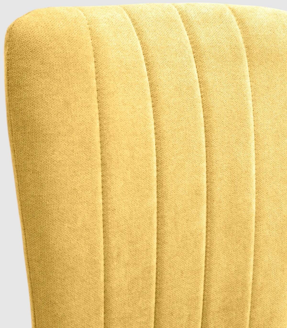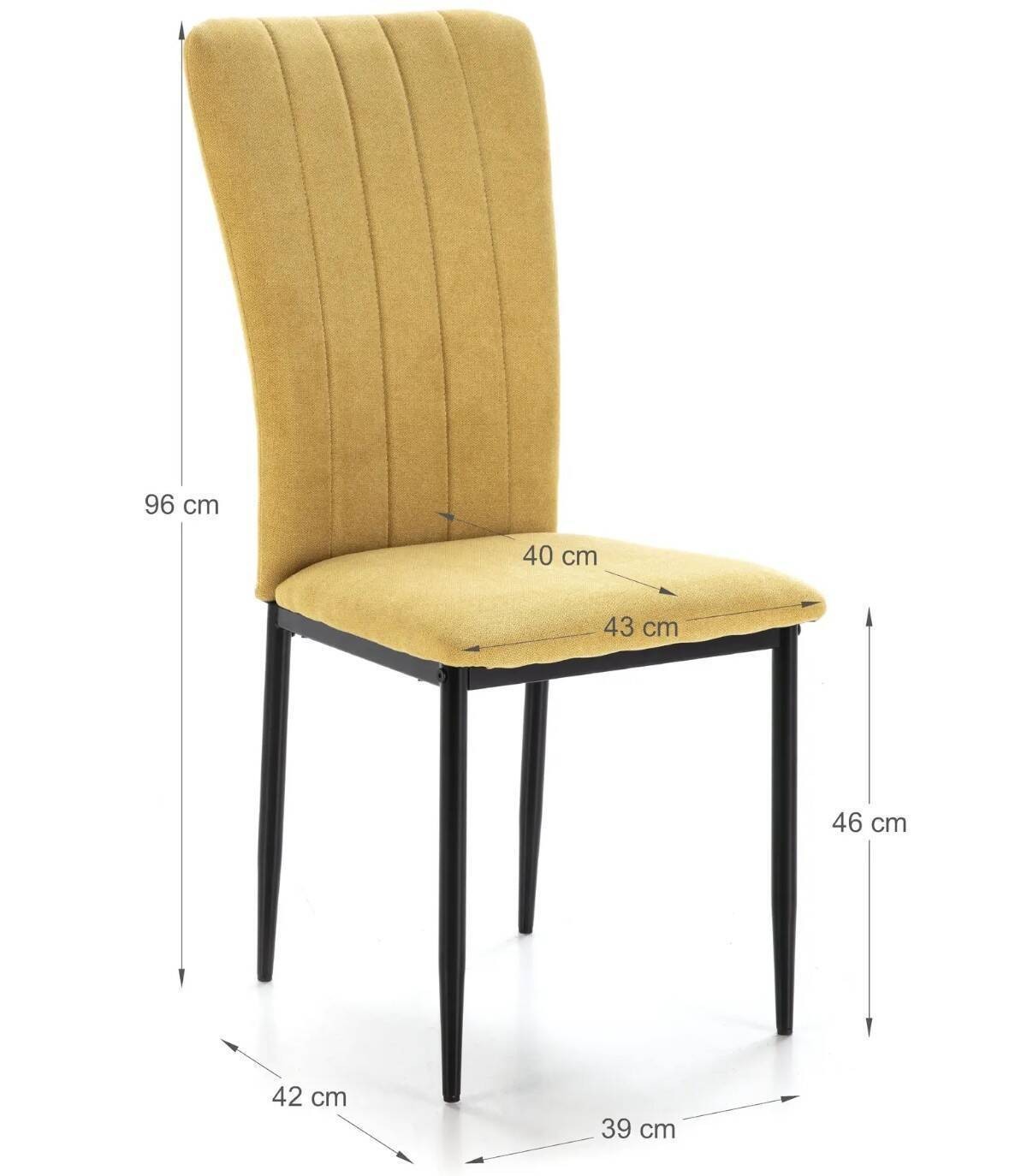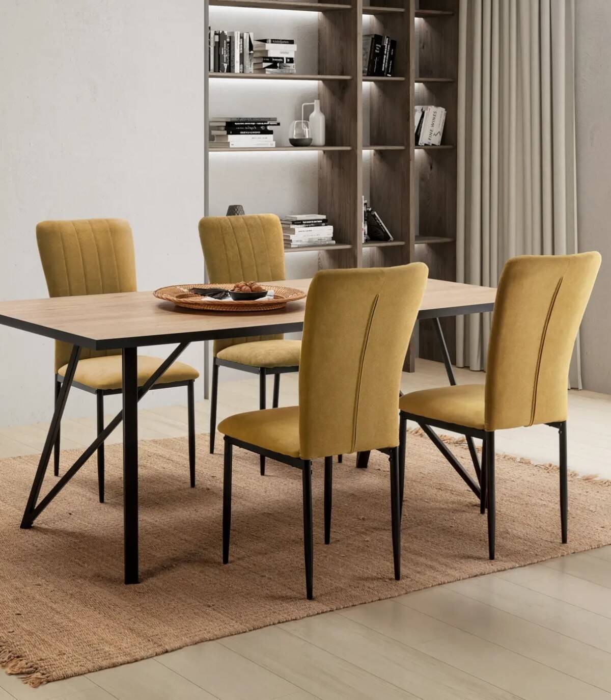 La silla Tilan se compone de asiento y respaldo tapizado de color mostaza sobre estructura de metal con cuatro patas de color negro.