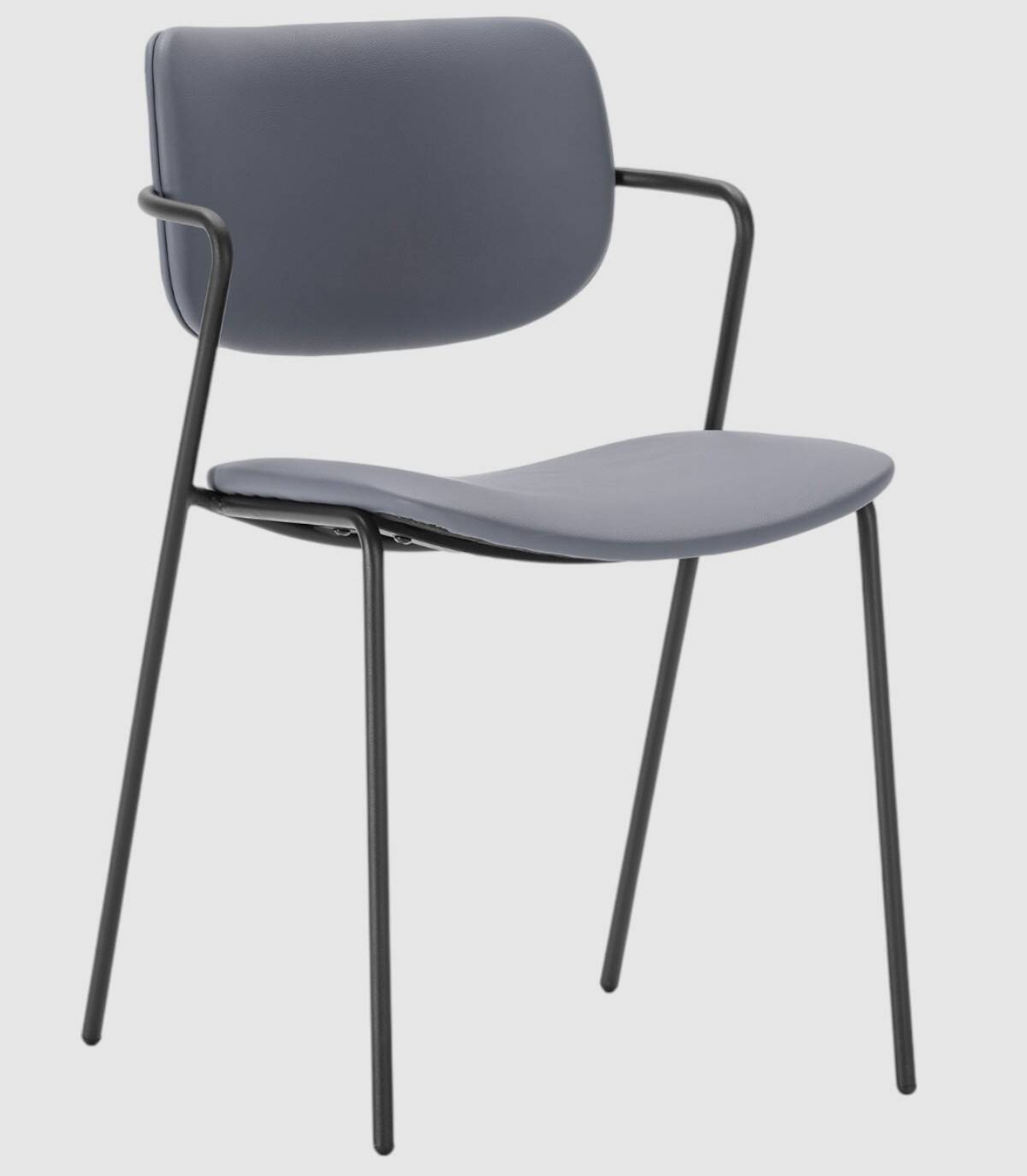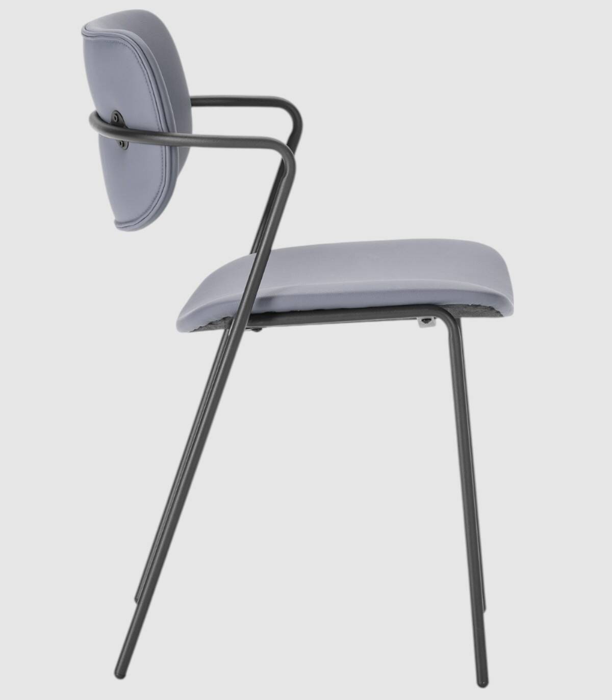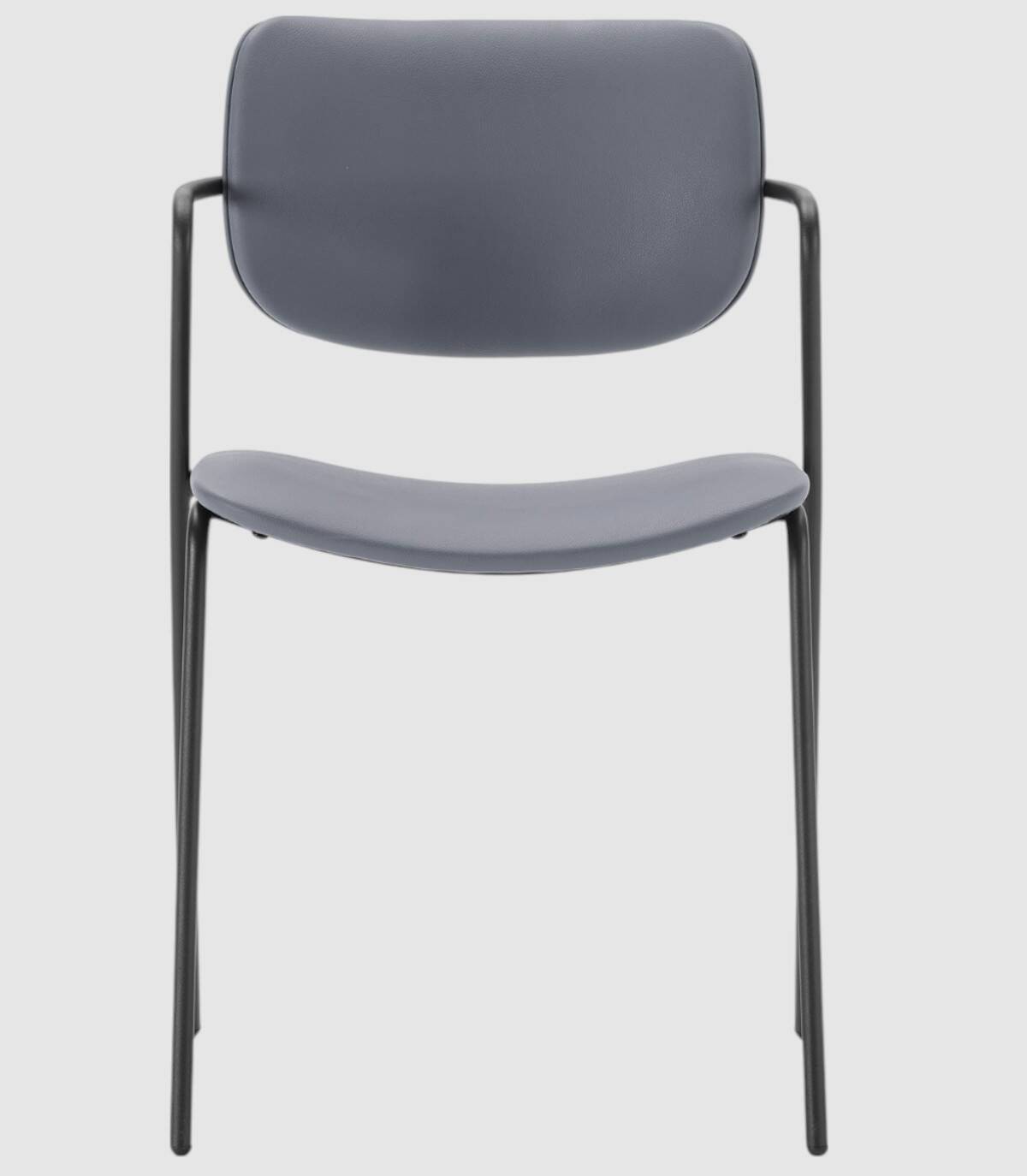 La silla Zeany se compone de asiento y respaldo tapizados de color gris sobre estructura de metal con cuatro patas de color negro.