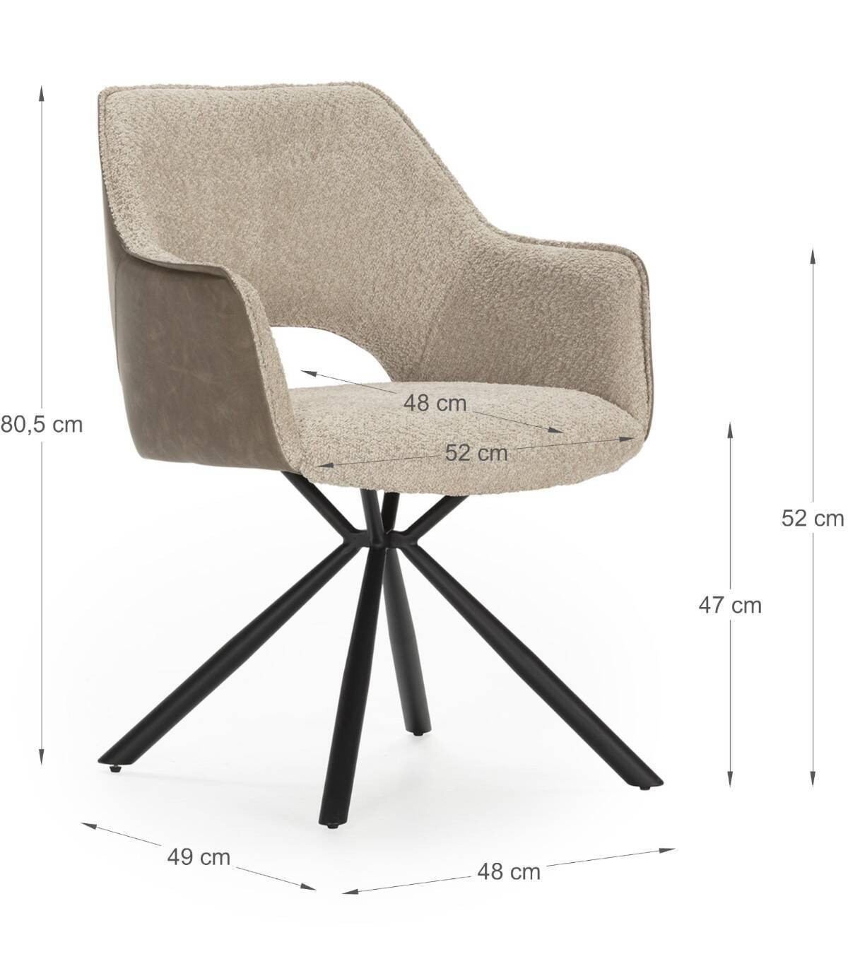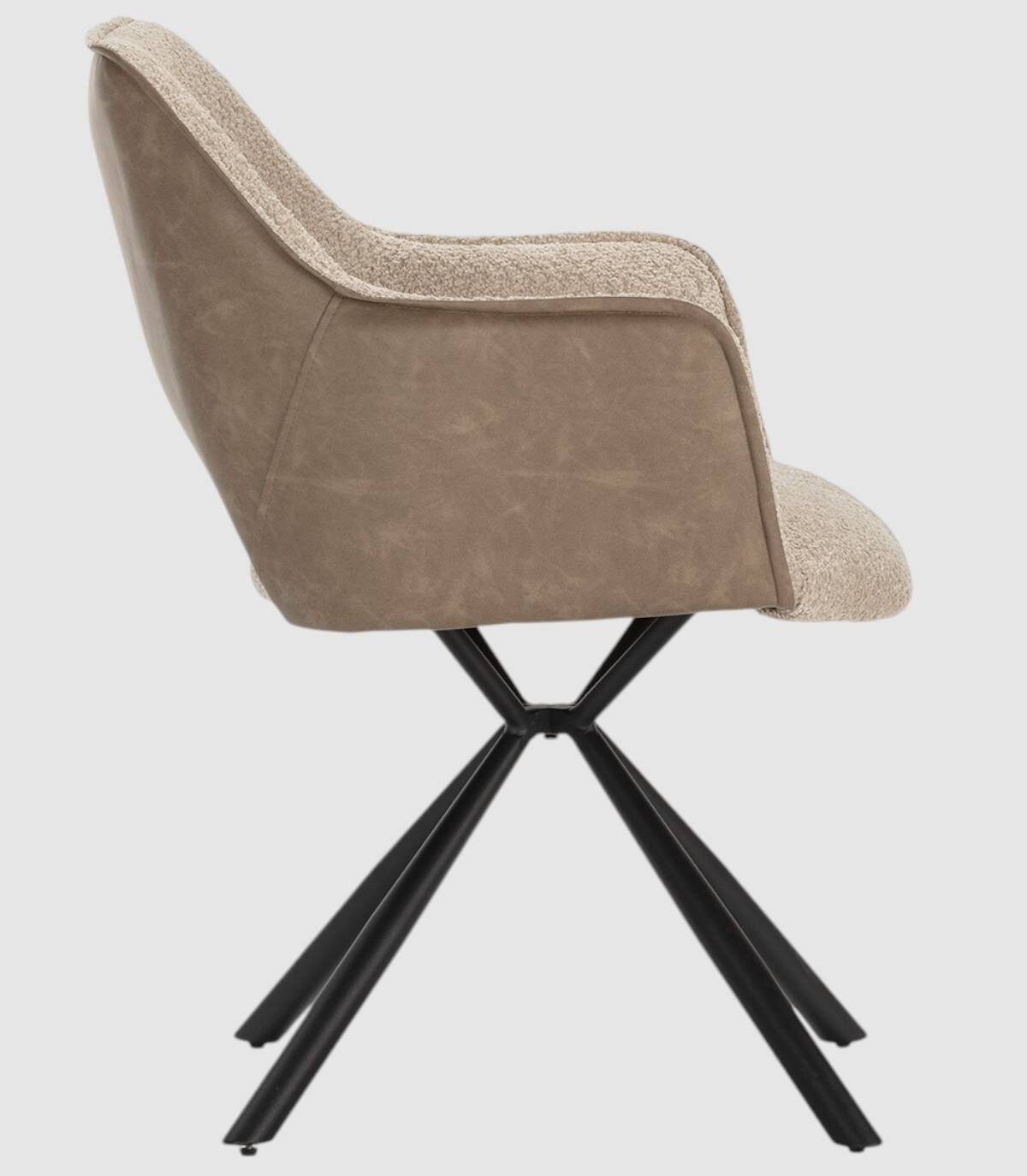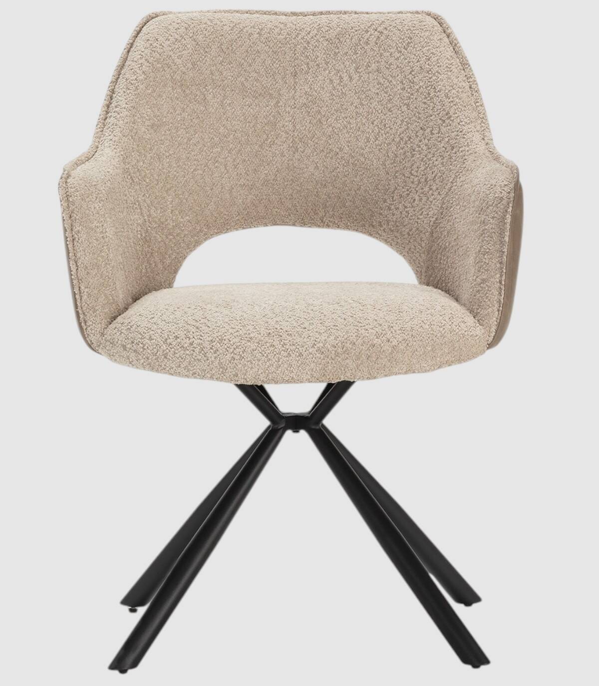 El sillón Elyst se compone de asiento, respaldo y reposabrazos tapizados de color beige sobre estructura de metal con cuatro patas de color negro.