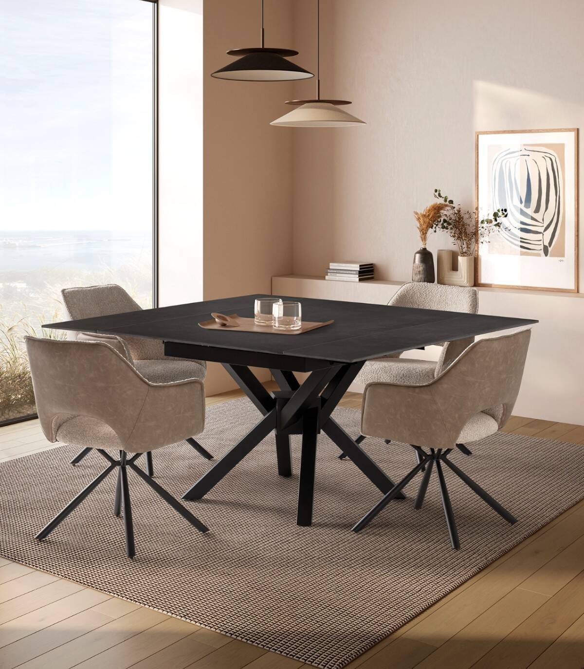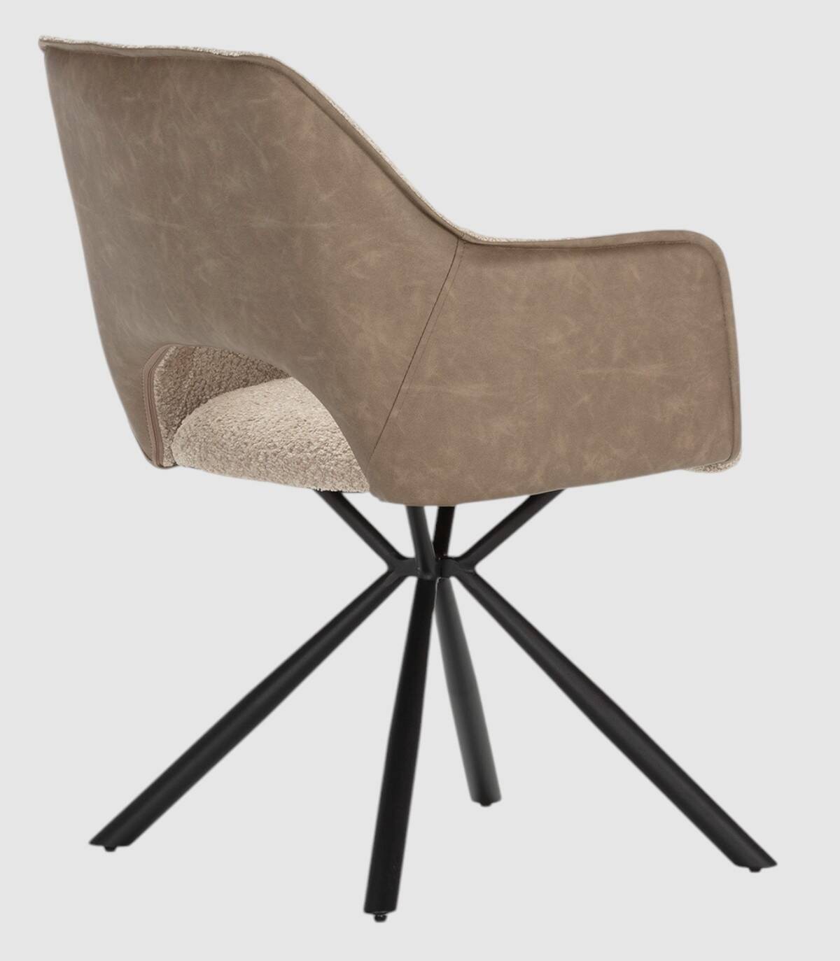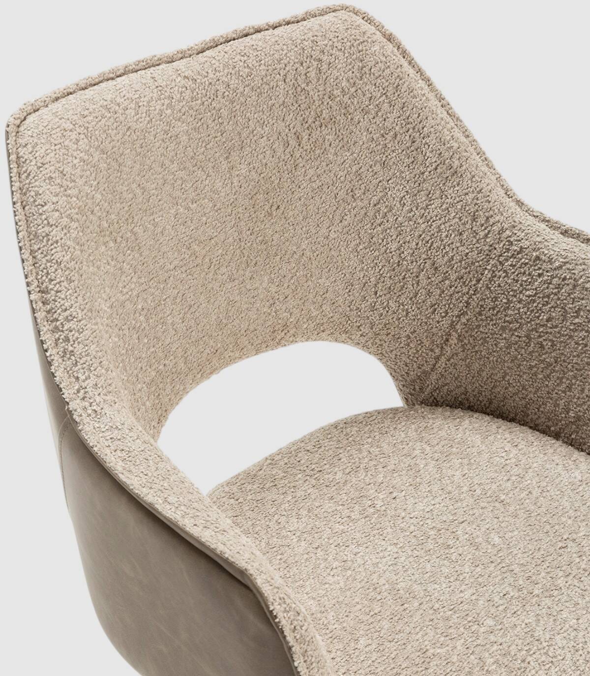 El sillón Elyst se compone de asiento, respaldo y reposabrazos tapizados de color beige sobre estructura de metal con cuatro patas de color negro.