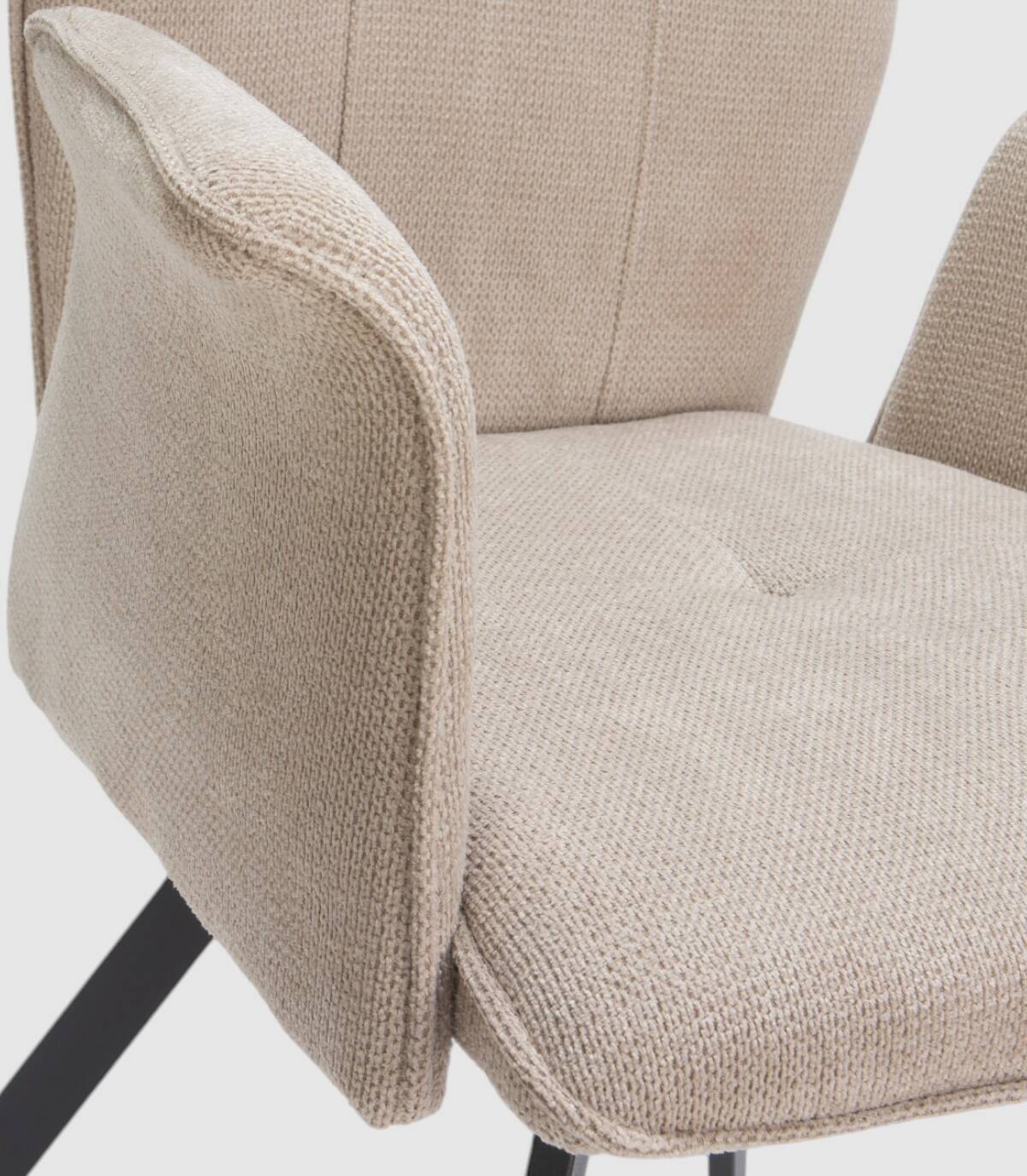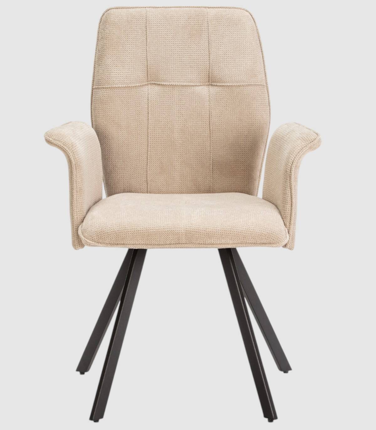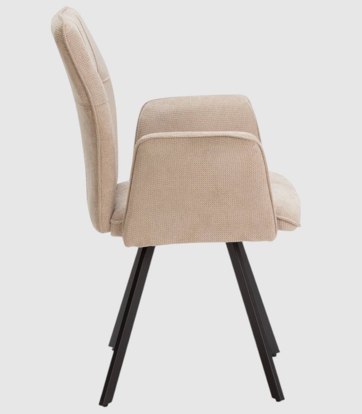 El sillón Seine se compone de asiento, respaldo y reposabrazos tapizados de color beige sobre estructura de metal con cuatro patas de color negro.