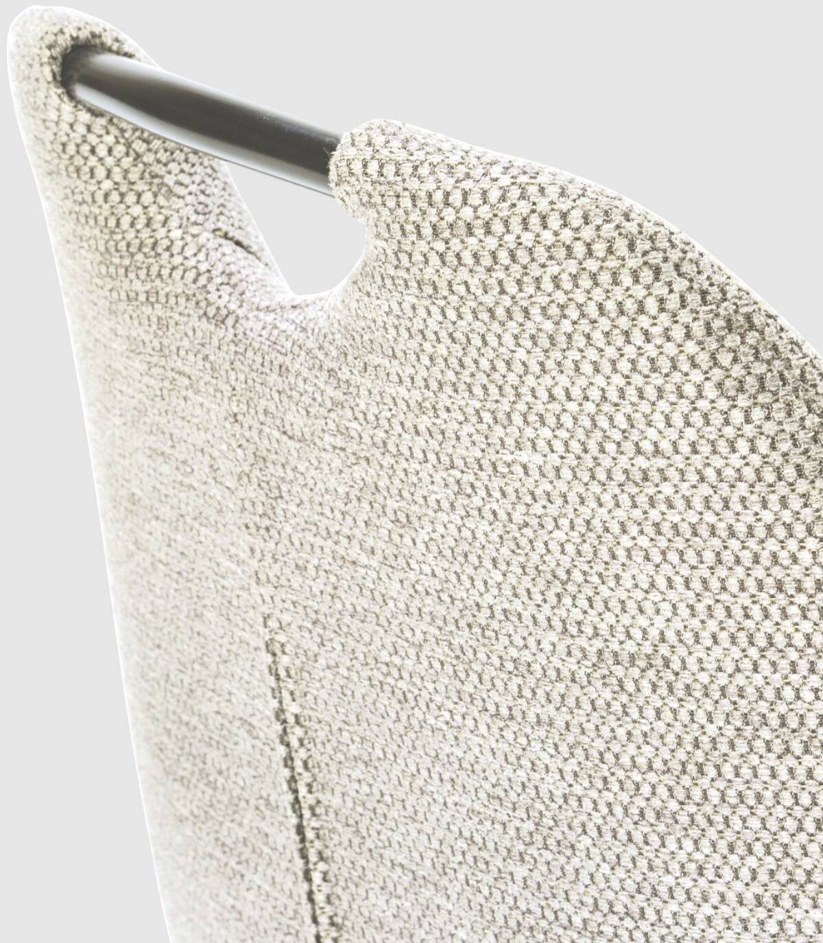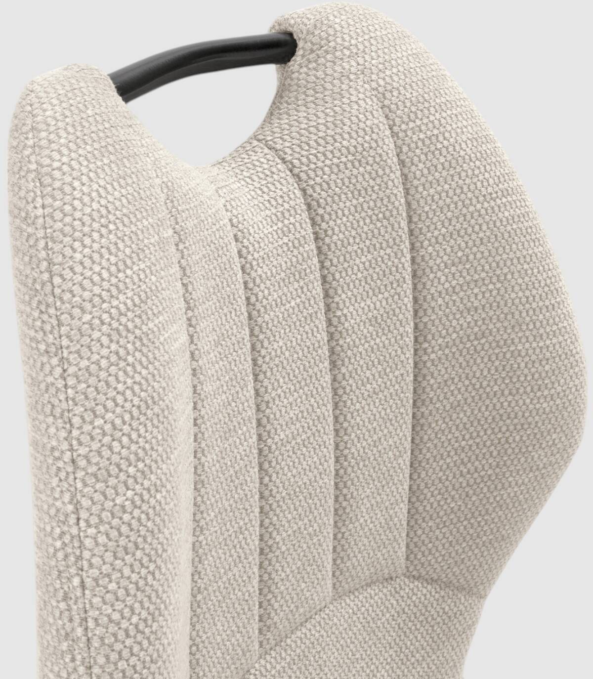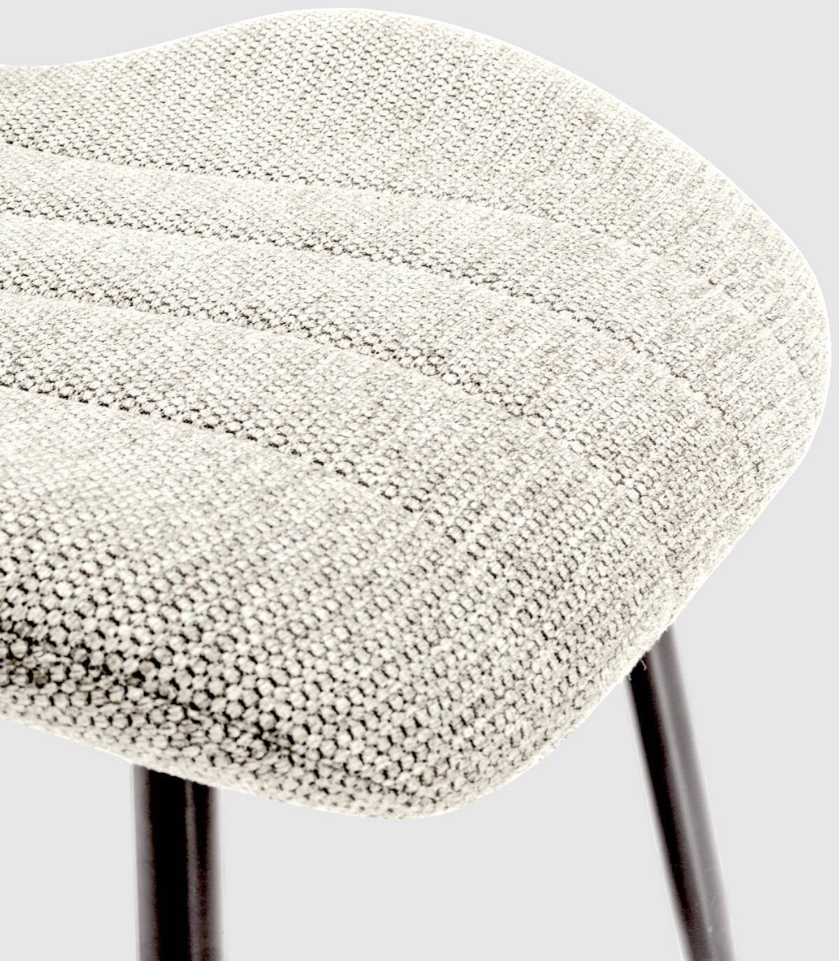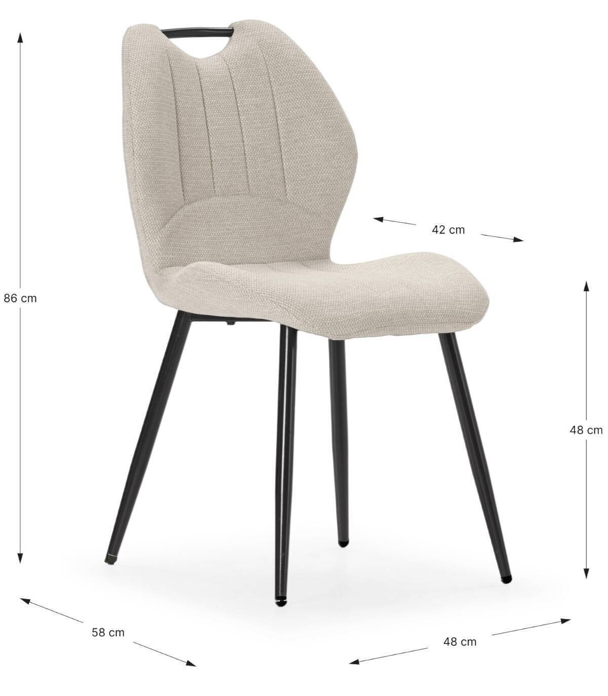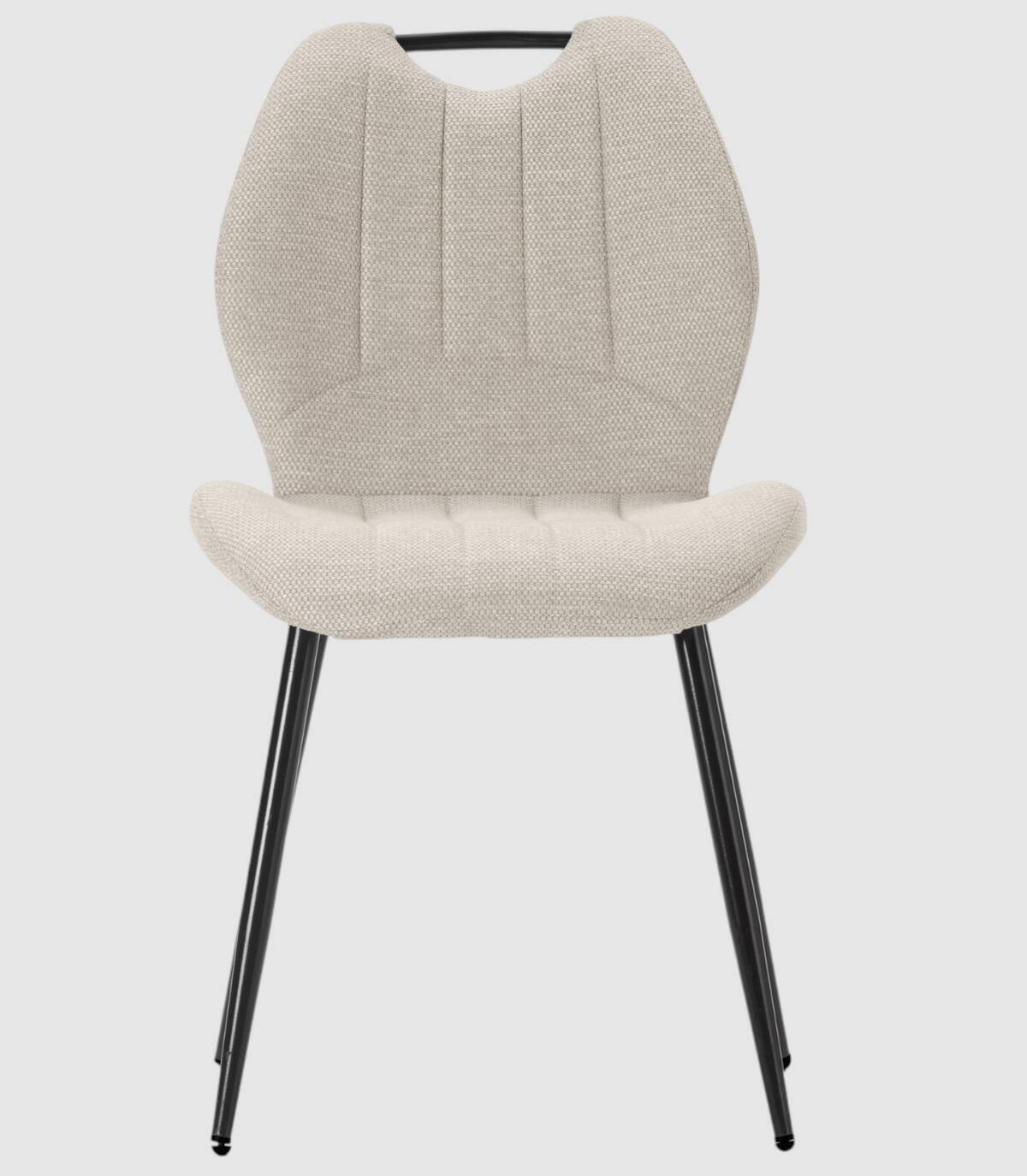 La silla Yara se compone de asiento y respaldo tapizado de color beige sobre estructura de metal con cuatro patas de color negro.