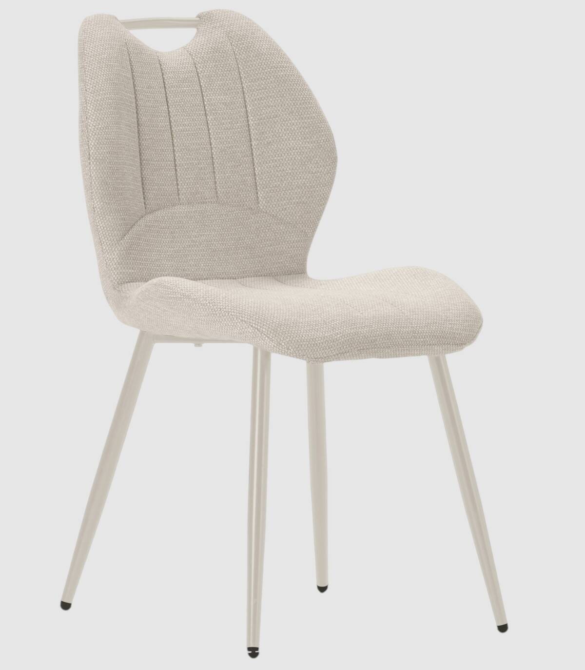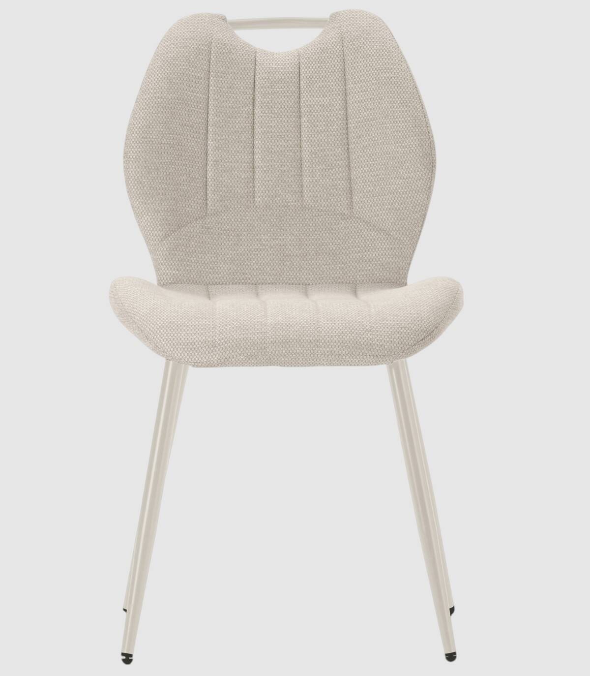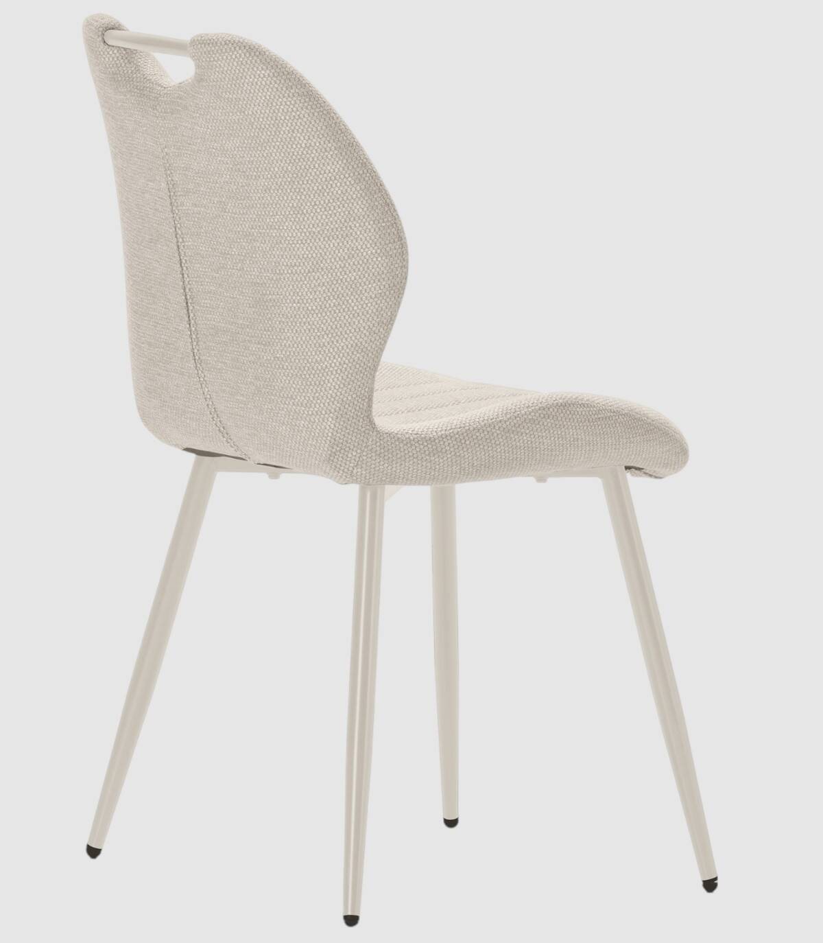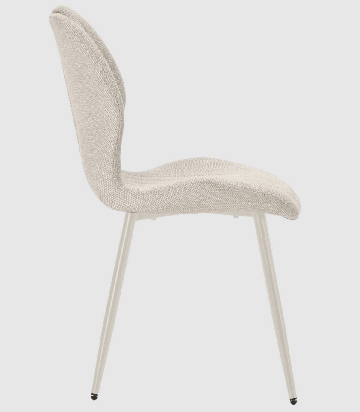 La silla Yara se compone de asiento y respaldo tapizado de color beige sobre estructura de metal con cuatro patas de color beige.