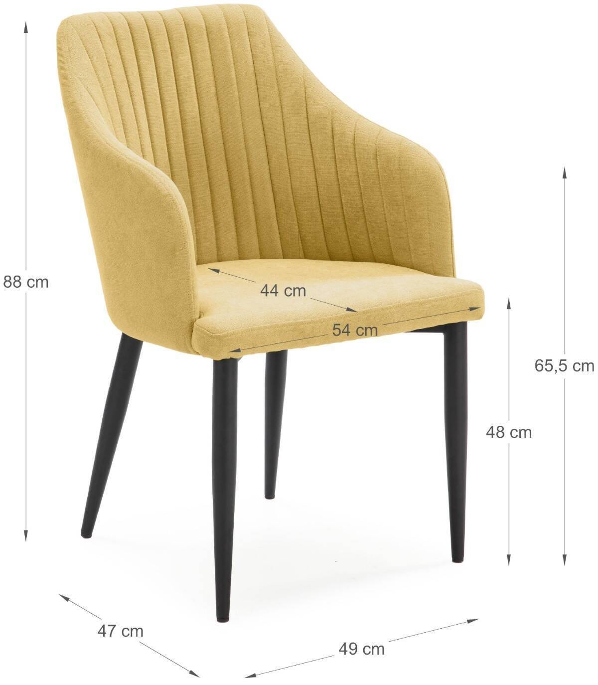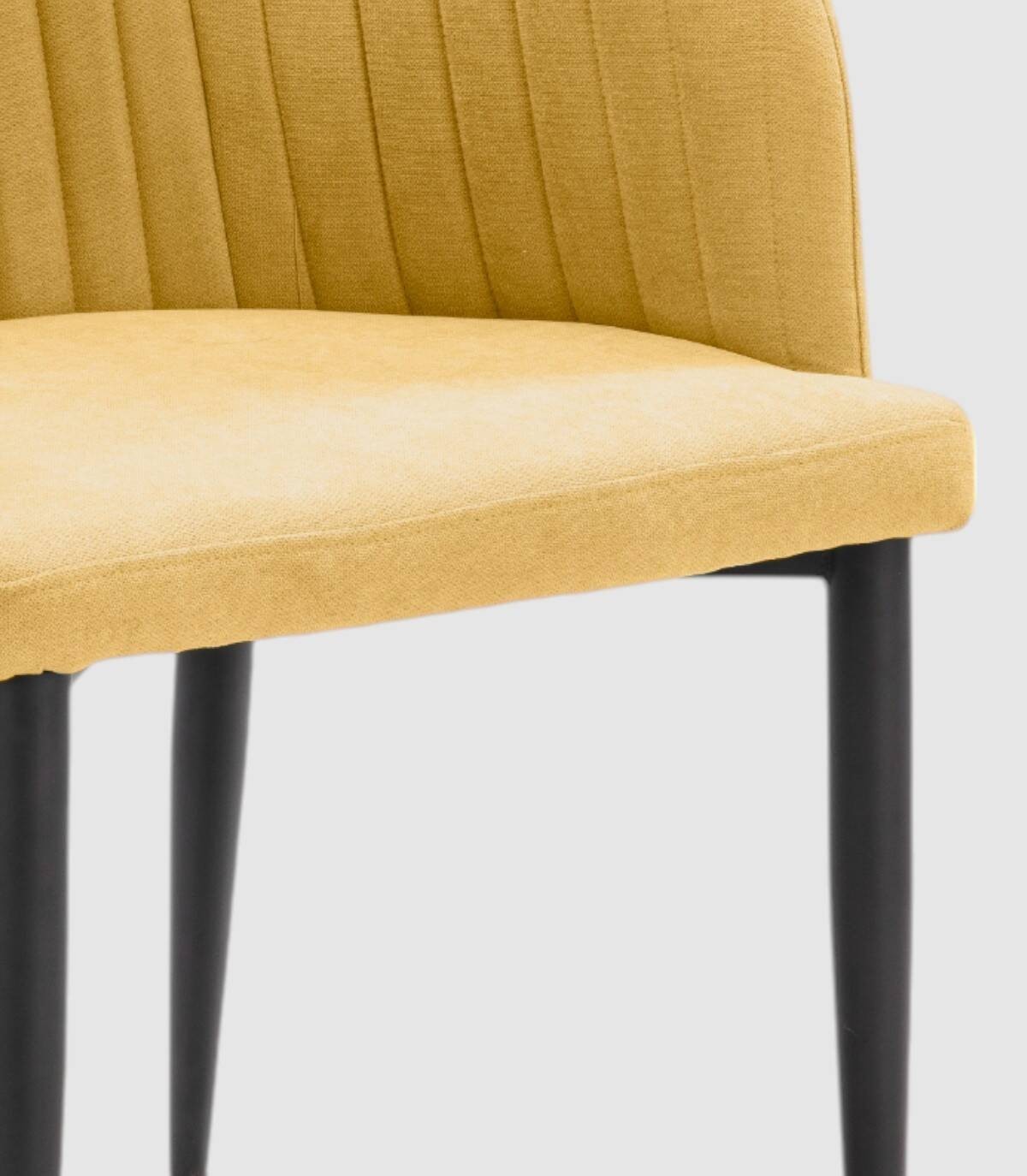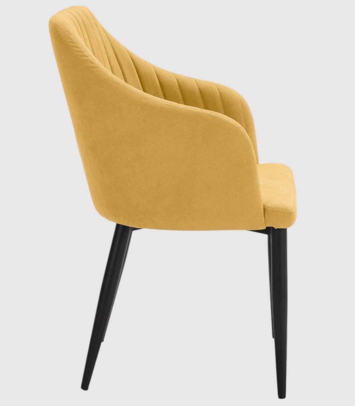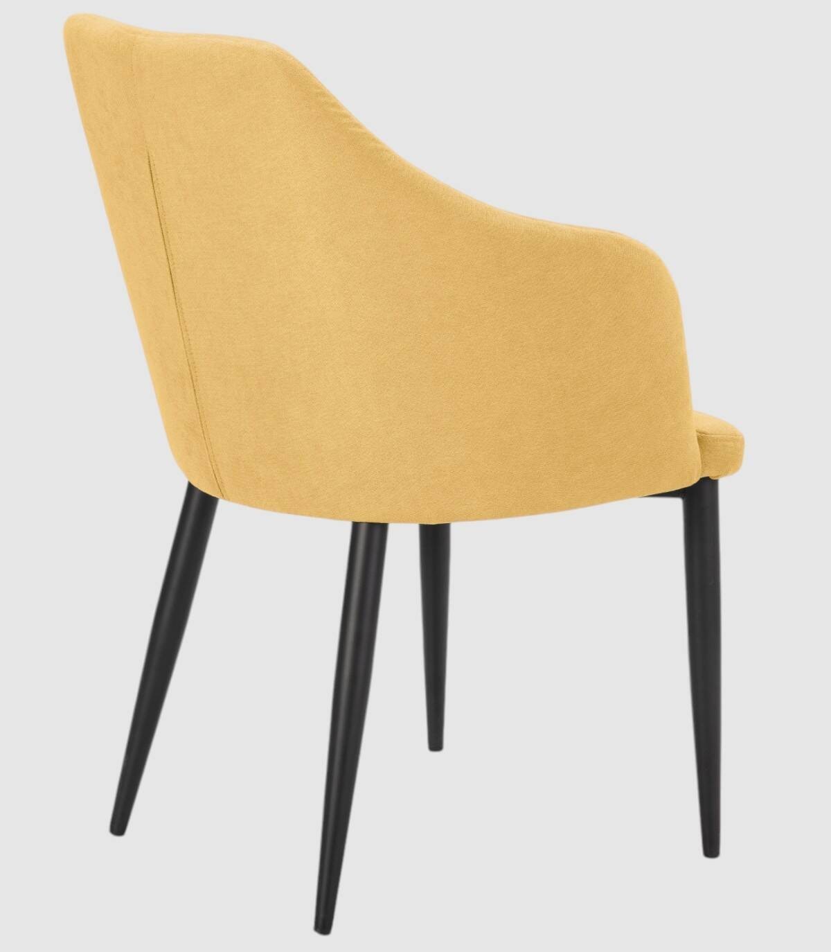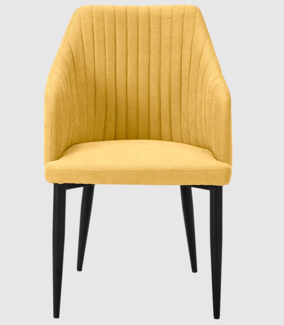 El sillón Guray se compone de asiento, respaldo y reposabrazos tapizados de color amarillo sobre estructura de metal con cuatro patas de color negro.
