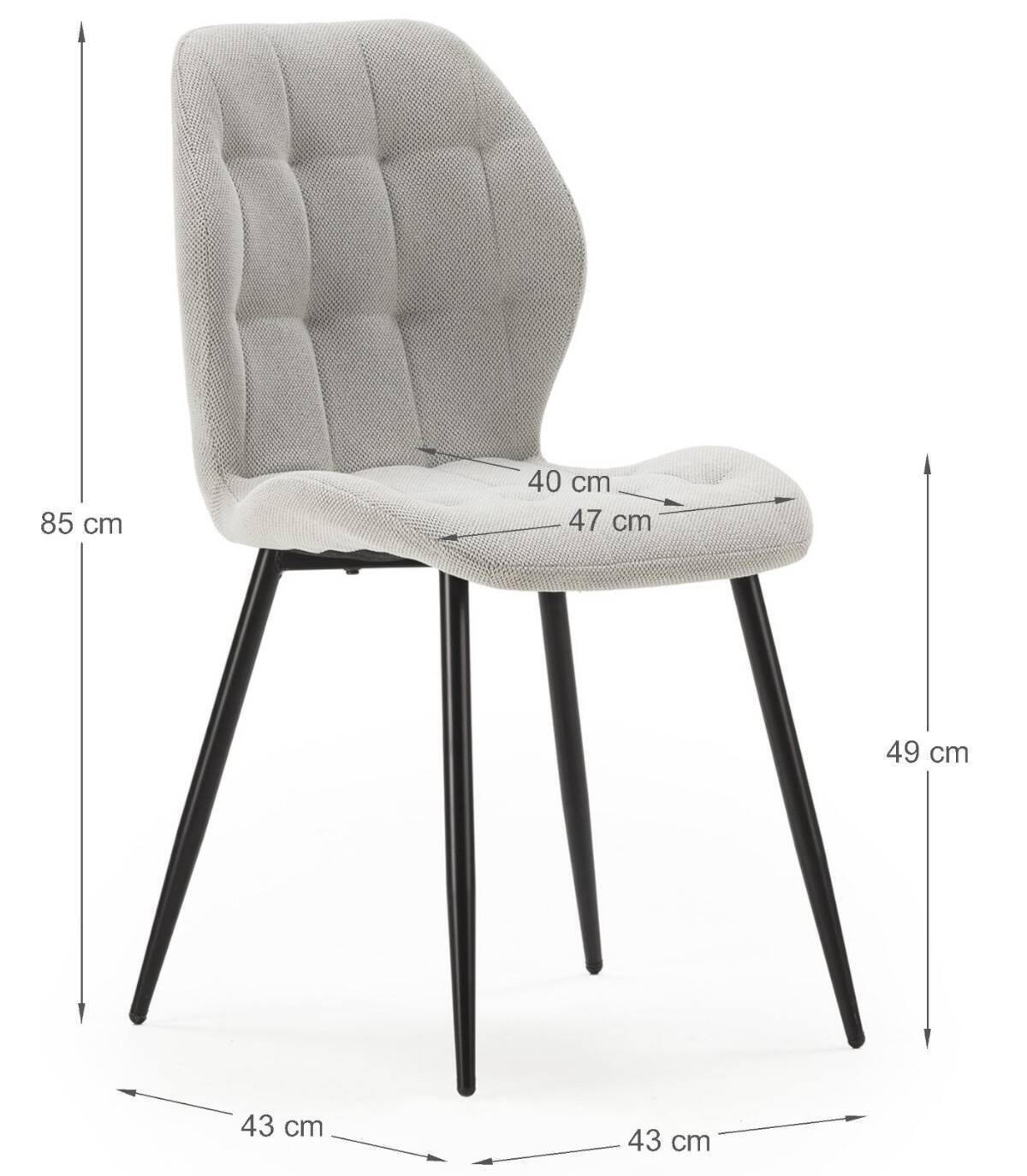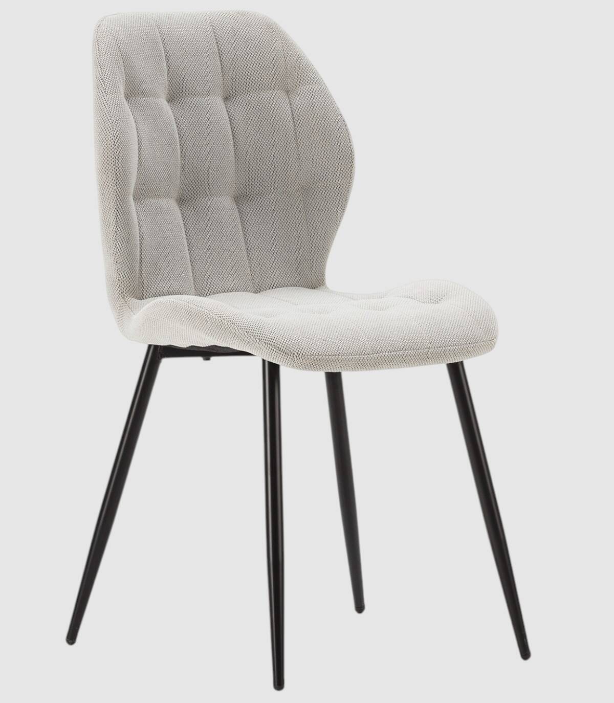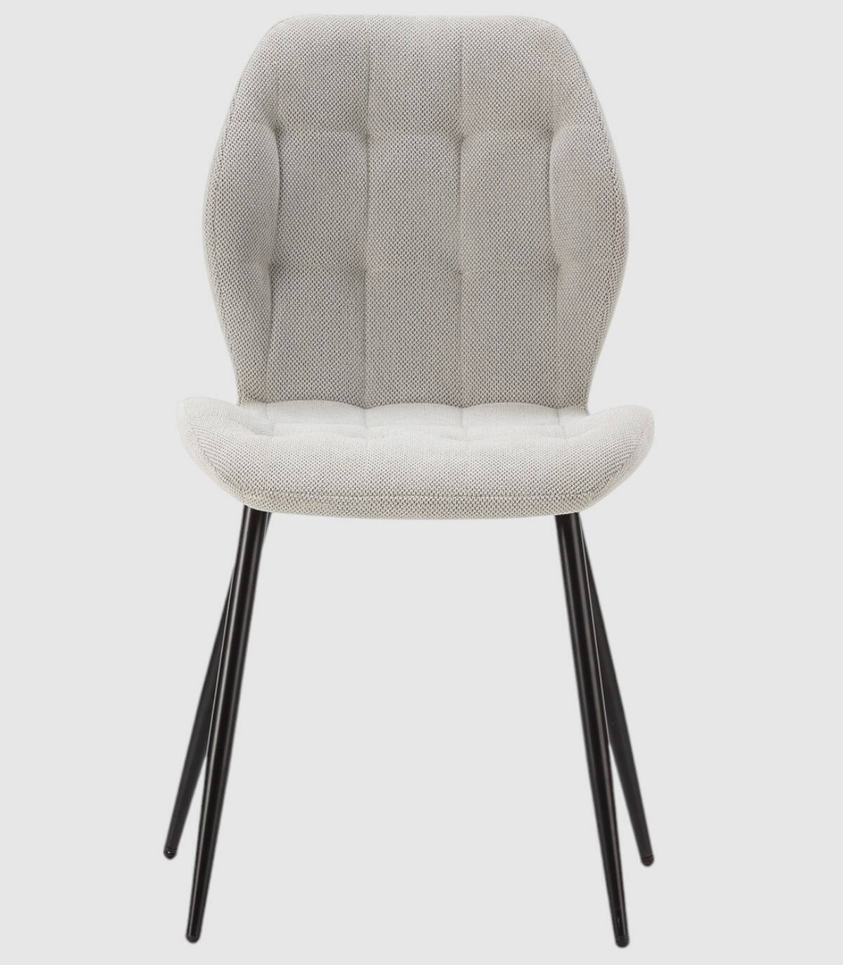 La silla Daine se compone de asiento y respaldo tapizado de color gris claro sobre estructura de metal con cuatro patas de color negro.