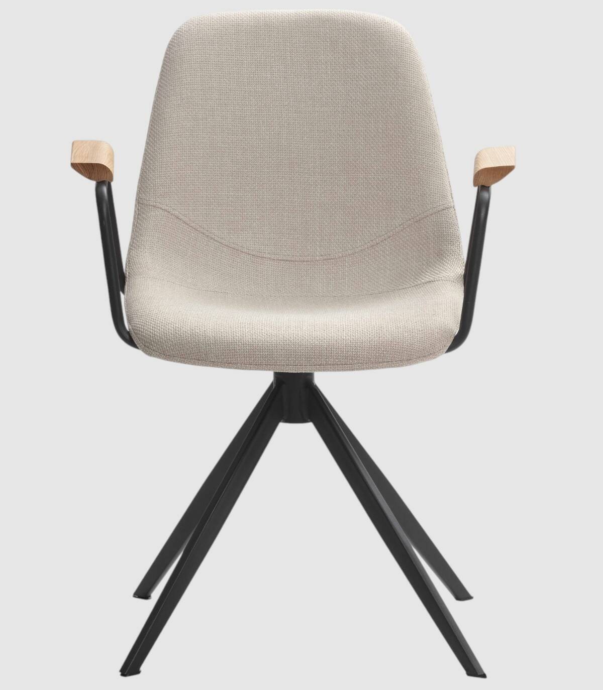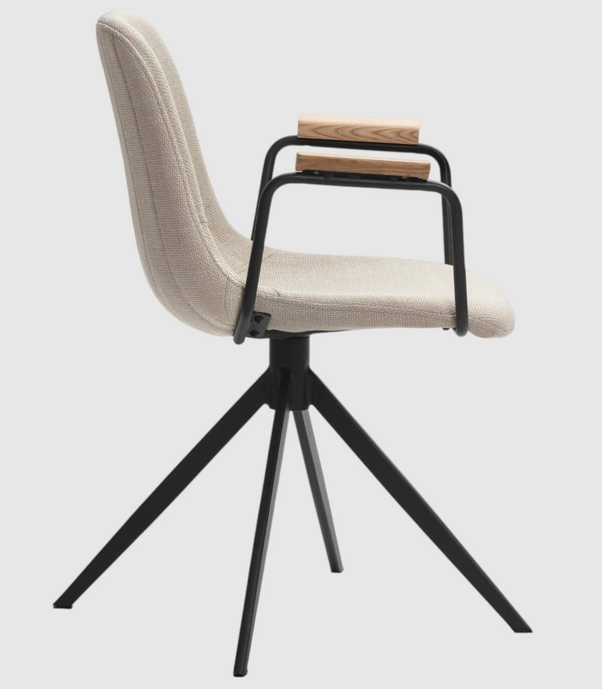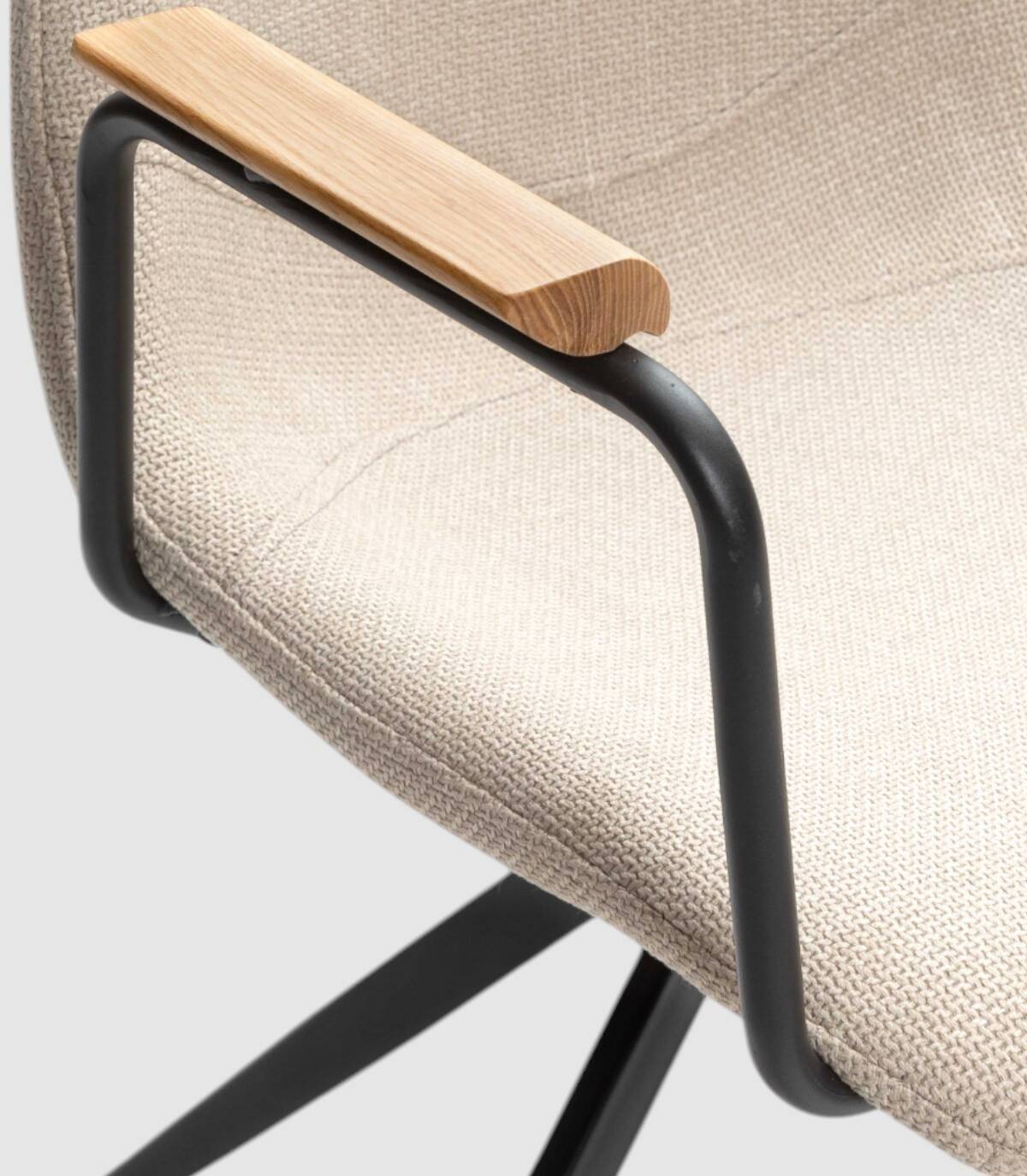 El sillón Jingey se compone de asiento y respaldo tapizado de color beige, con reposabrazos de metal negro y madera, sobre estructura giratoria de metal con cuatro patas de color negro.