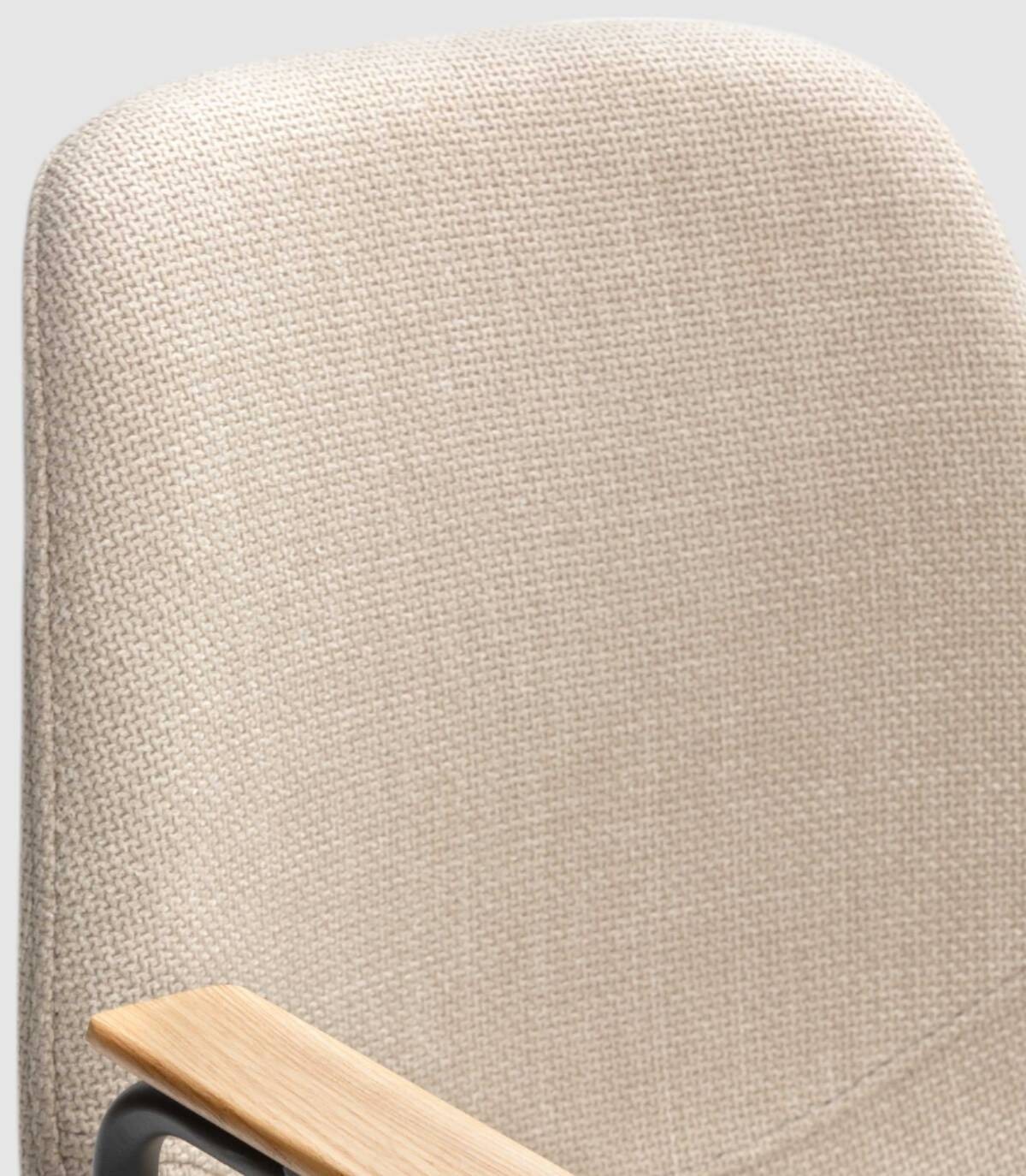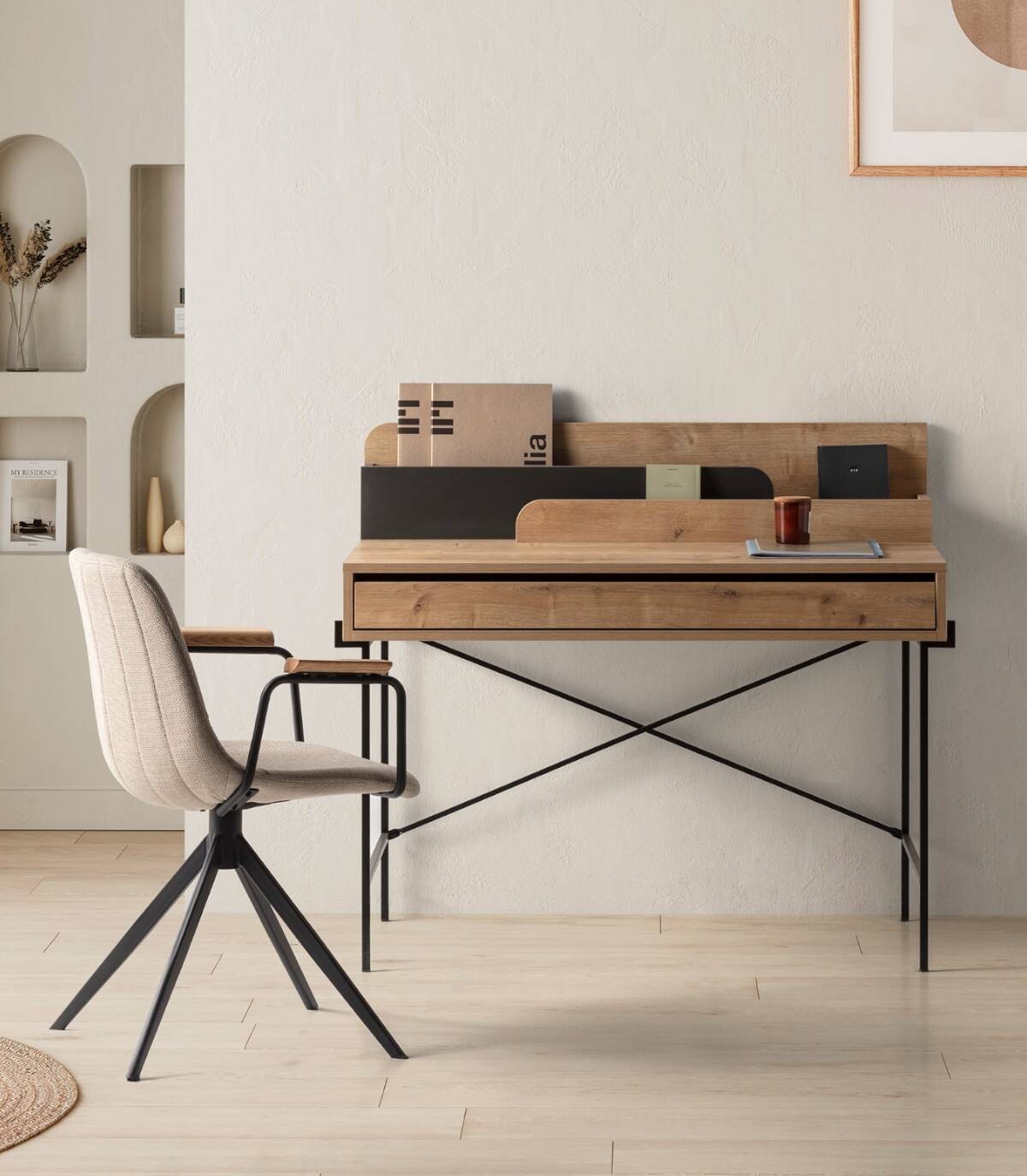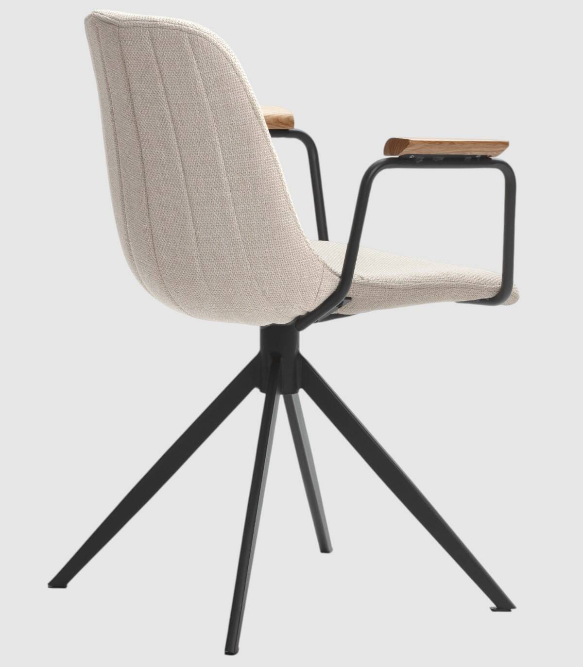El sillón Jingey se compone de asiento y respaldo tapizado de color beige, con reposabrazos de metal negro y madera, sobre estructura giratoria de metal con cuatro patas de color negro.