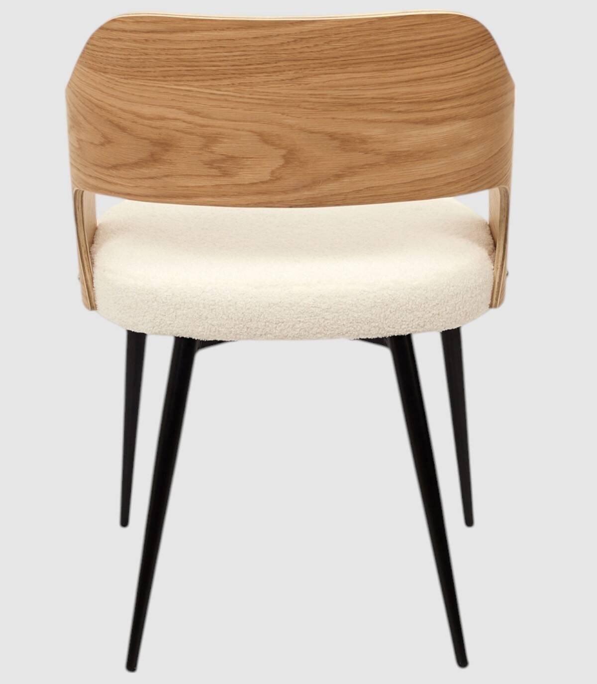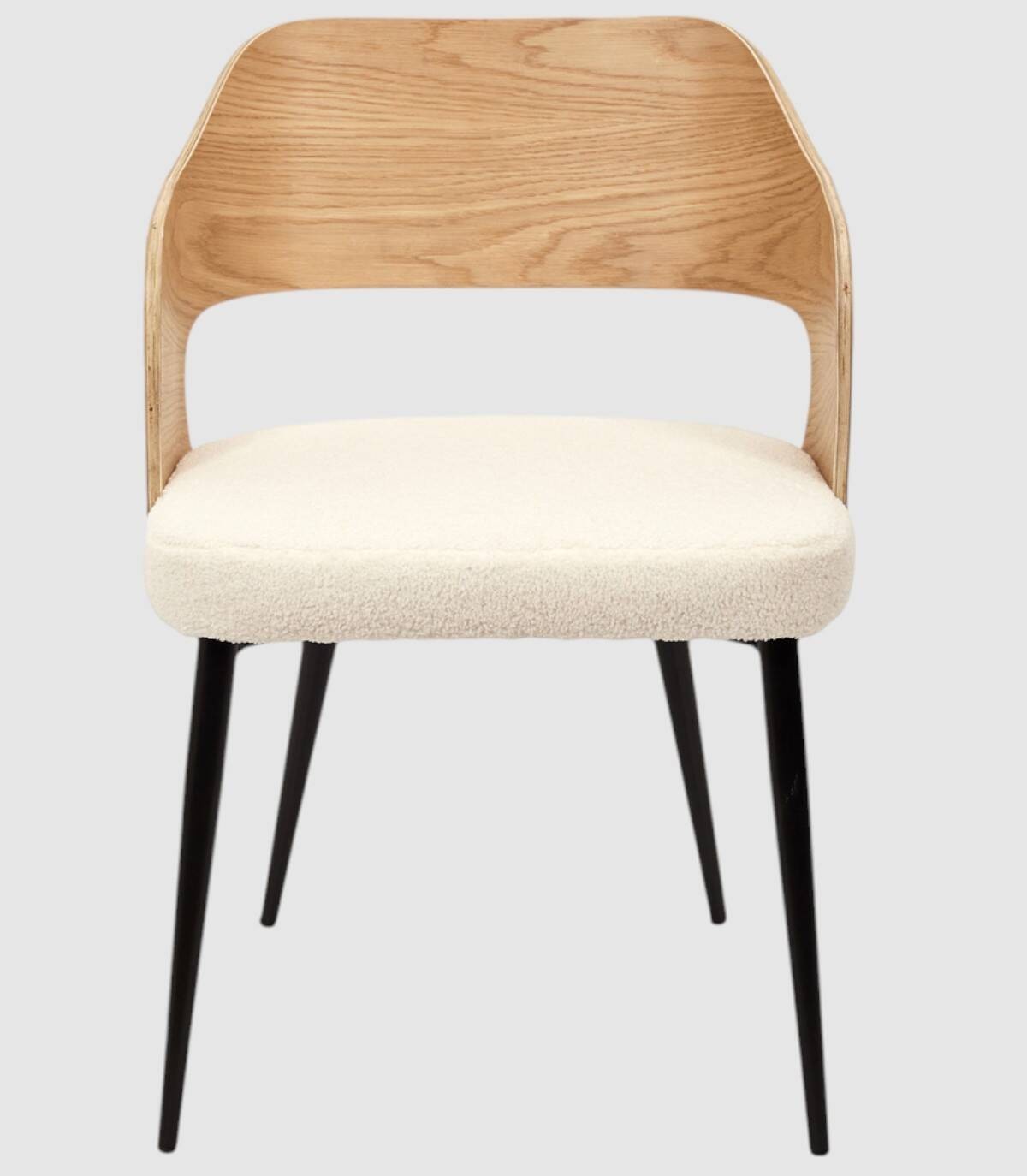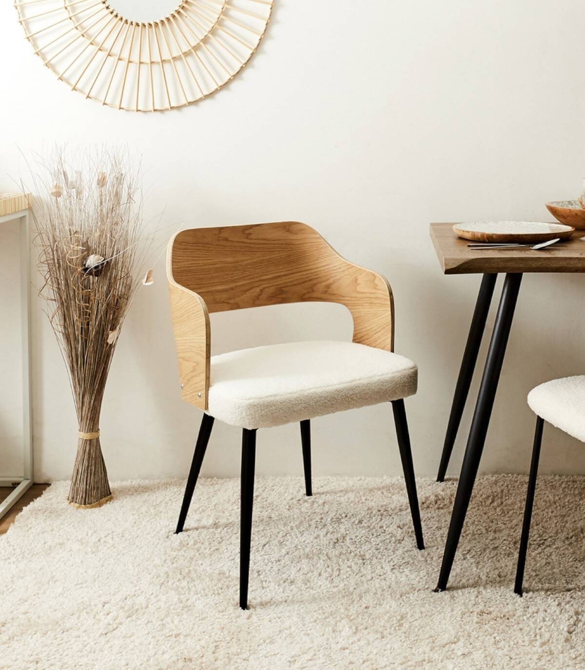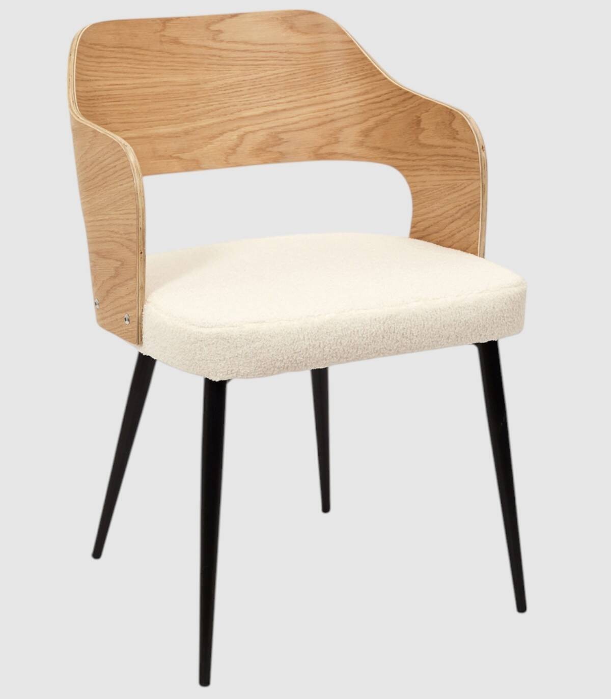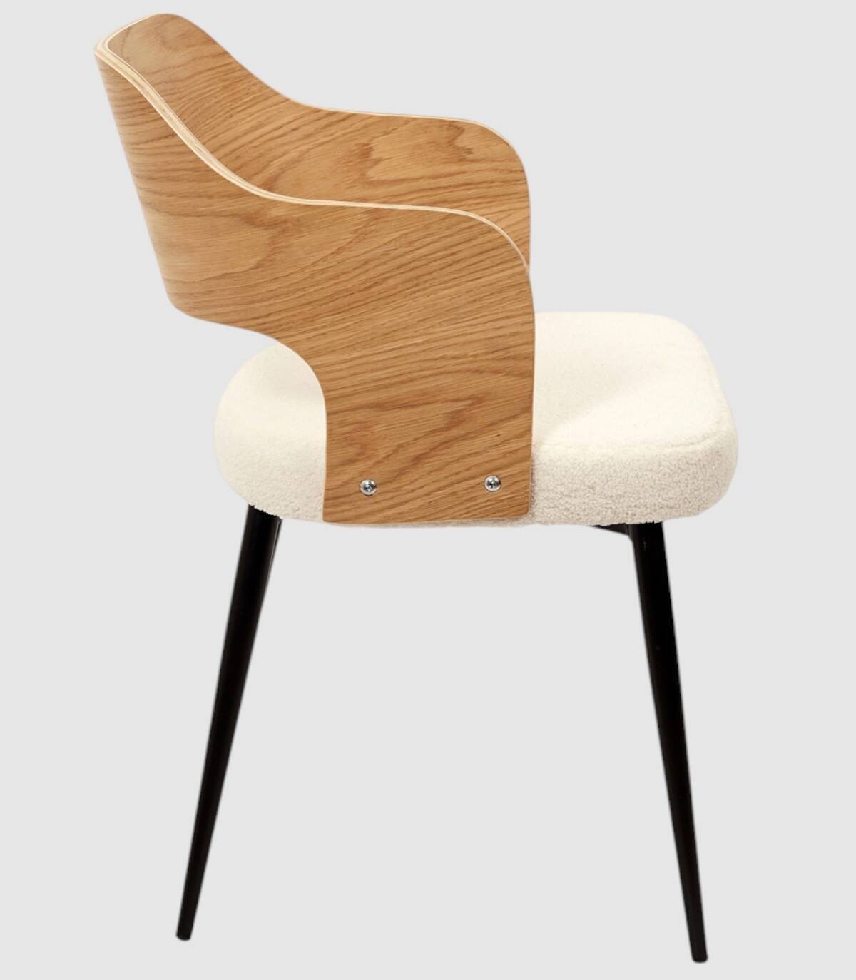 El sillón Loki se compone de asiento tapizado en poliéster de aspecto de borreguito de color blanco relleno de poliuretano, respaldo y reposabrazos de madera contrachapada de color natural, estructura y cuatro patas de hierro de color negro.