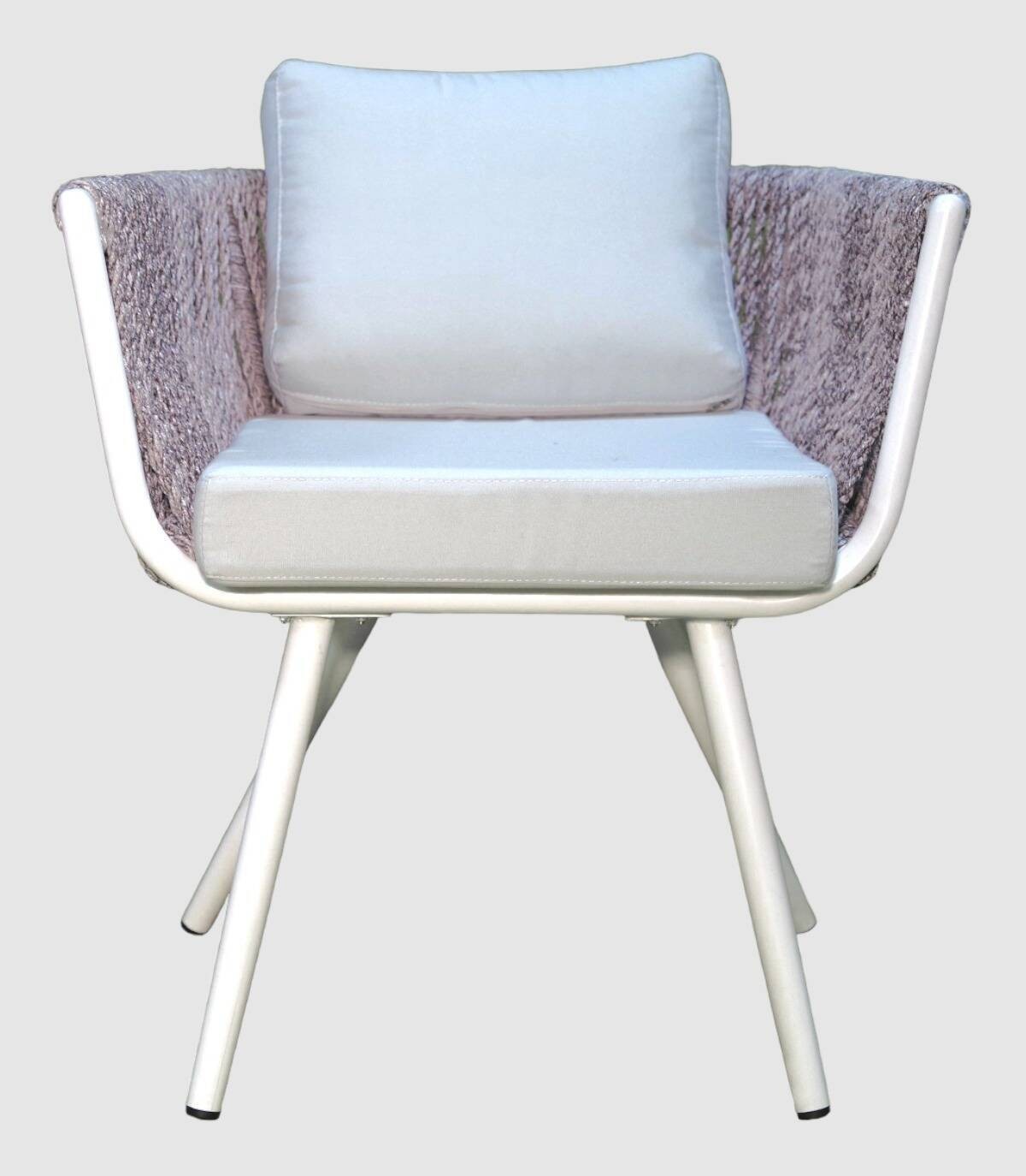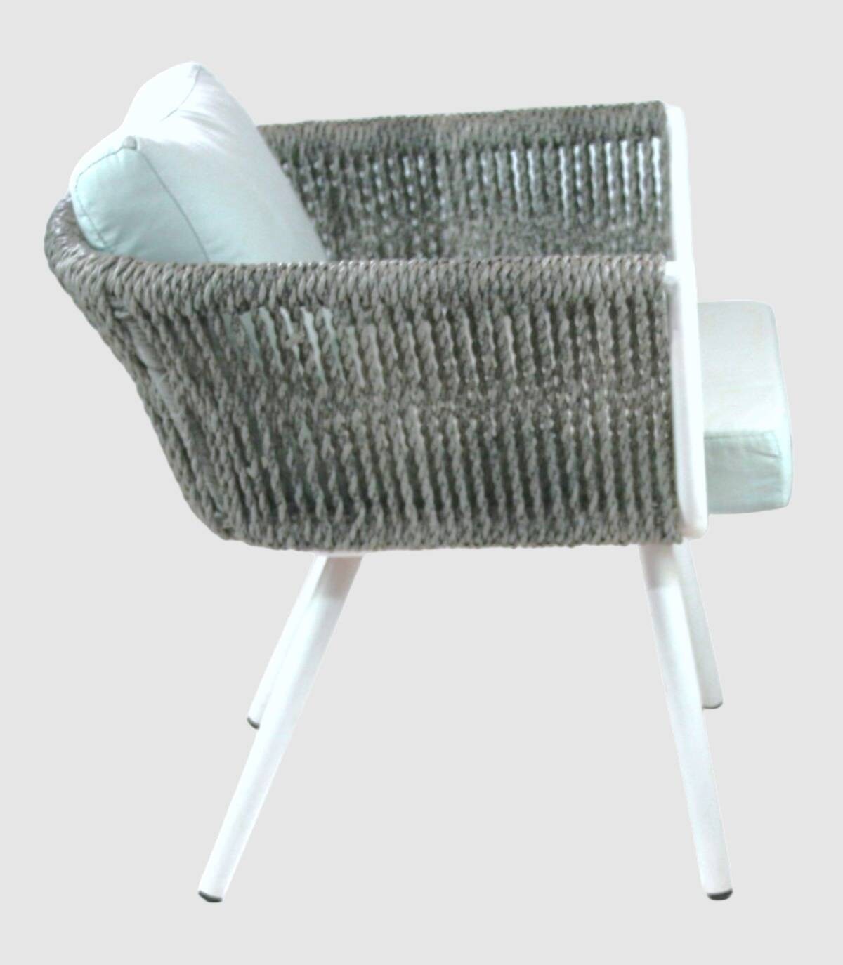 Read moreShow lessIt has a structure made of white aluminum treated with anti-UV and mass-dyed with a synthetic gray rope-style backrest in recyclable resin with a fiberglass effect and textilene cushions. All legs have non-slip caps, includes gray cushions.