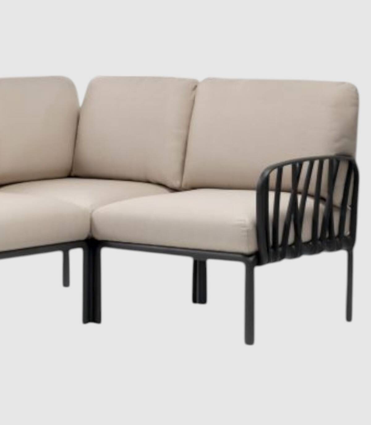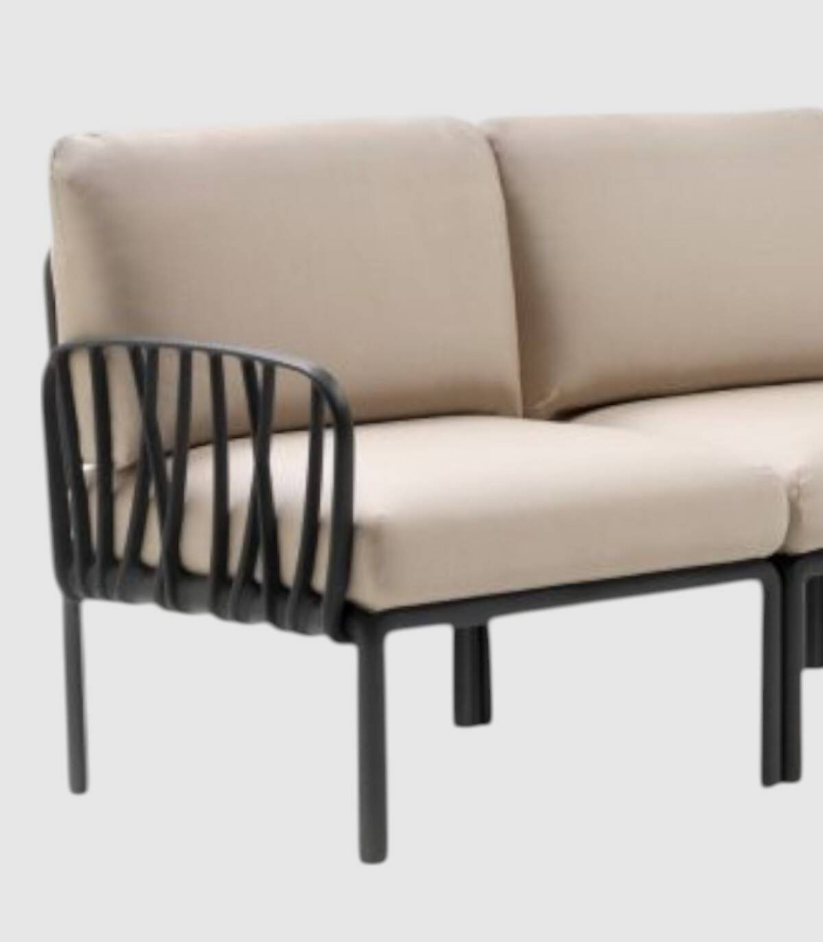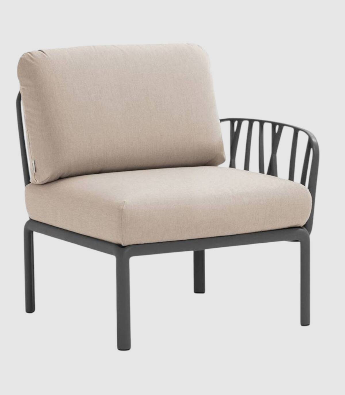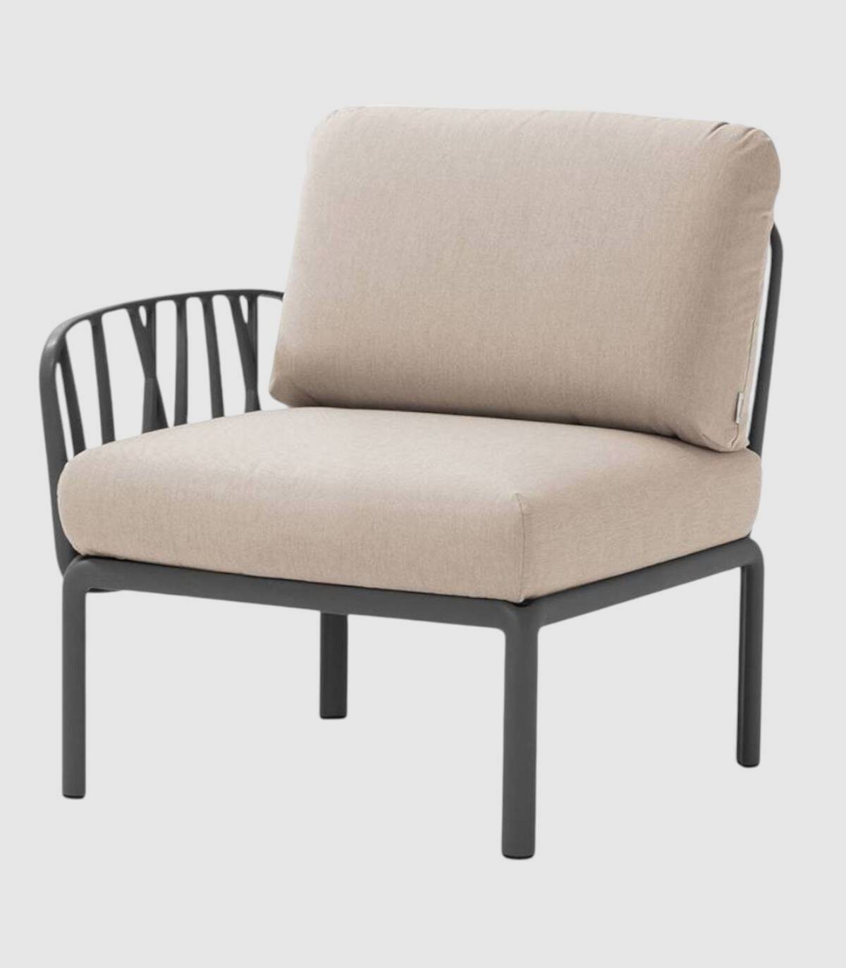 El elemento terminal del sofá modular Komodo se compone de un respaldo, un reposabrazos (acoplables a cualquier lado del asiento) y un asiento fabricado en polipropileno tratado anti-UV y teñido en masa, resina reciclable de fibra de vidrio efecto mate con cuatro patas con tapones antideslizantes. Incluye cojines de asiento y respaldo.