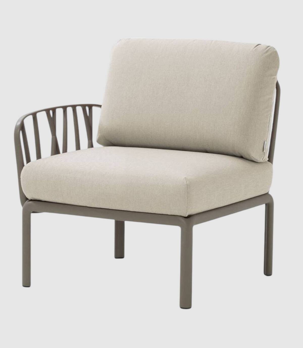 El elemento terminal del sofá modular Komodo se compone de un respaldo, un reposabrazos (acoplables a cualquier lado del asiento) y un asiento fabricado en polipropileno tratado anti-UV y teñido en masa, resina reciclable de fibra de vidrio efecto mate con cuatro patas con tapones antideslizantes. Incluye cojines de asiento y respaldo.