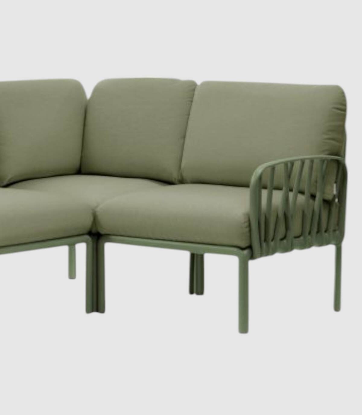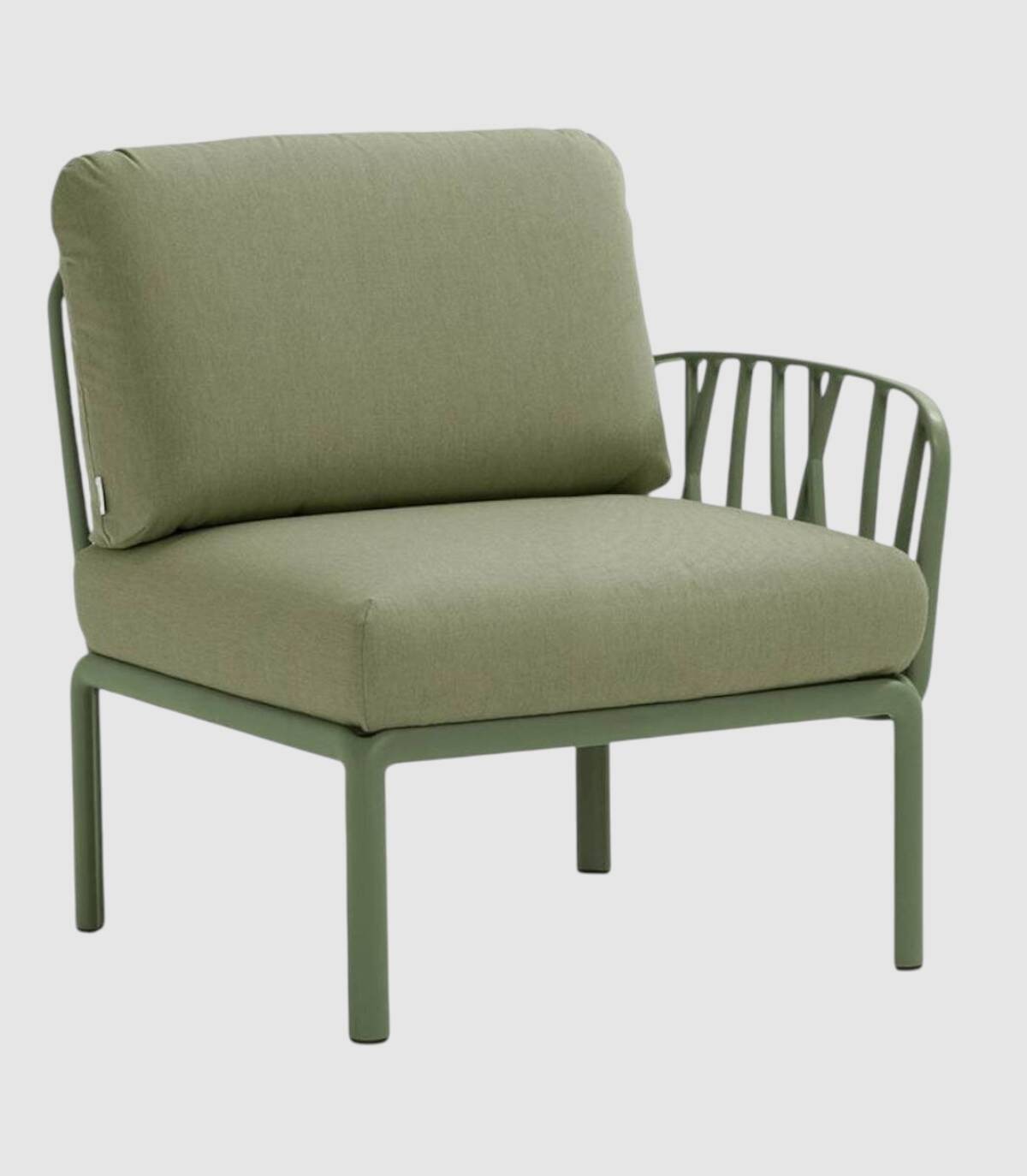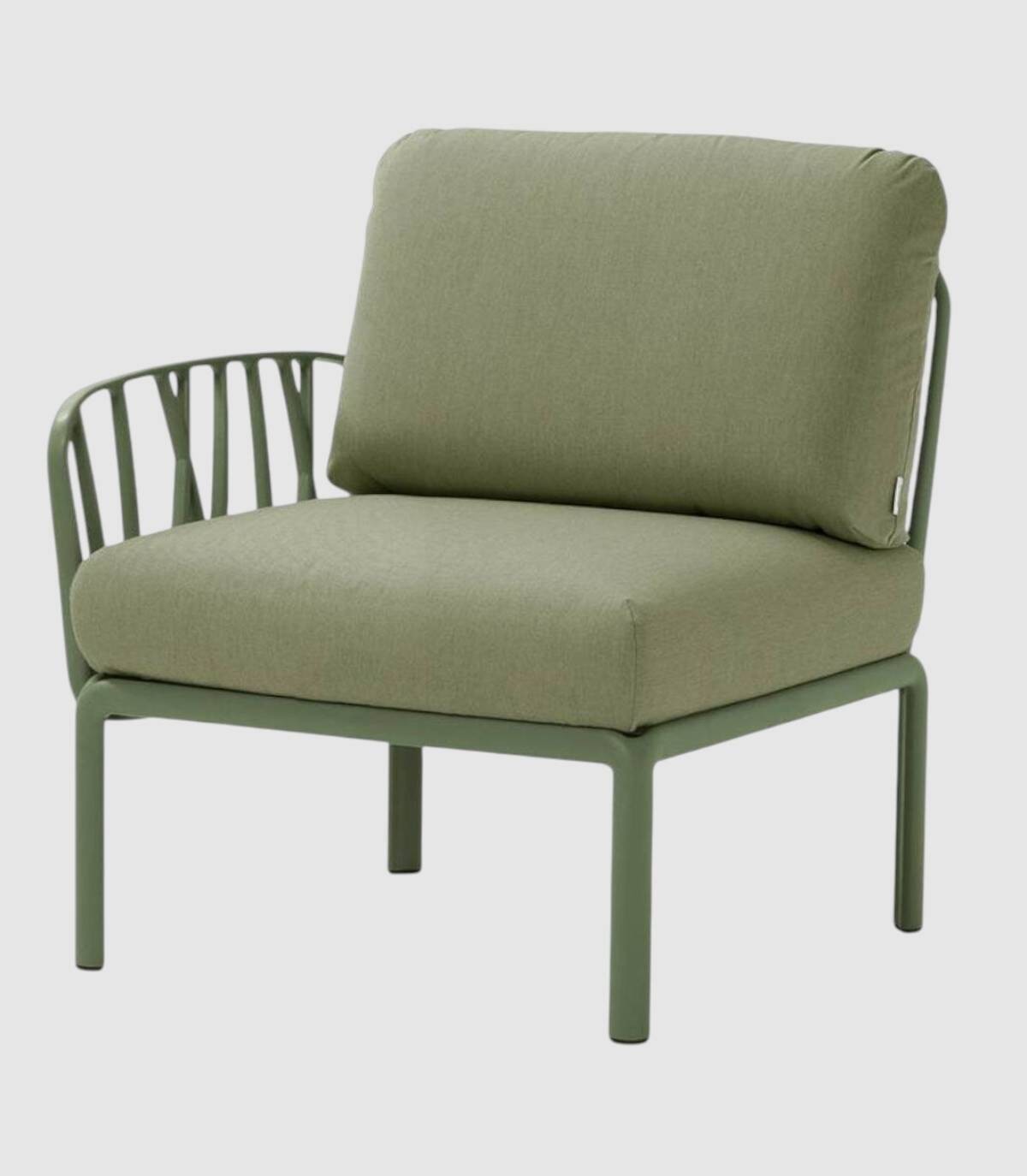El elemento terminal del sofá modular Komodo se compone de un respaldo, un reposabrazos (acoplables a cualquier lado del asiento) y un asiento fabricado en polipropileno tratado anti-UV y teñido en masa, resina reciclable de fibra de vidrio efecto mate con cuatro patas con tapones antideslizantes. Incluye cojines de asiento y respaldo.