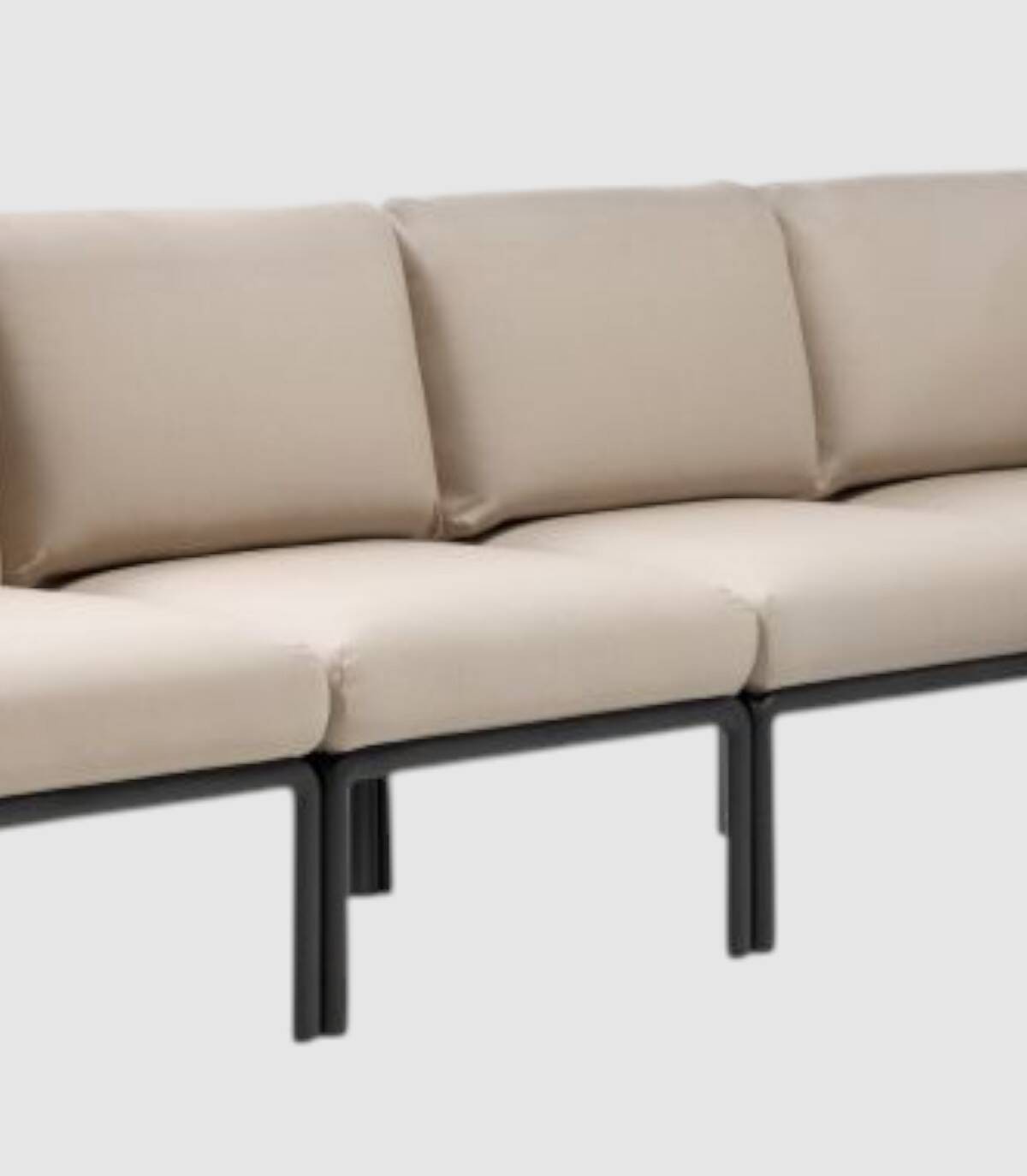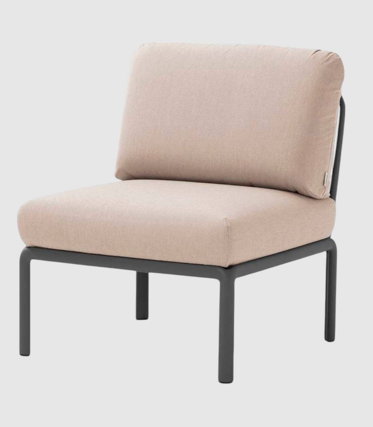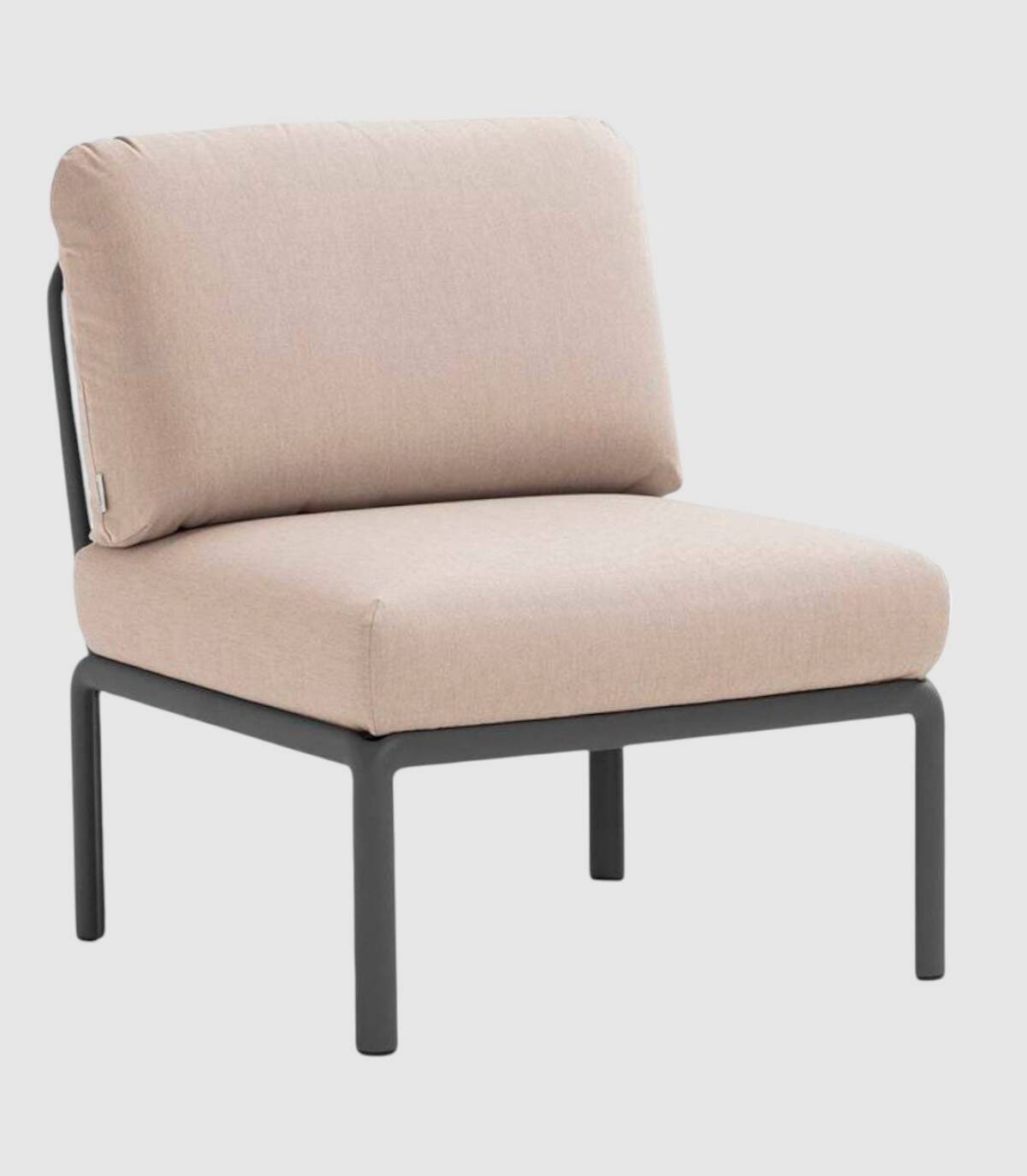 El elemento central del sofá modular Komodo se compone de un respaldo, (acoplable a cualquier lado del asiento) y un asiento fabricado en polipropileno tratado anti-UV y teñido en masa, resina reciclable de fibra de vidrio efecto mate con cuatro patas con tapones antideslizantes. Incluye cojines de asiento y respaldo.