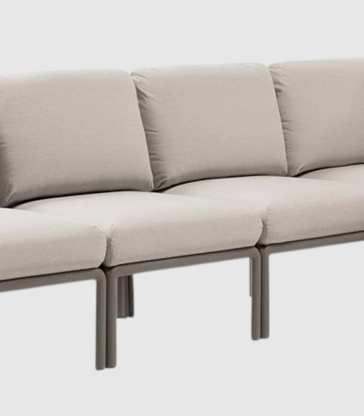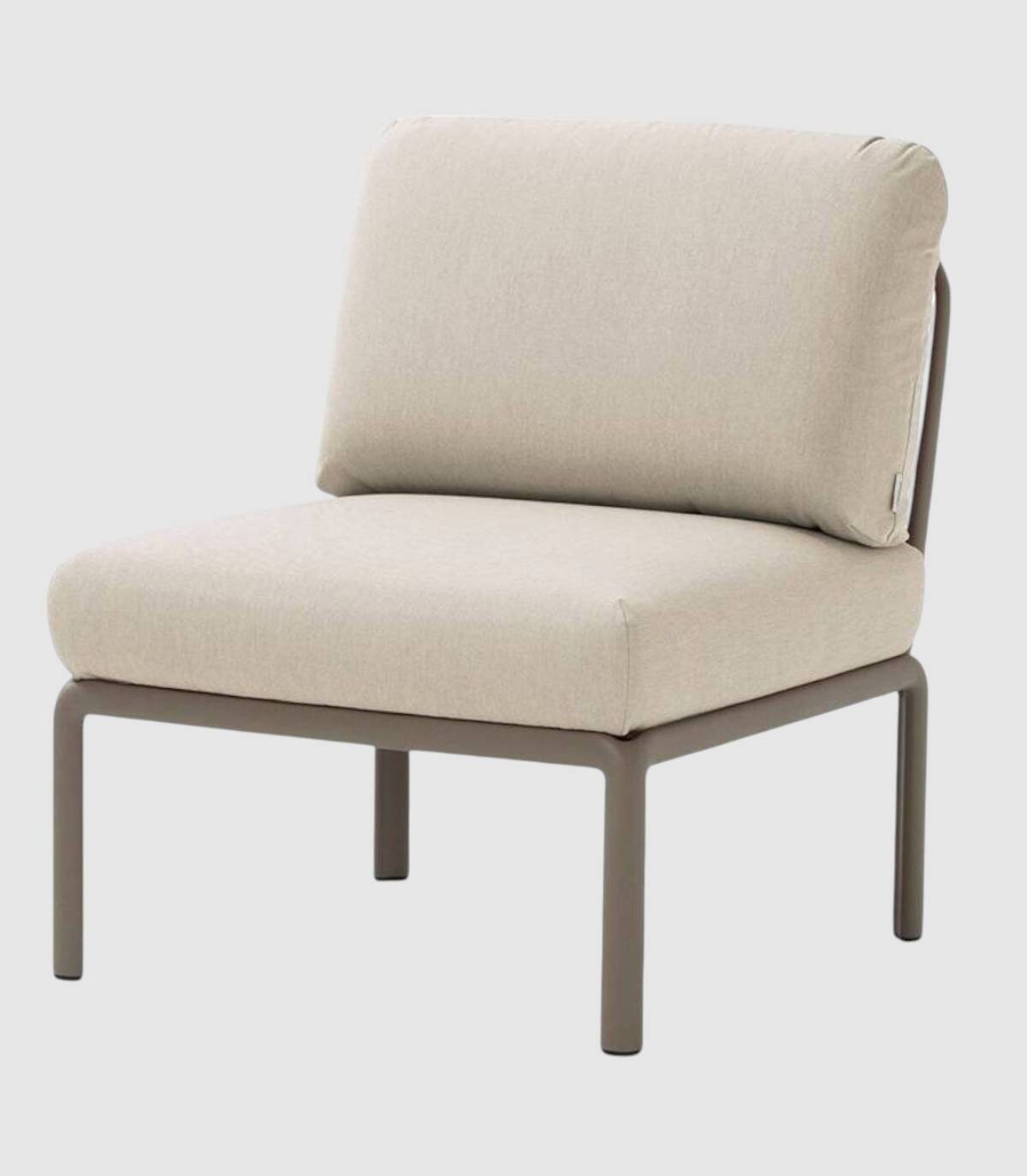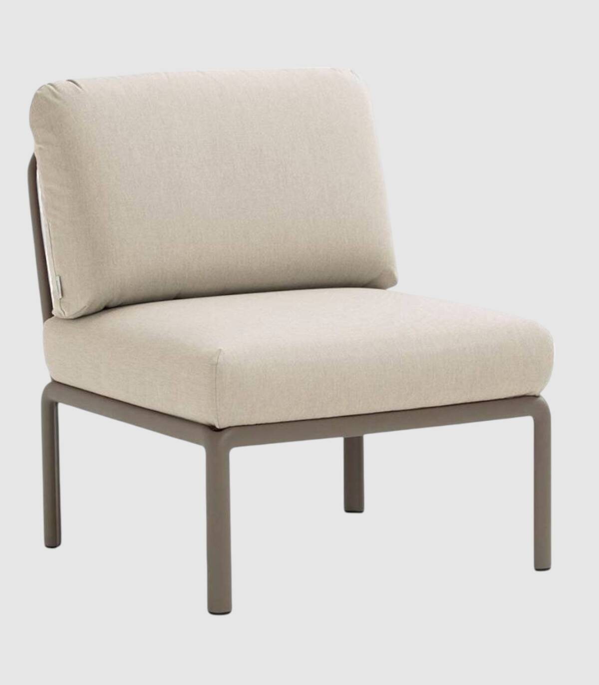 El elemento central del sofá modular Komodo se compone de un respaldo, (acoplable a cualquier lado del asiento) y un asiento fabricado en polipropileno tratado anti-UV y teñido en masa, resina reciclable de fibra de vidrio efecto mate con cuatro patas con tapones antideslizantes. Incluye cojines de asiento y respaldo.