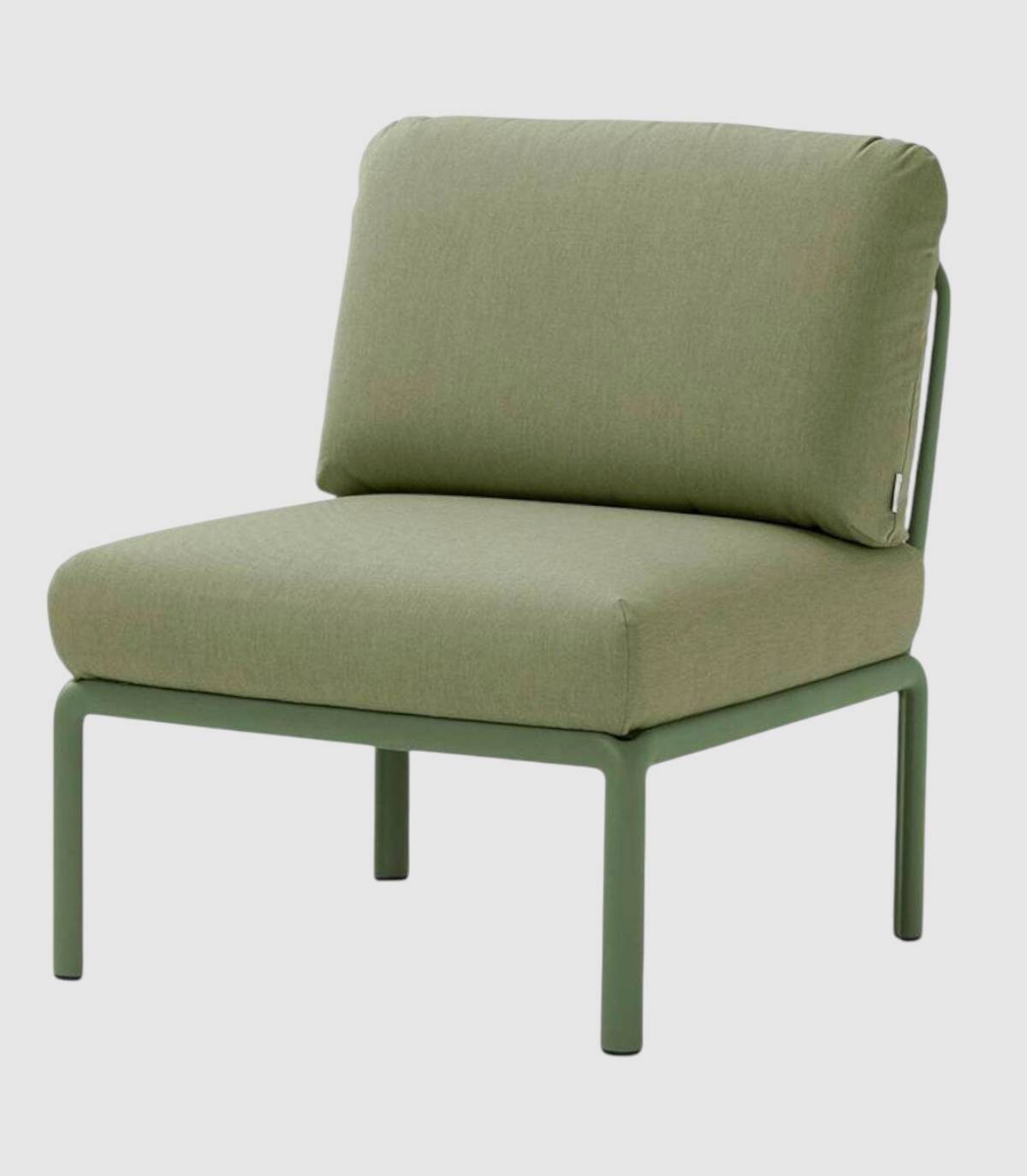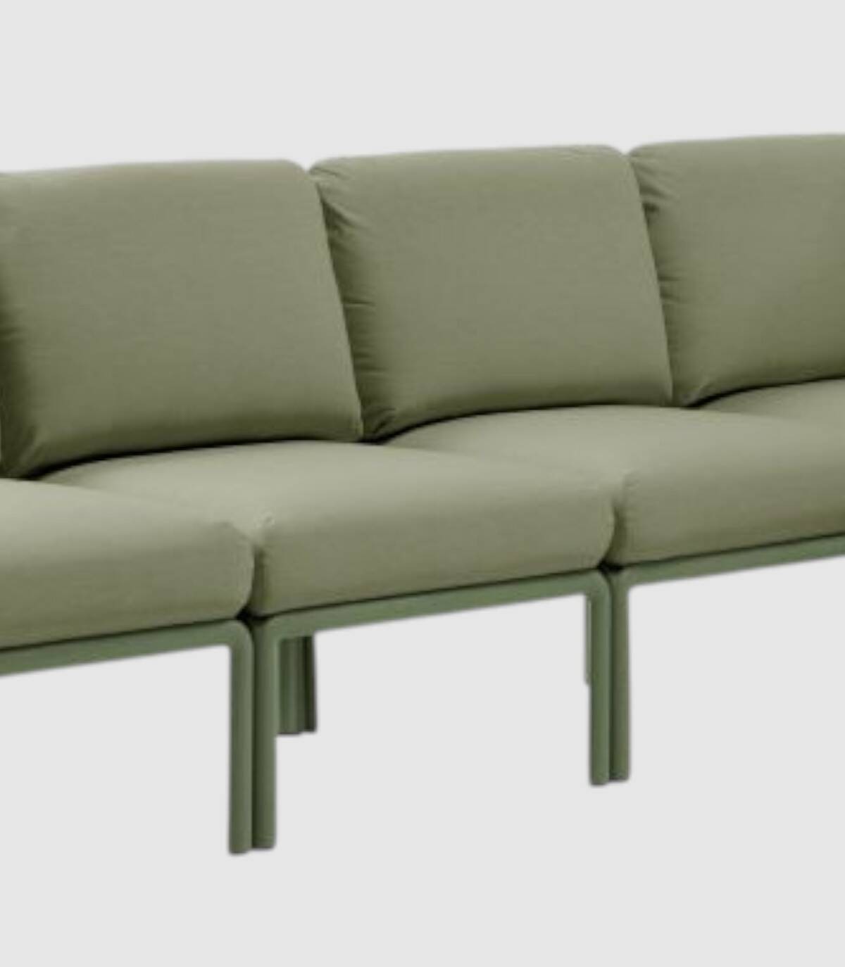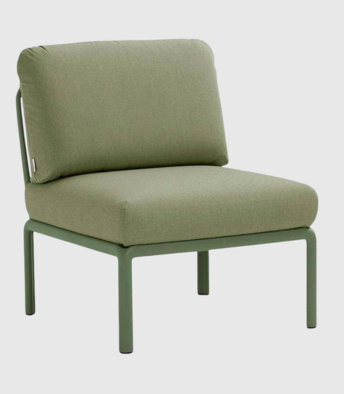 El elemento central del sofá modular Komodo se compone de un respaldo, (acoplable a cualquier lado del asiento) y un asiento fabricado en polipropileno tratado anti-UV y teñido en masa, resina reciclable de fibra de vidrio efecto mate con cuatro patas con tapones antideslizantes. Incluye cojines de asiento y respaldo.