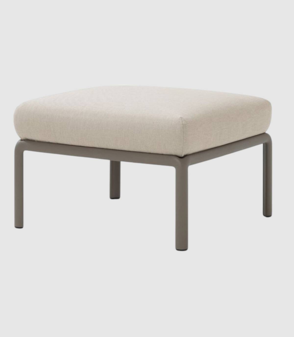 El puff del sofá modular Komodo se compone de un asiento fabricado en polipropileno tratado anti-UV y teñido en masa, resina reciclable de fibra de vidrio efecto mate con cuatro patas con tapones antideslizantes. Incluye cojín de asiento.