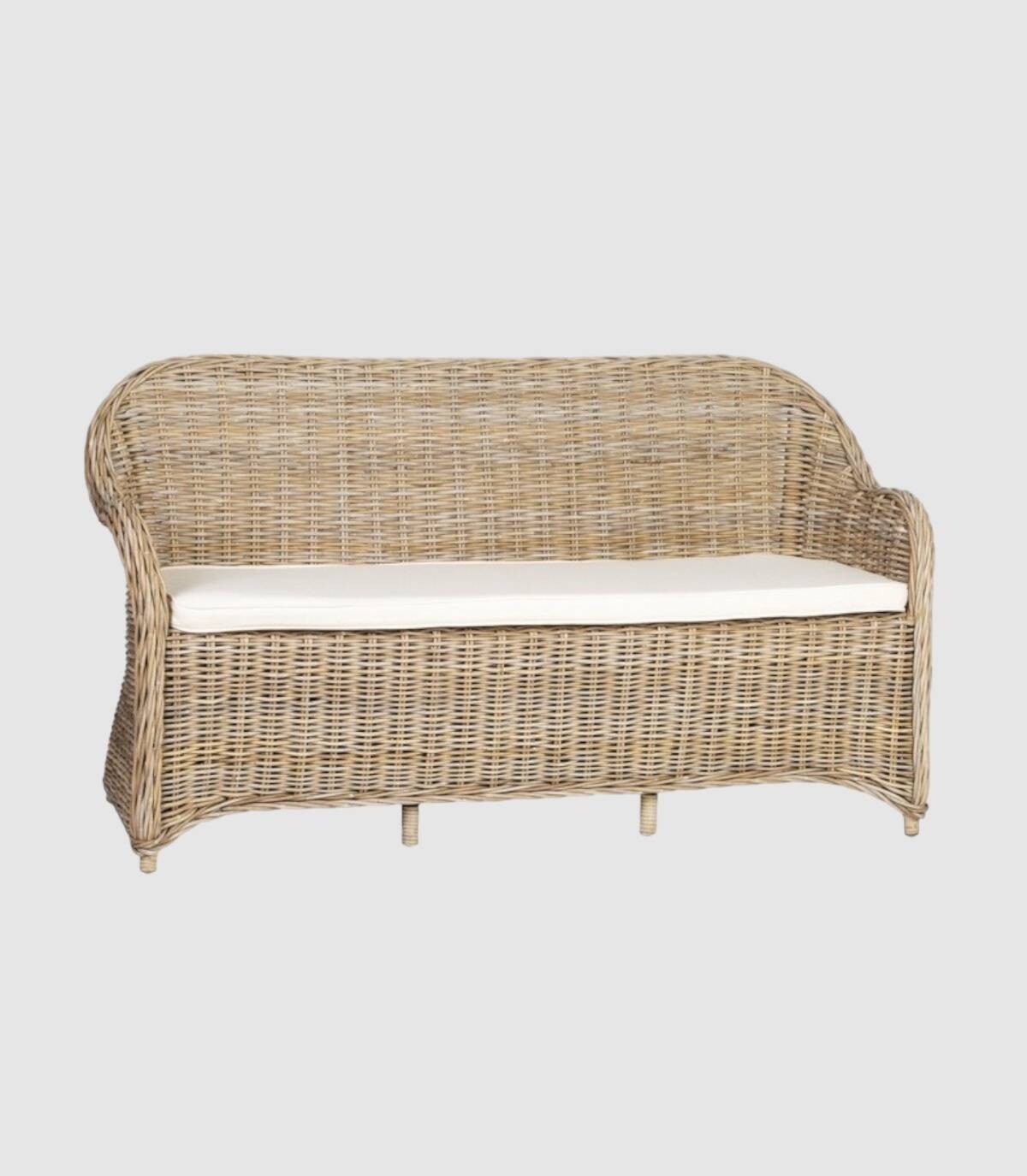 Read moreShow lessIt is made of a natural rattan weave with a rounded backrest and armrests. Includes white cushion.