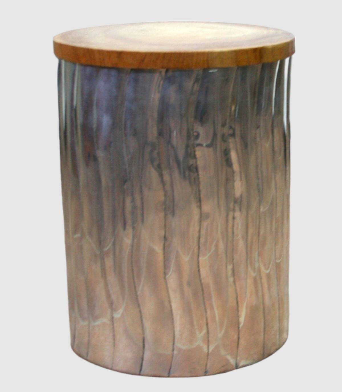 Este taburete cilindrico con superficie moldeada a rayas esta compuesto de aluminio. Tiene tapa de madera circular extraible. Es muy ligero y tiene espacio debajo ya que esta hueco.