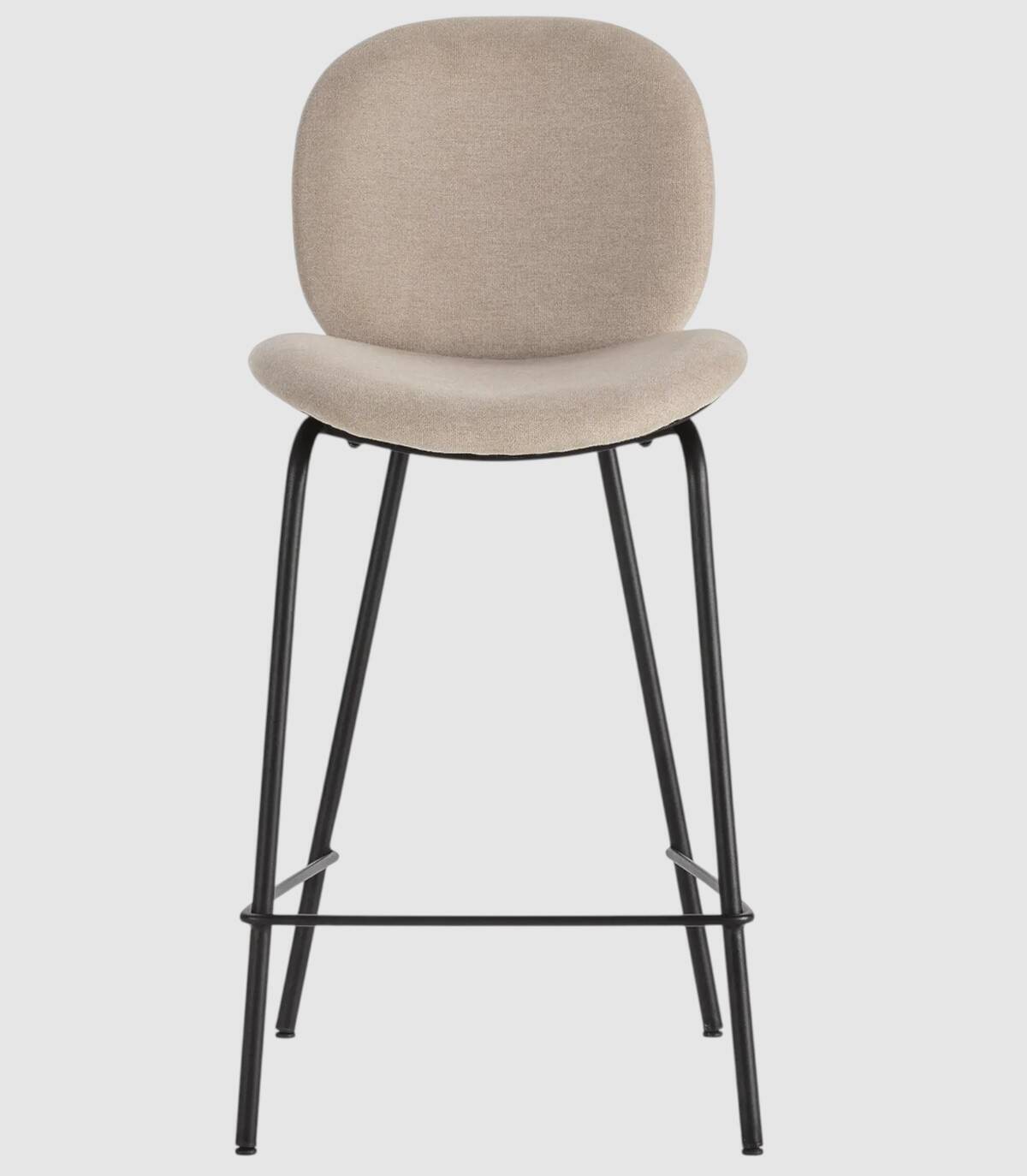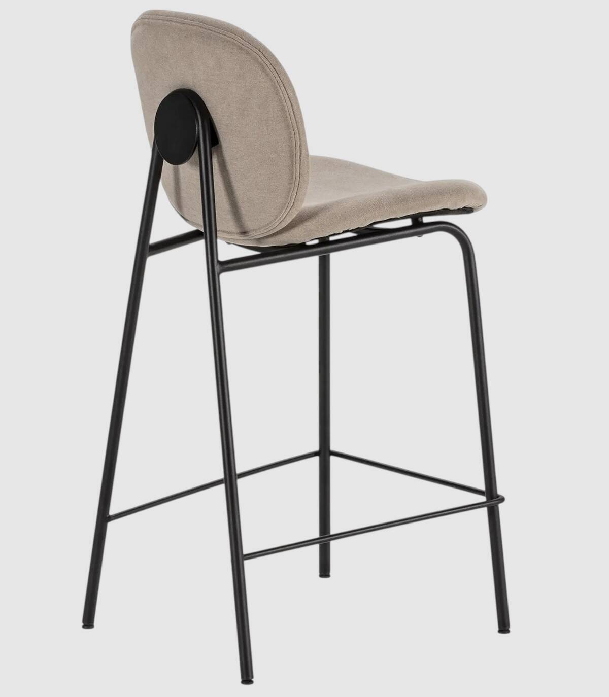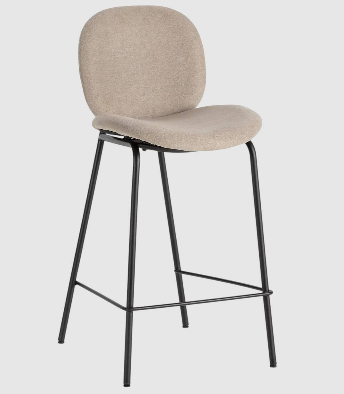 El taburete Zata se compone de asiento y respaldo tapizado de color beige sobre estructura de metal con reposapìes y cuatro patas pintado de color negro.
