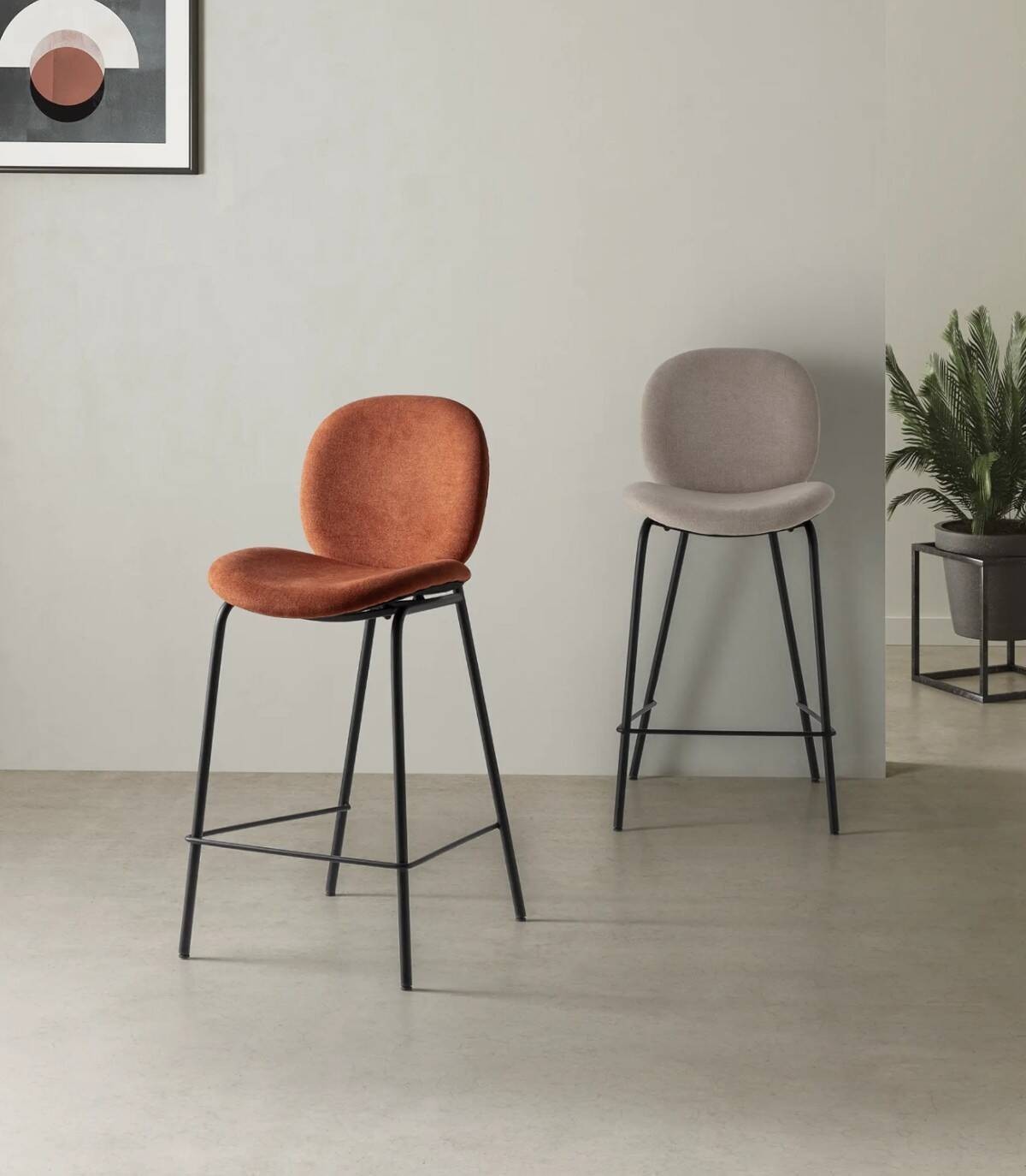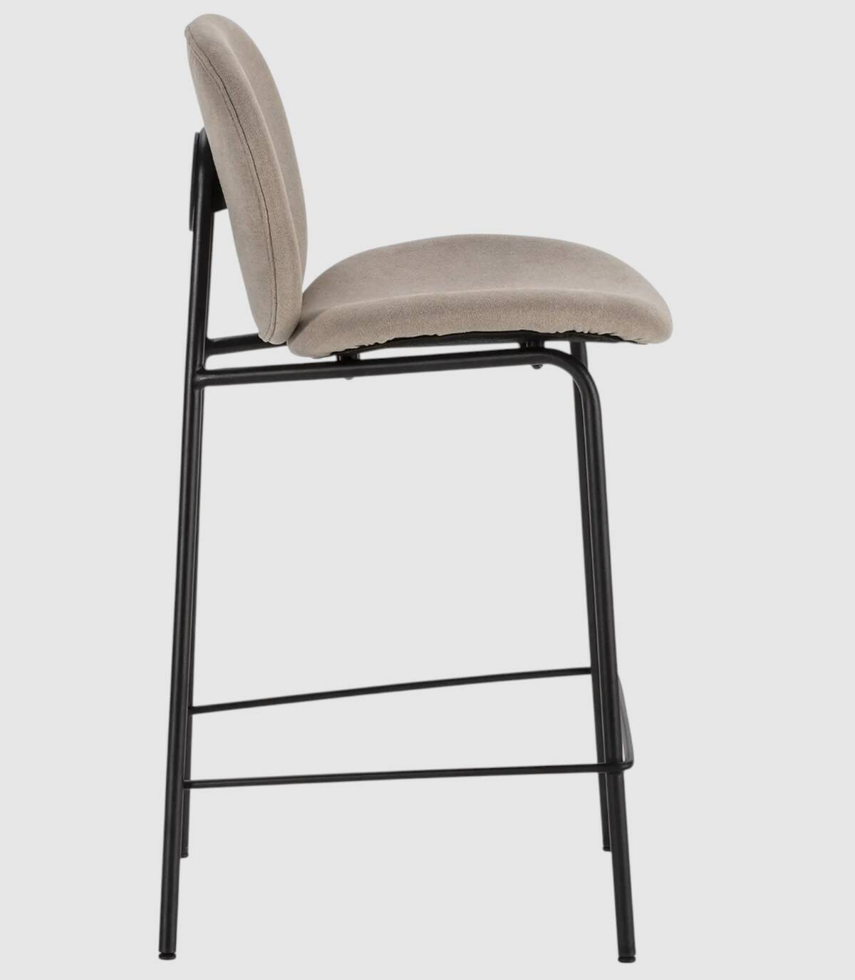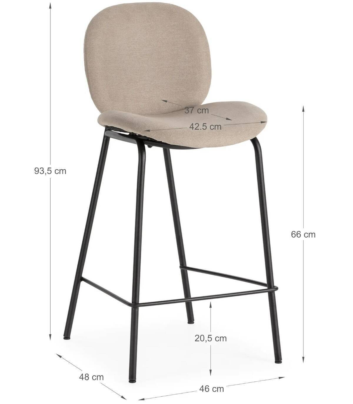 El taburete Zata se compone de asiento y respaldo tapizado de color beige sobre estructura de metal con reposapìes y cuatro patas pintado de color negro.
