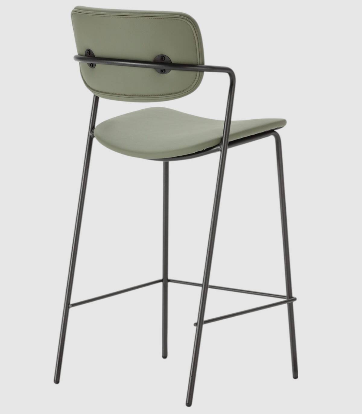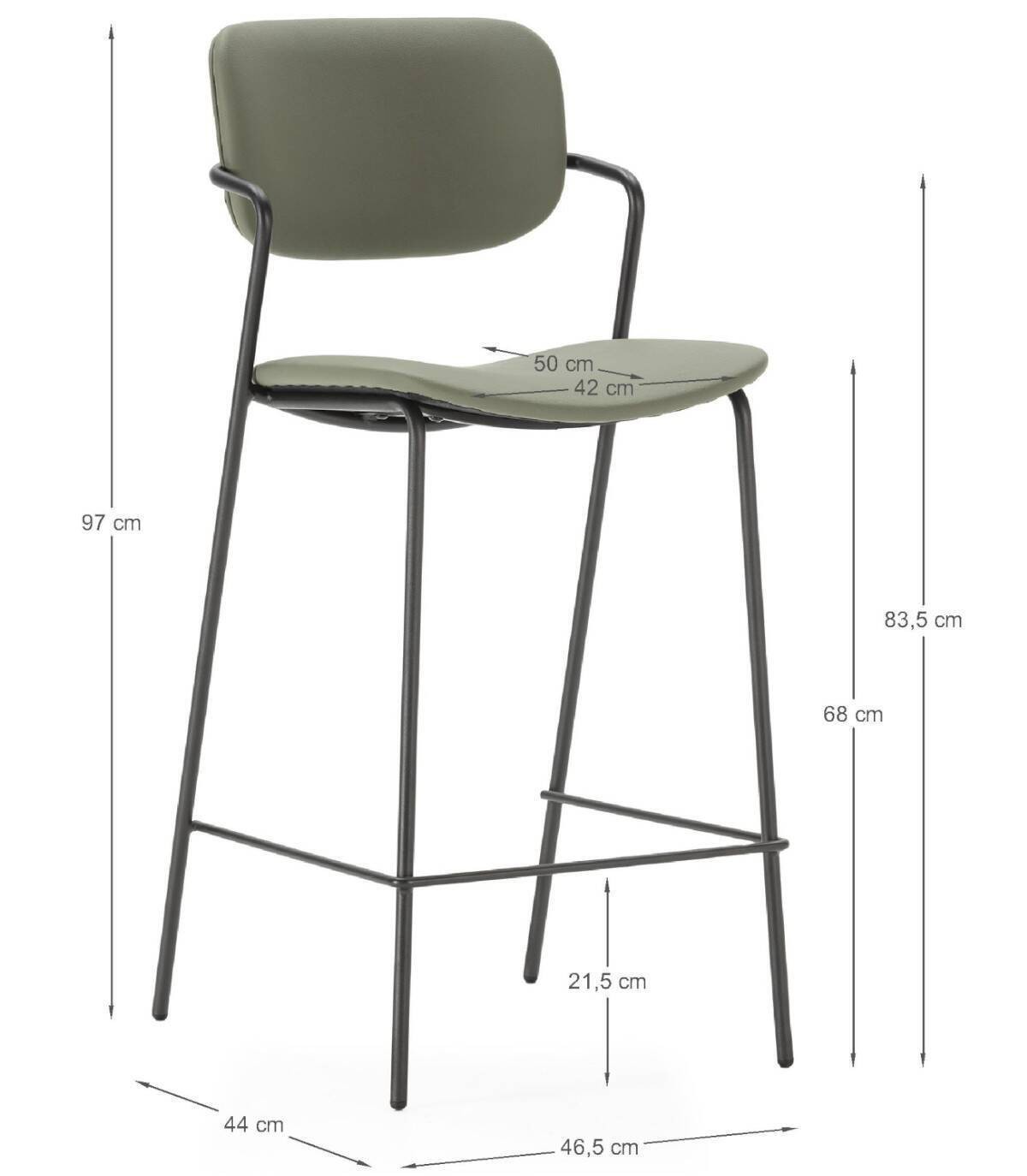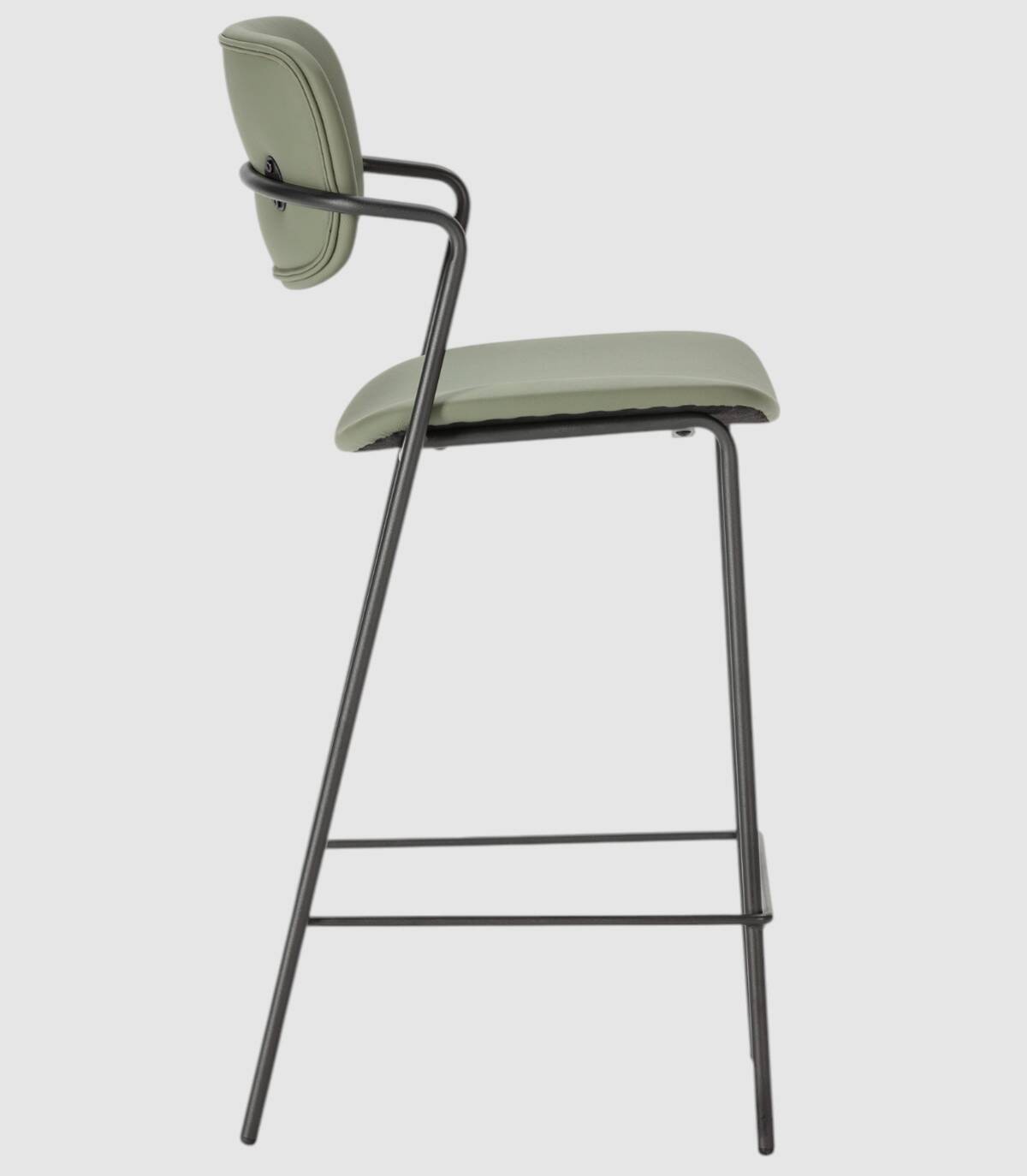 El taburete Zeany se compone de asiento y respaldo tapizados de color verde sobre estructura de metal con reposapies y cuatro patas de color negro.