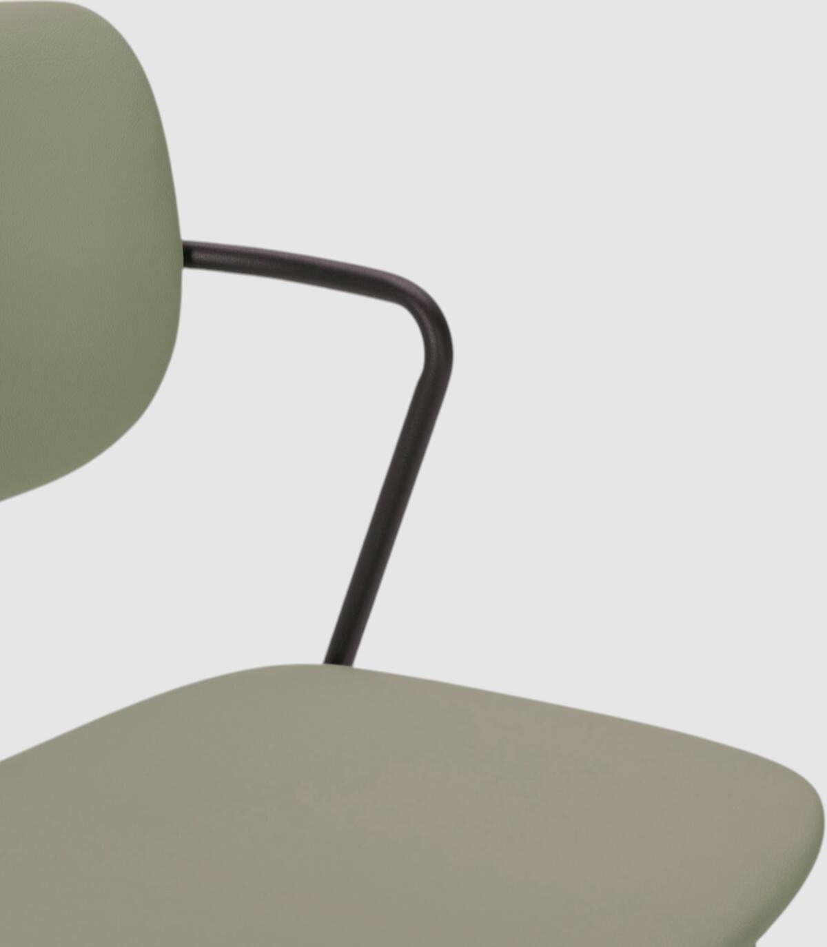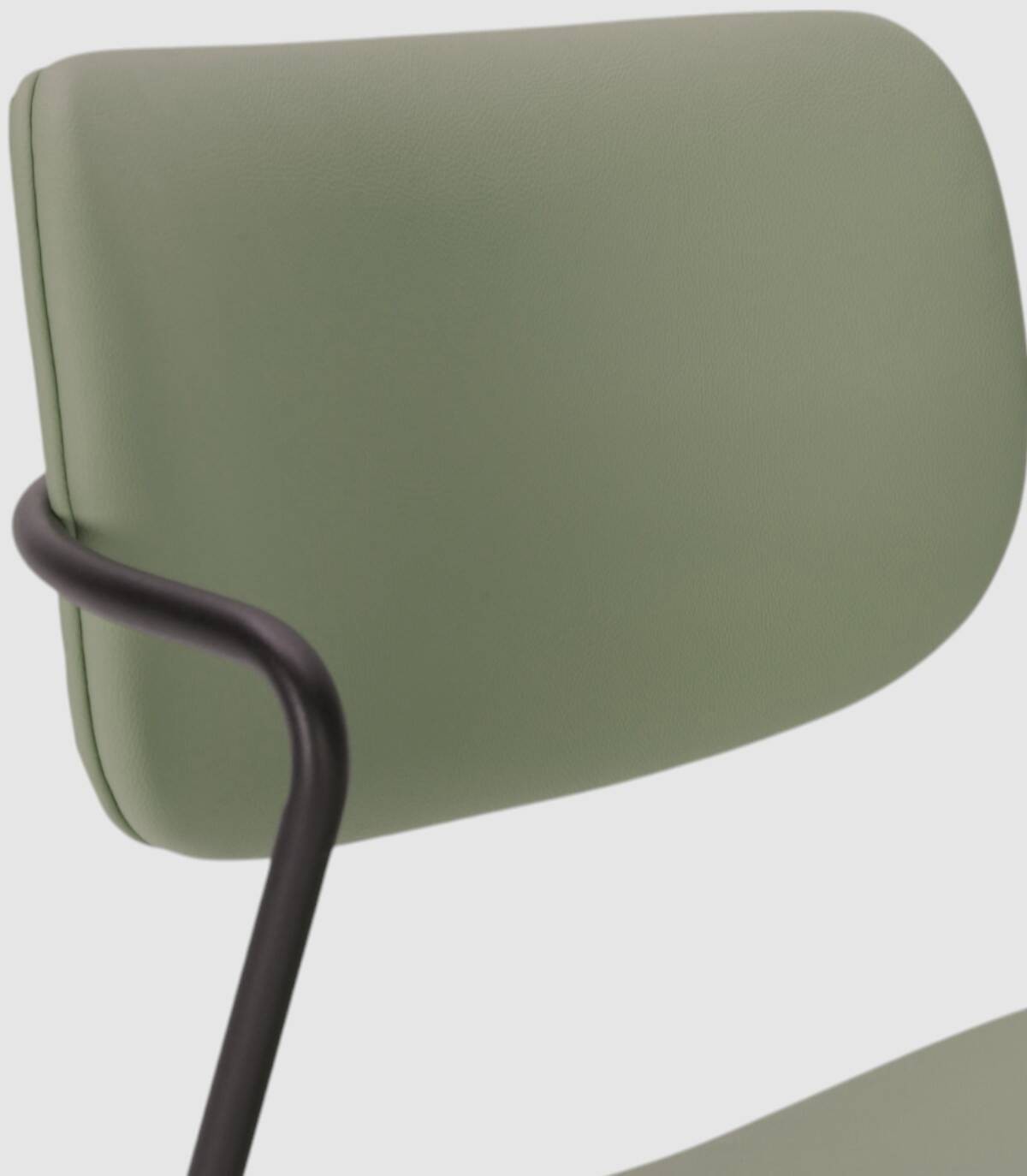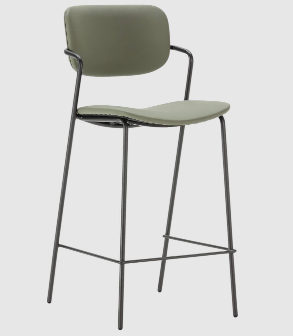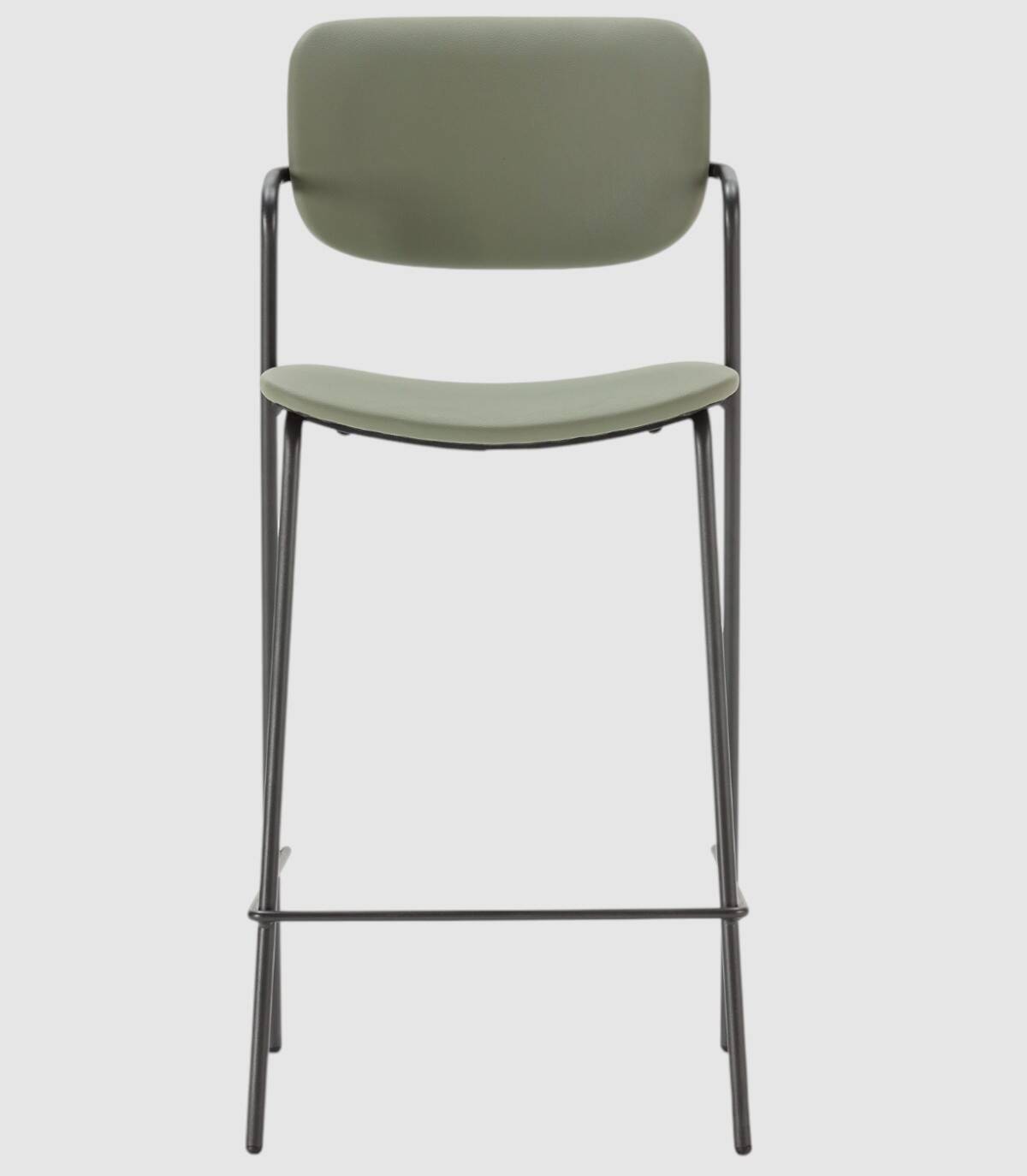 El taburete Zeany se compone de asiento y respaldo tapizados de color verde sobre estructura de metal con reposapies y cuatro patas de color negro.