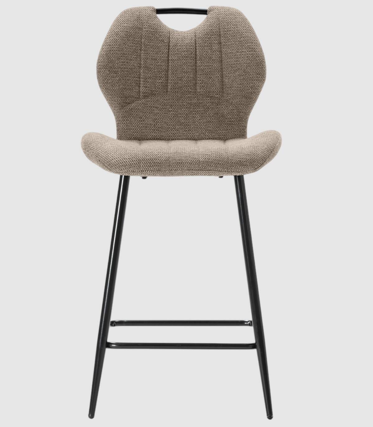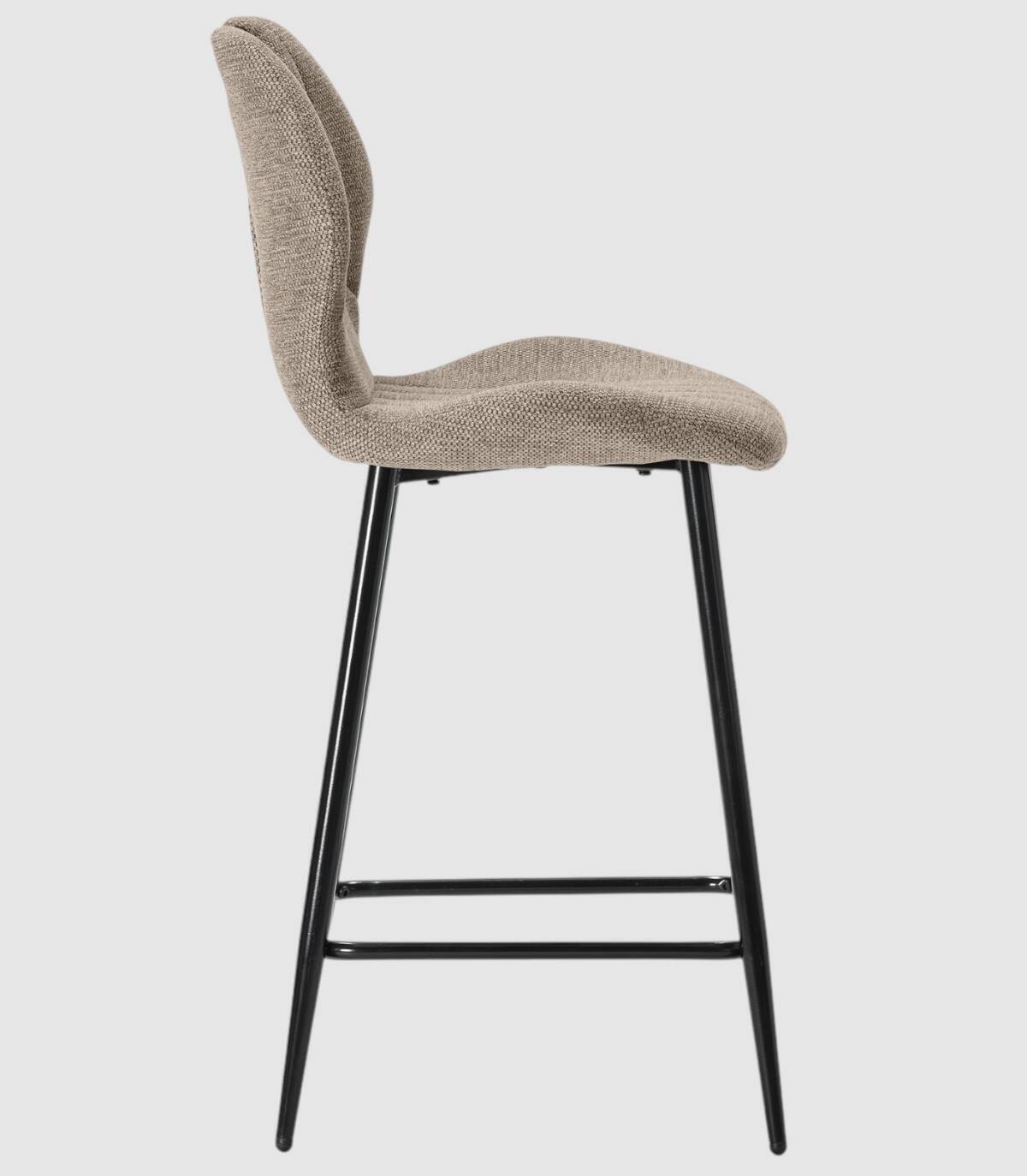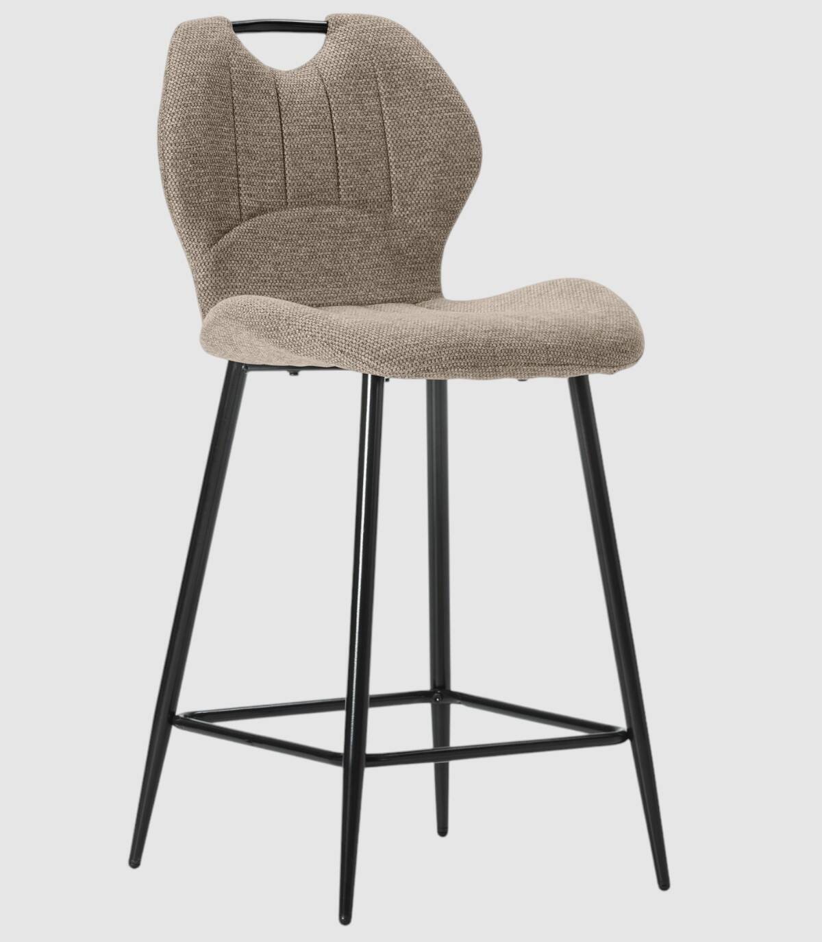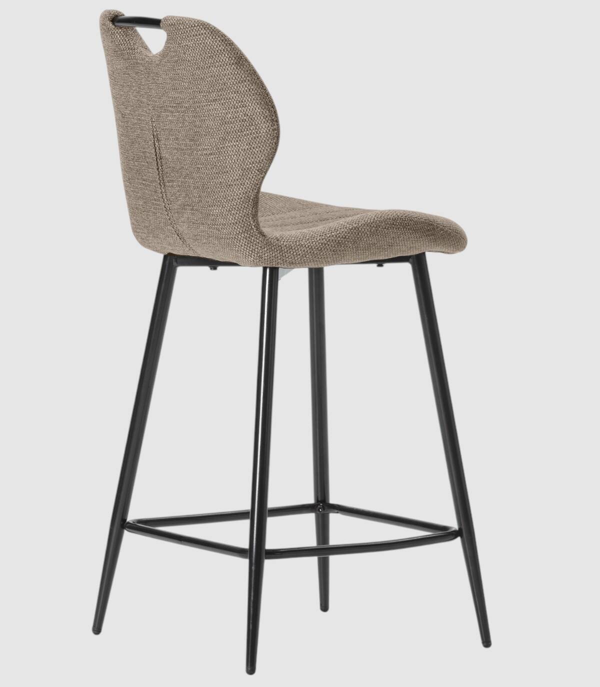 El taburete Yara se compone de asiento y respaldo tapizados de color marrón sobre estructura de metal con reposapies y cuatro patas de color negro.