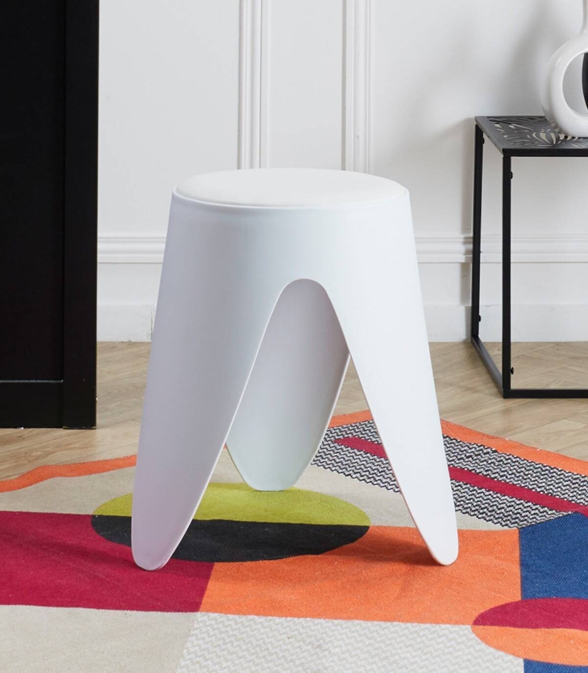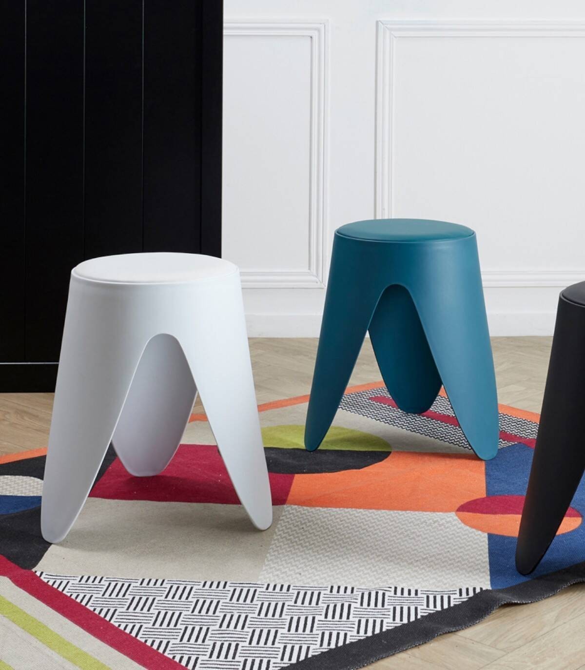 El taburete Eve apilable se compone de tres patas de plástico PP y PVC con asiento acolchado en PU.