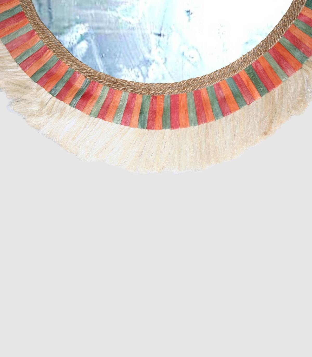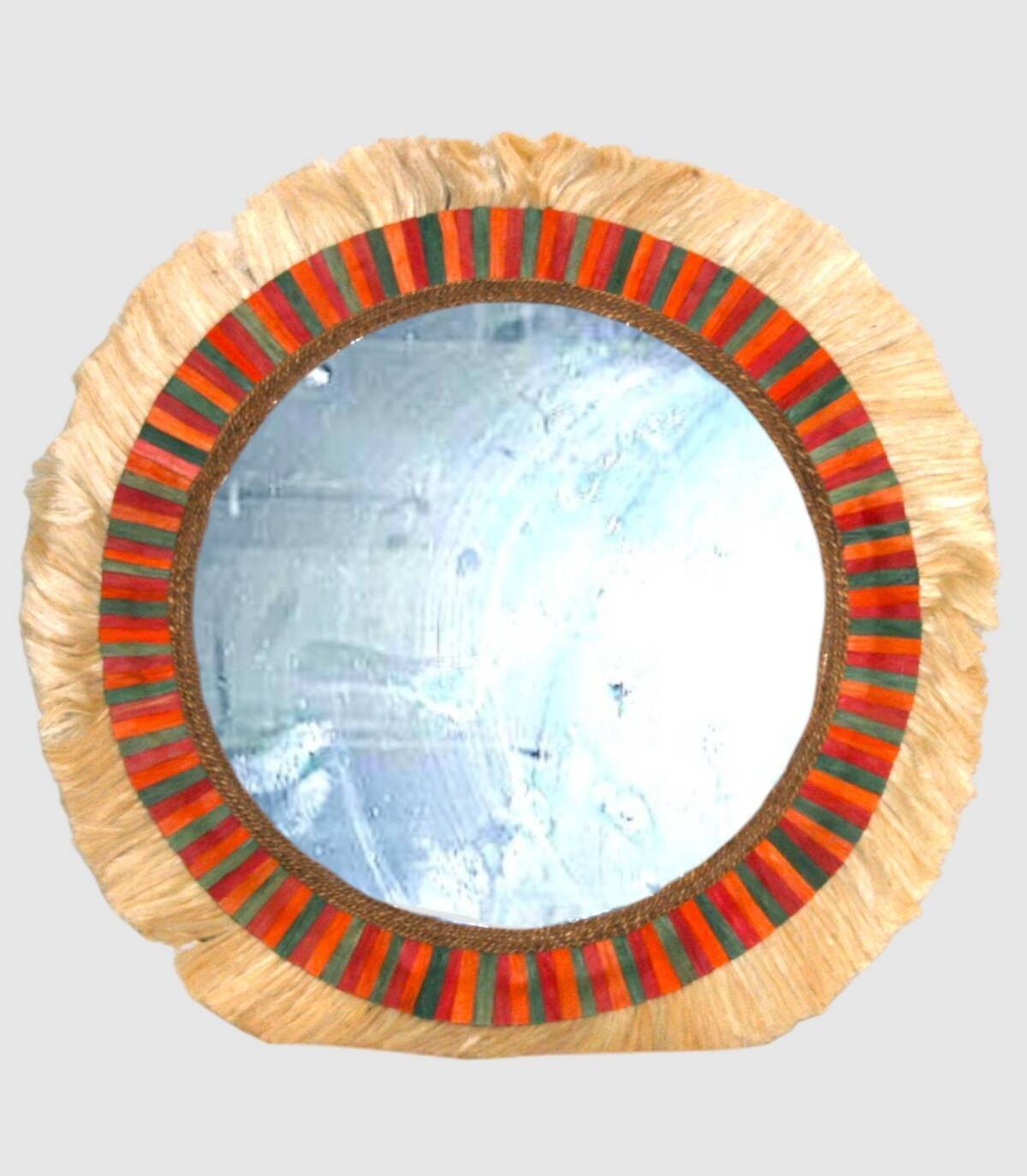 Espejo redondo con marco de hojas de color verde, rojo naranja y beige.