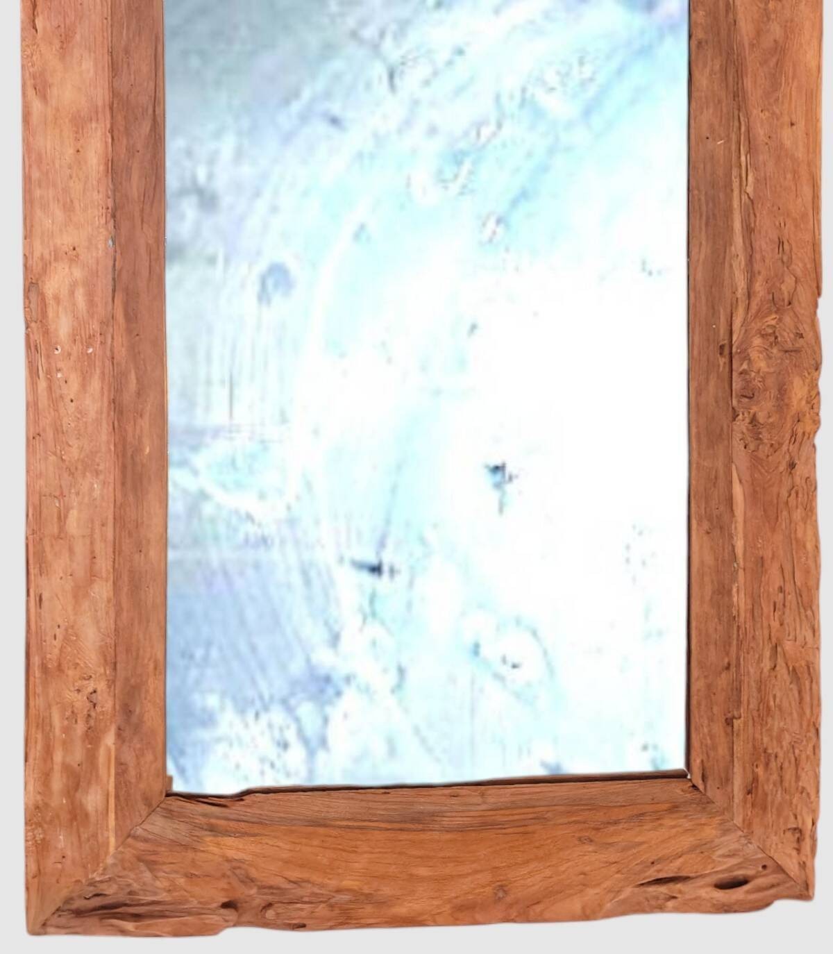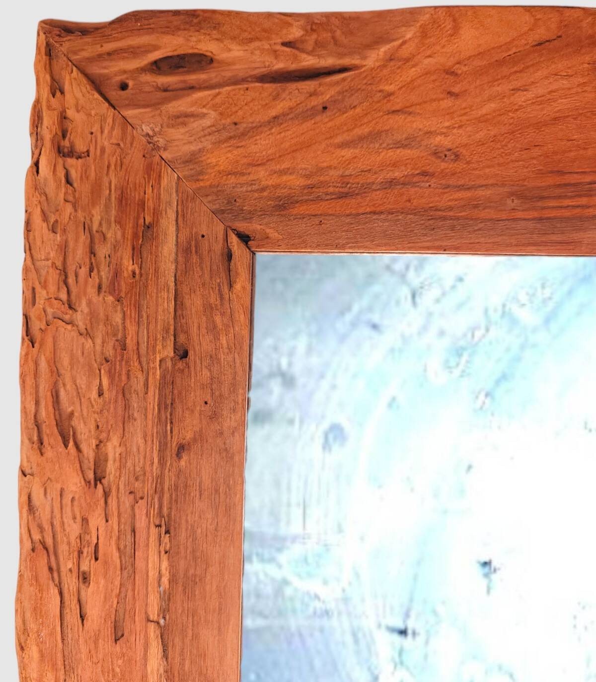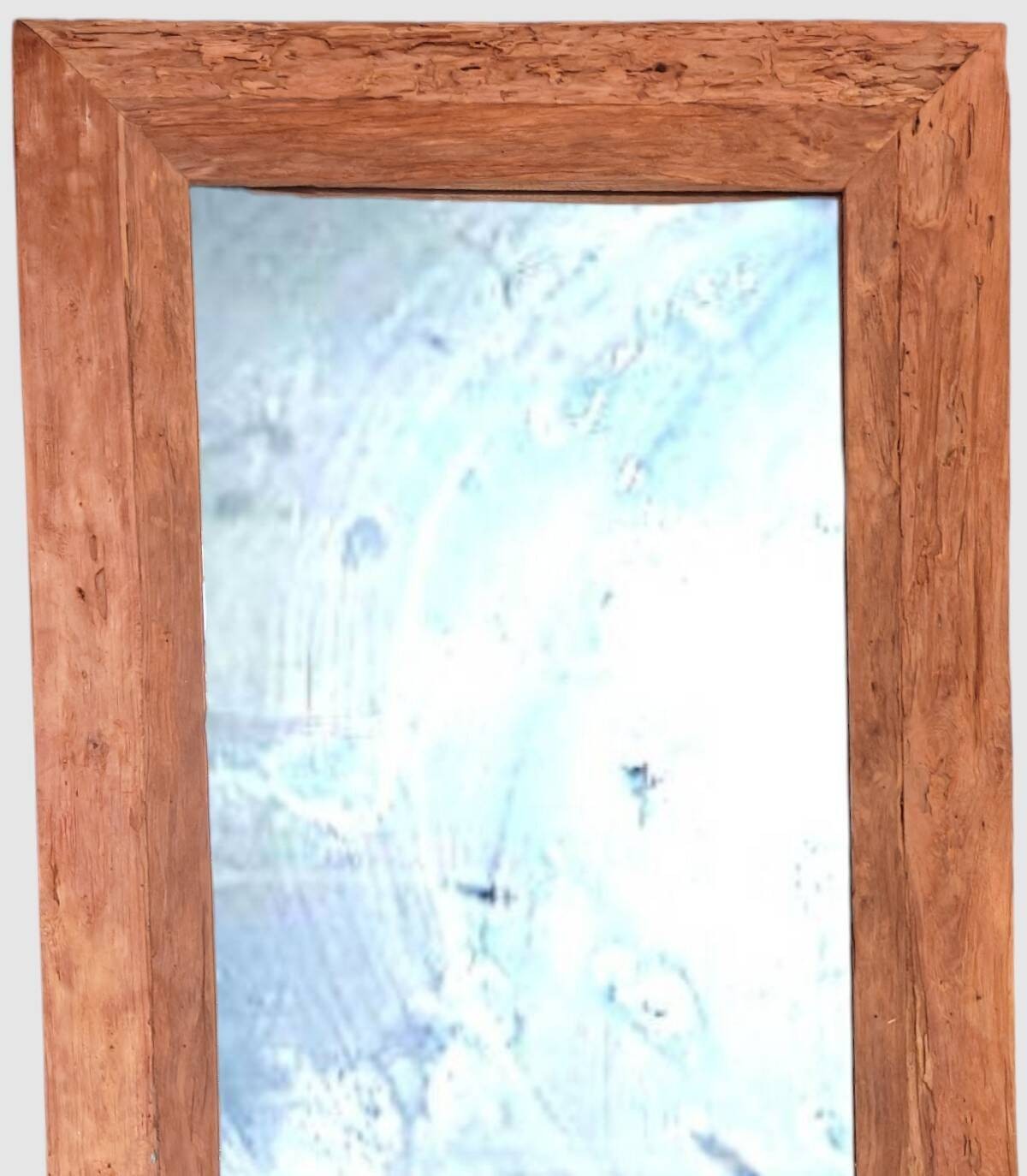 Espejo con marco rectangular de madera natural de estilo envejecido.