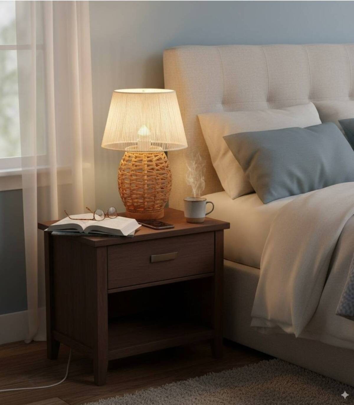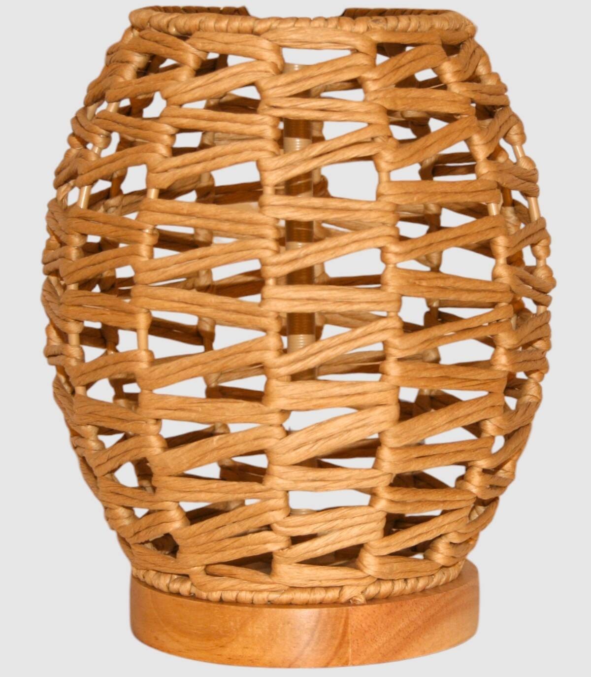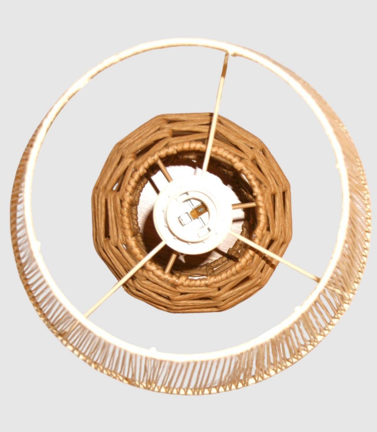 La lámpara beige y blanca esta compuesta por una base con estructura de metal y cuerda beige, pantalla con soporte blanco y cuerda blanca y cable blanco con interruptor.No incluye bombilla.