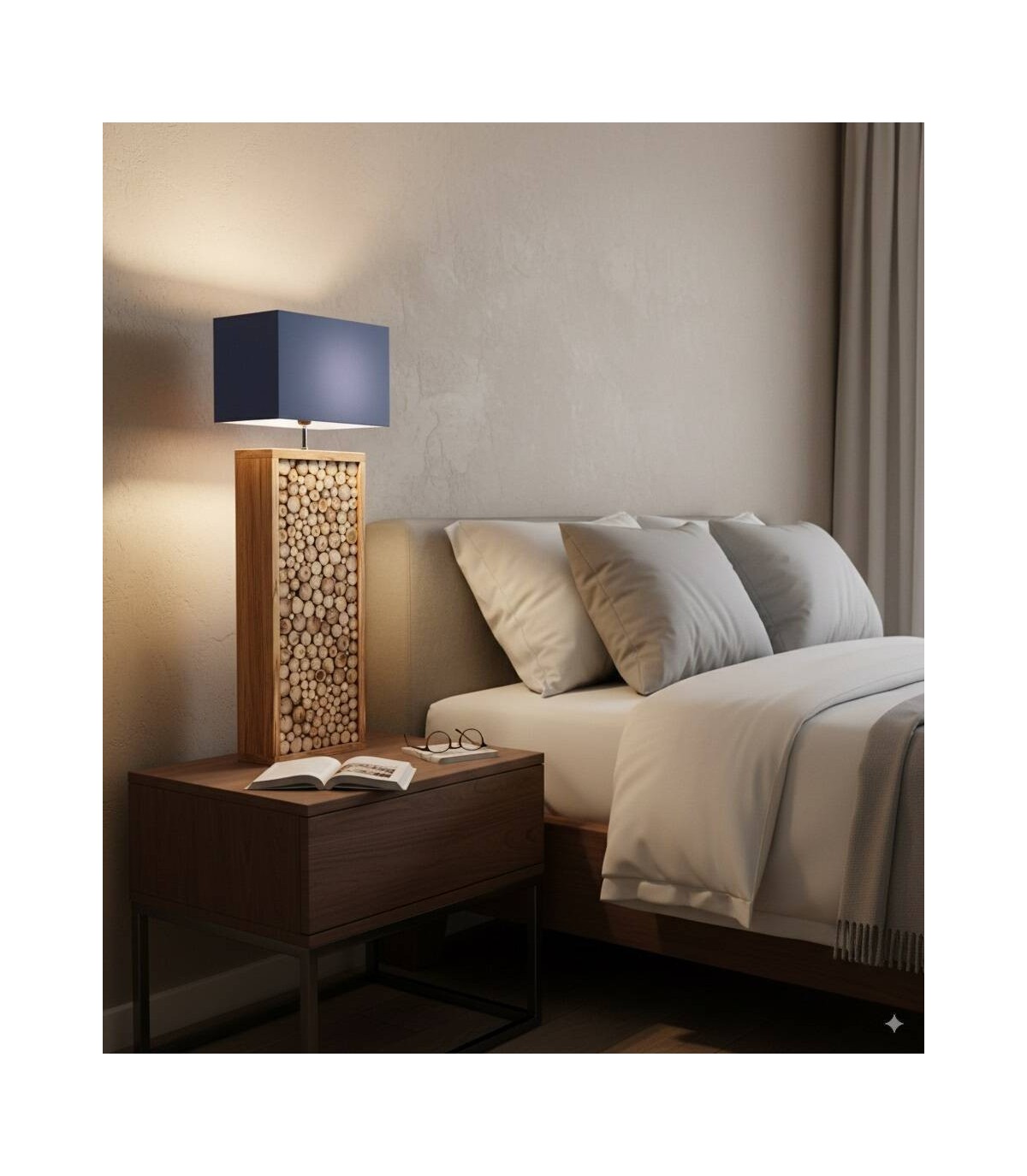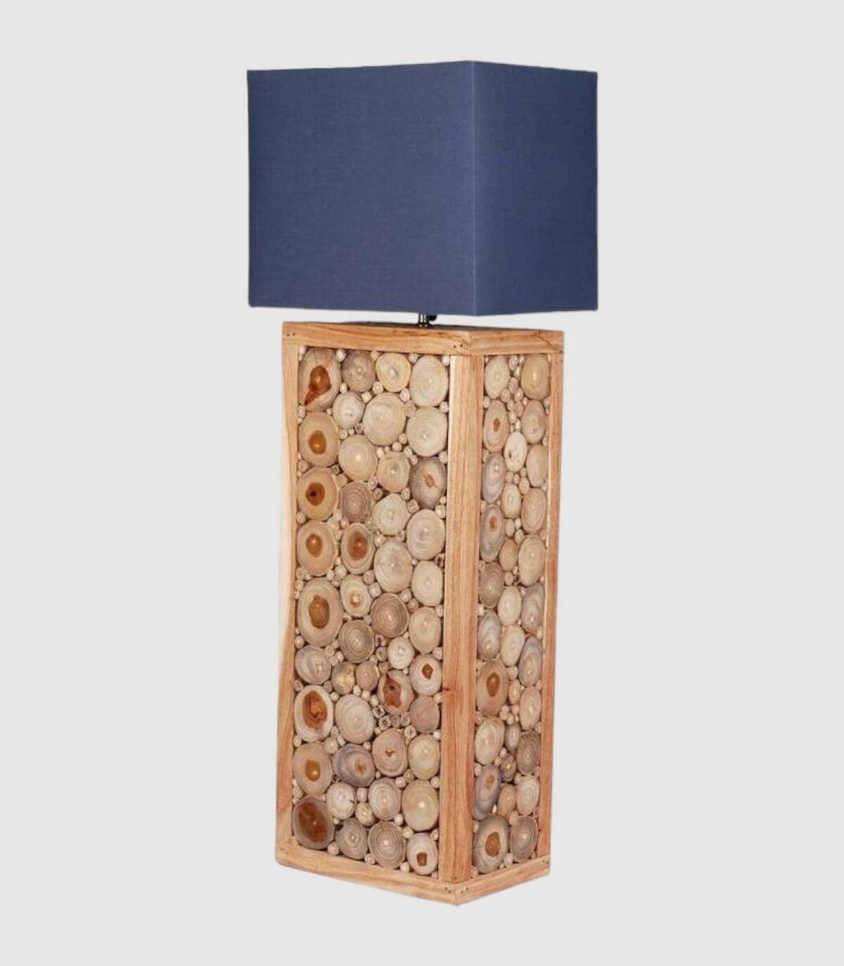 Lámpara pion grande: lámpara rectangular con marco de trozos de madera circulares y pantalla gris cuadrada. Ideal para ambientaciones de interiores dando un toque rústico y campestre sin dejar de combinar con cualquier estilo moderno