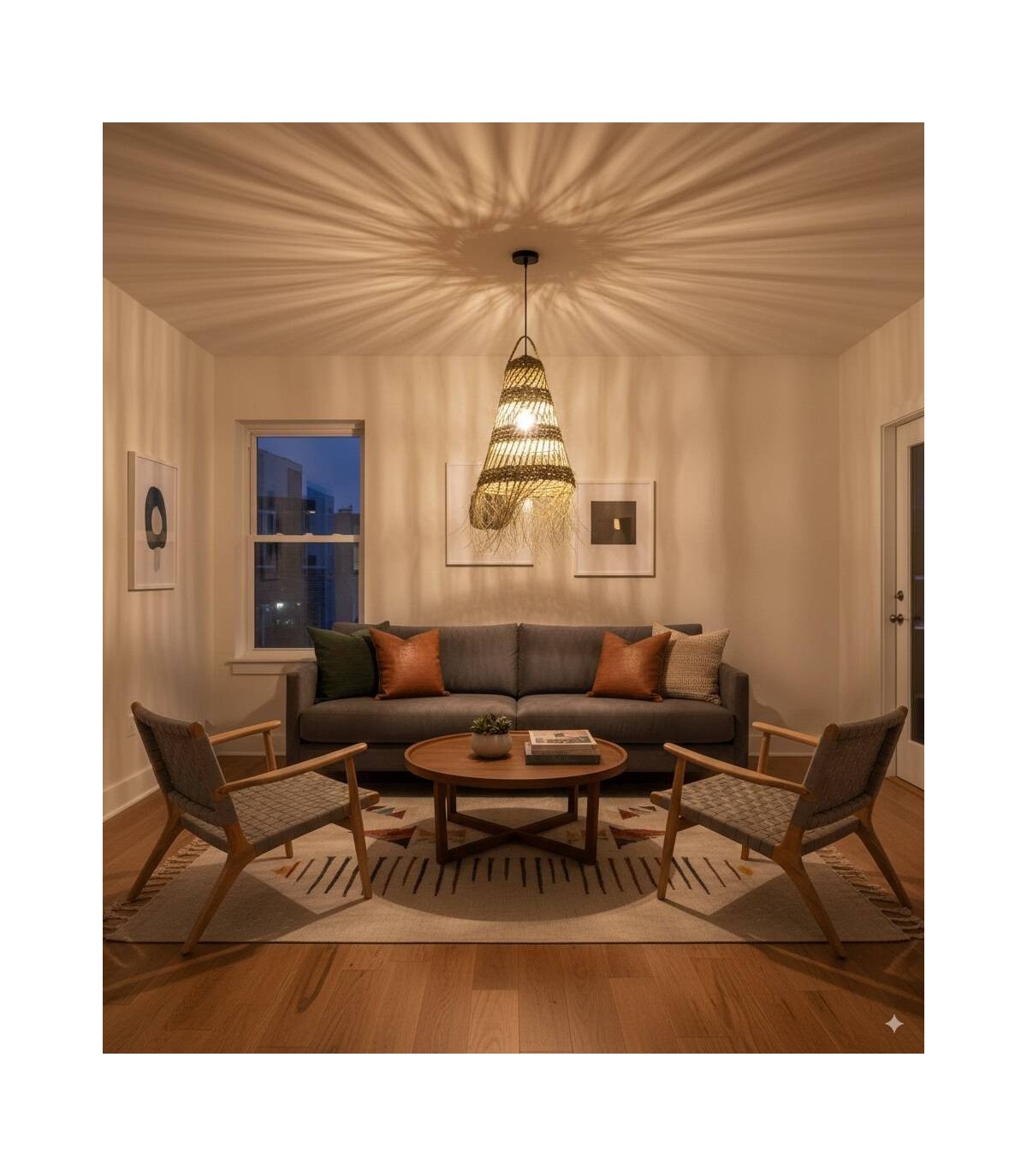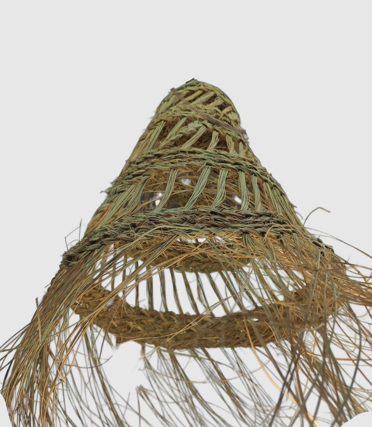 Esta lámpara cónica calada hecha artesanalmente de esparto da un toque étnico en cualquier sitio donde se instale, cambia de color según el uso si se usa en el exterior cambiando a un color mas amarillo. Se ve mucho la luz ya que no está cubierta totalmente de esparto y deja pasar la luz.