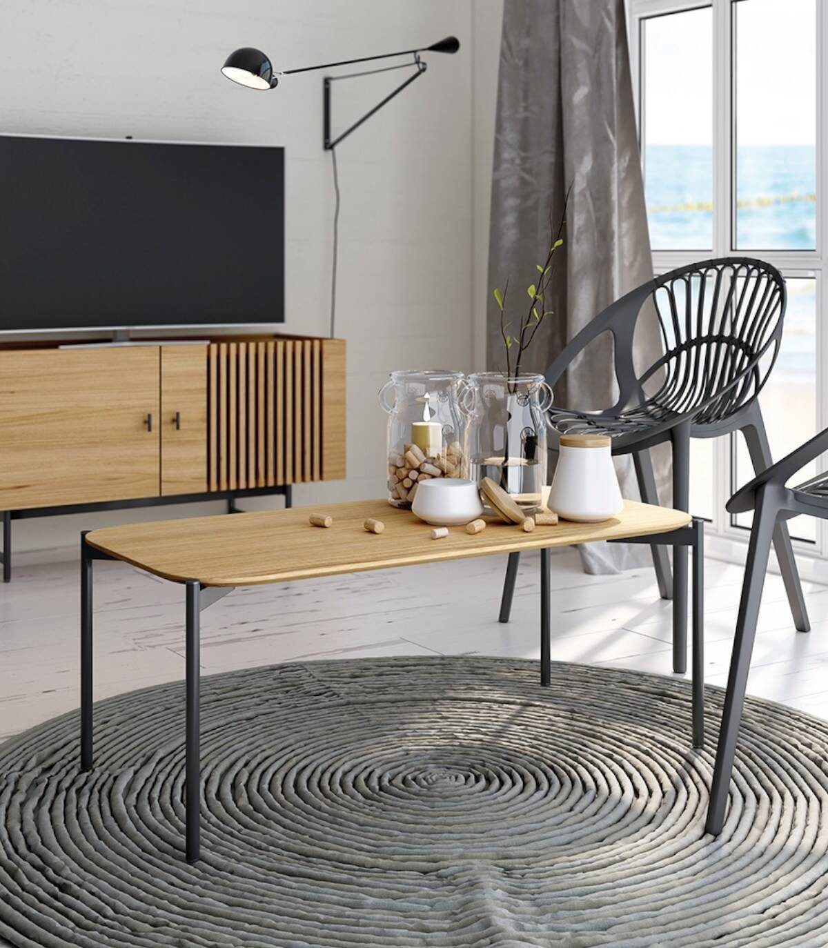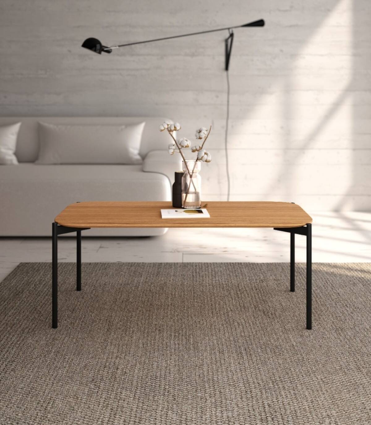 La mesa de centro Java rectangular, de diseño elegante y moderno, tiene sobre biselado con acabado estilo madera y patas de metal con barnizado negro.