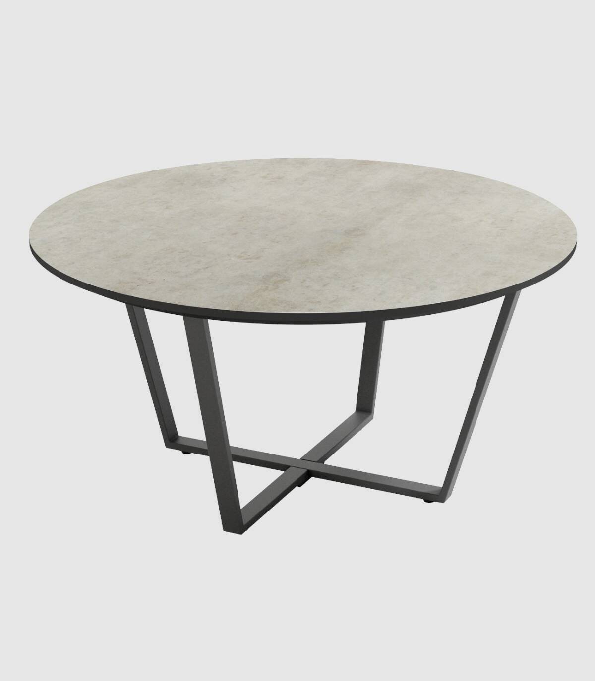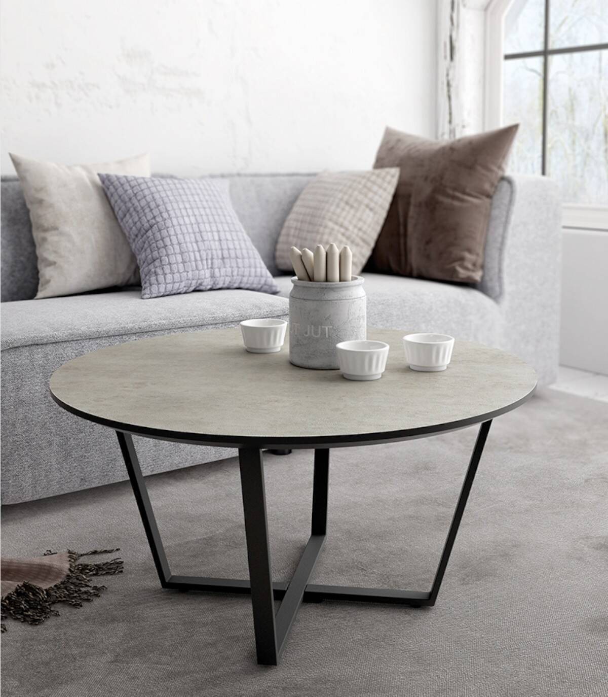 La mesa de centro Egeo redonda, de diseño elegante y moderno, tiene sobre biselado con acabado estilo piedra y estructura de metal con barnizado negro.