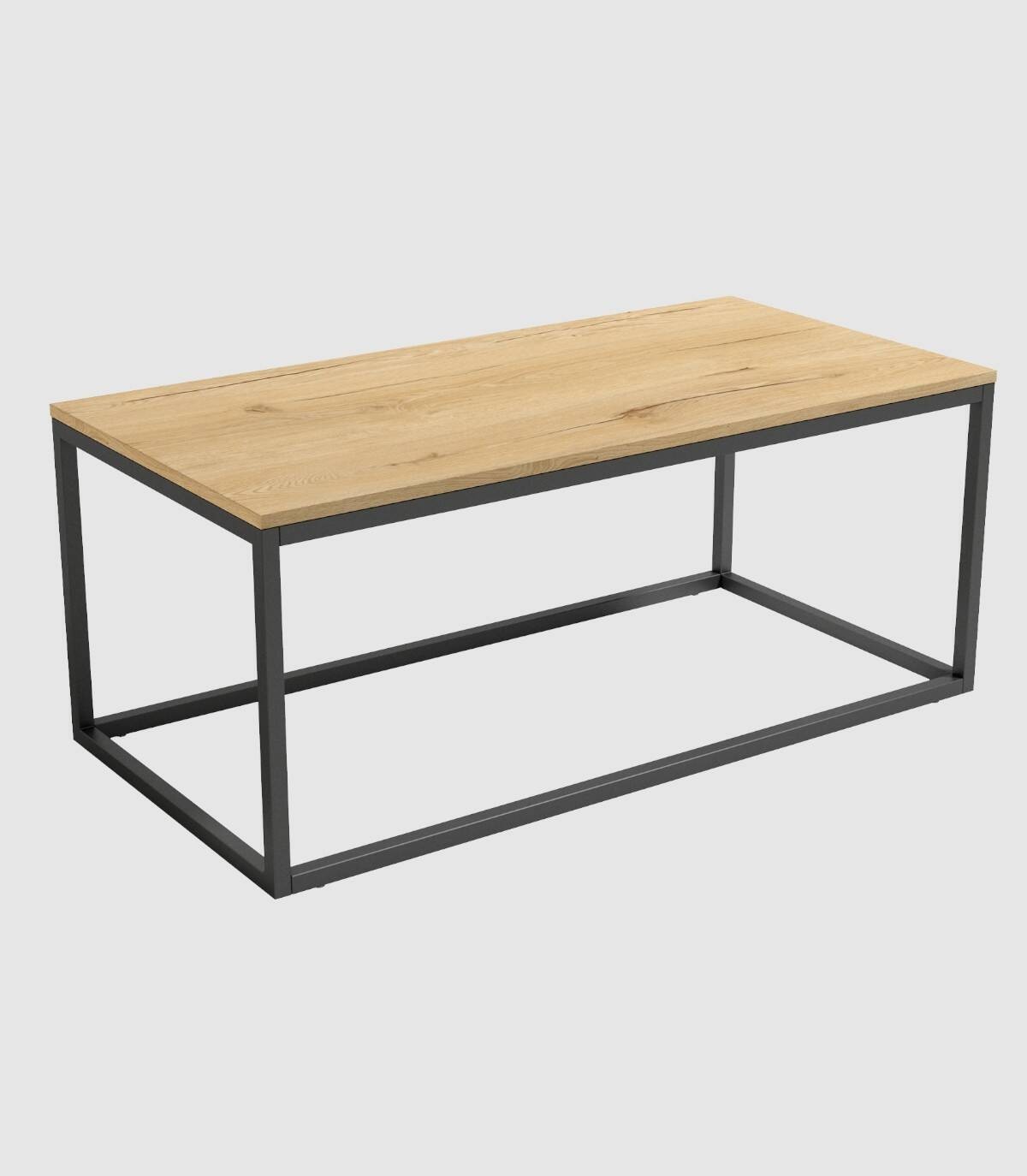 La mesa de centro Pacífico rectangular, de diseño elegante y moderno, tiene sobre biselado con acabado estilo madera y estructura de metal con barnizado negro.