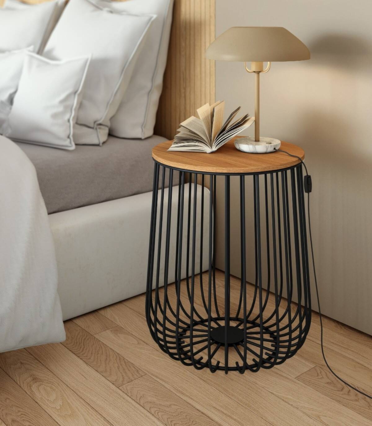 La mesa de centro Índico redonda, de diseño elegante y moderno, tiene sobre de madera color natural y estructura de metal con barnizado negro.