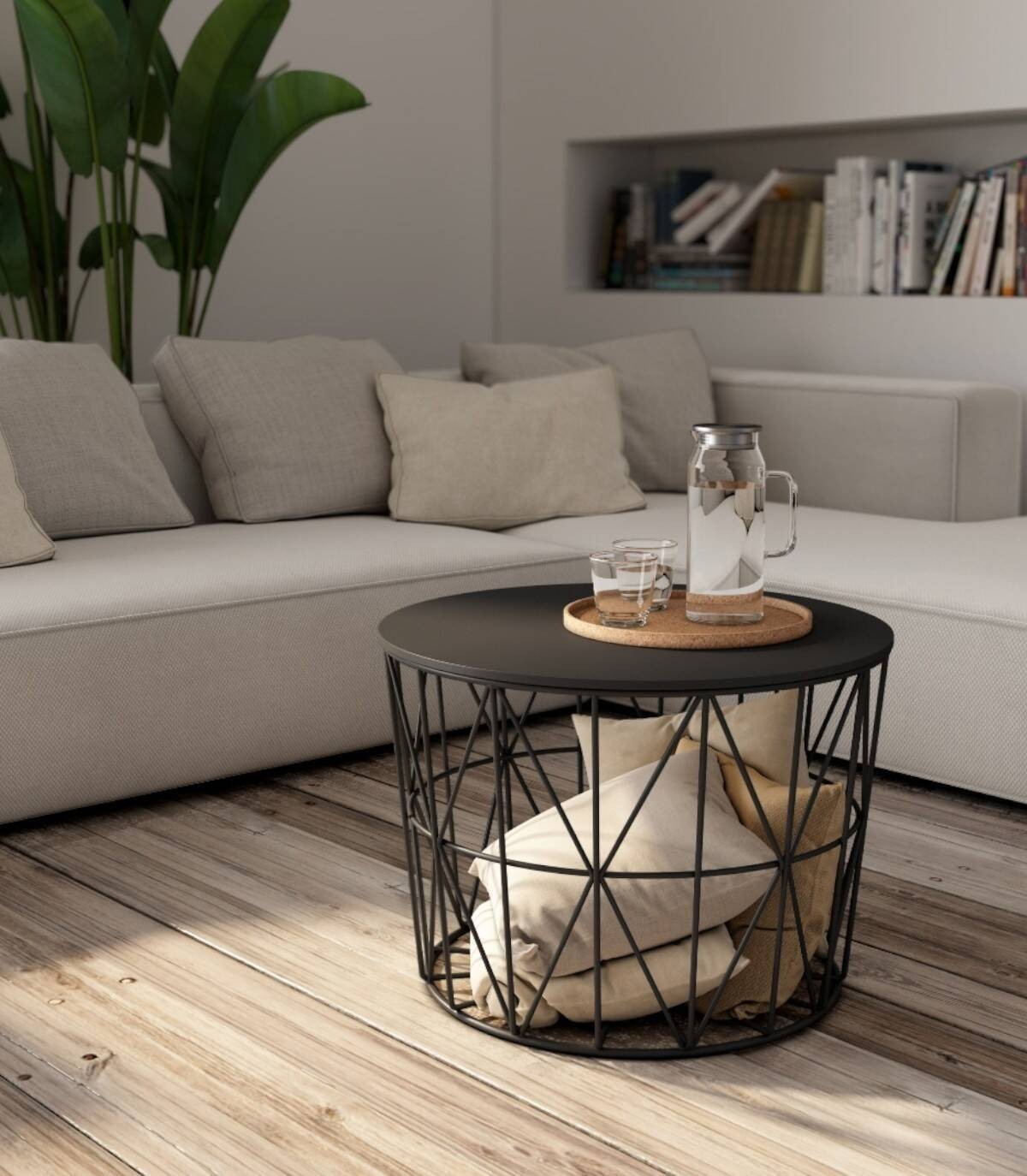 La mesa de centro Atlántico redonda, de diseño elegante y moderno, tiene sobre de madera con acabado en color negro y estructura de metal con barnizado negro.