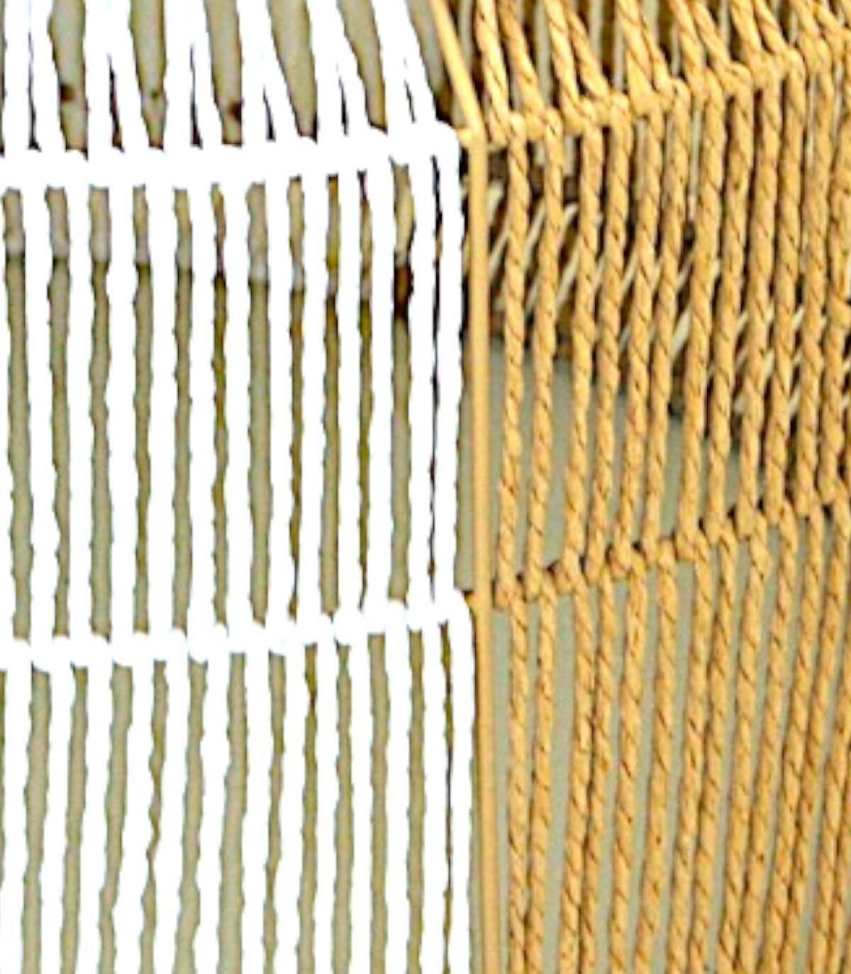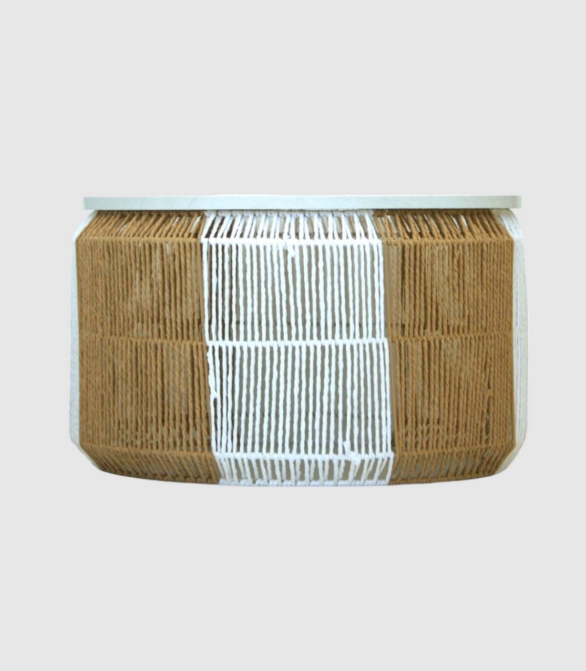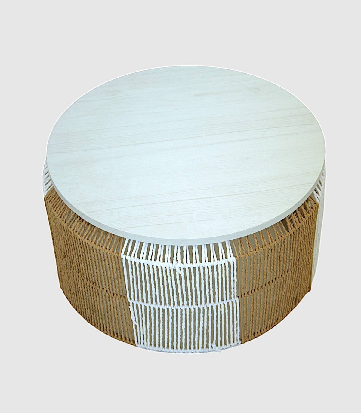 La mesa se compone de una trama de cuerda blanca y beige que envuelve una estructura de metal pintado de color beige con un tablero de madera color blanco.
