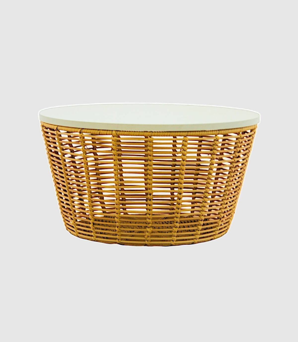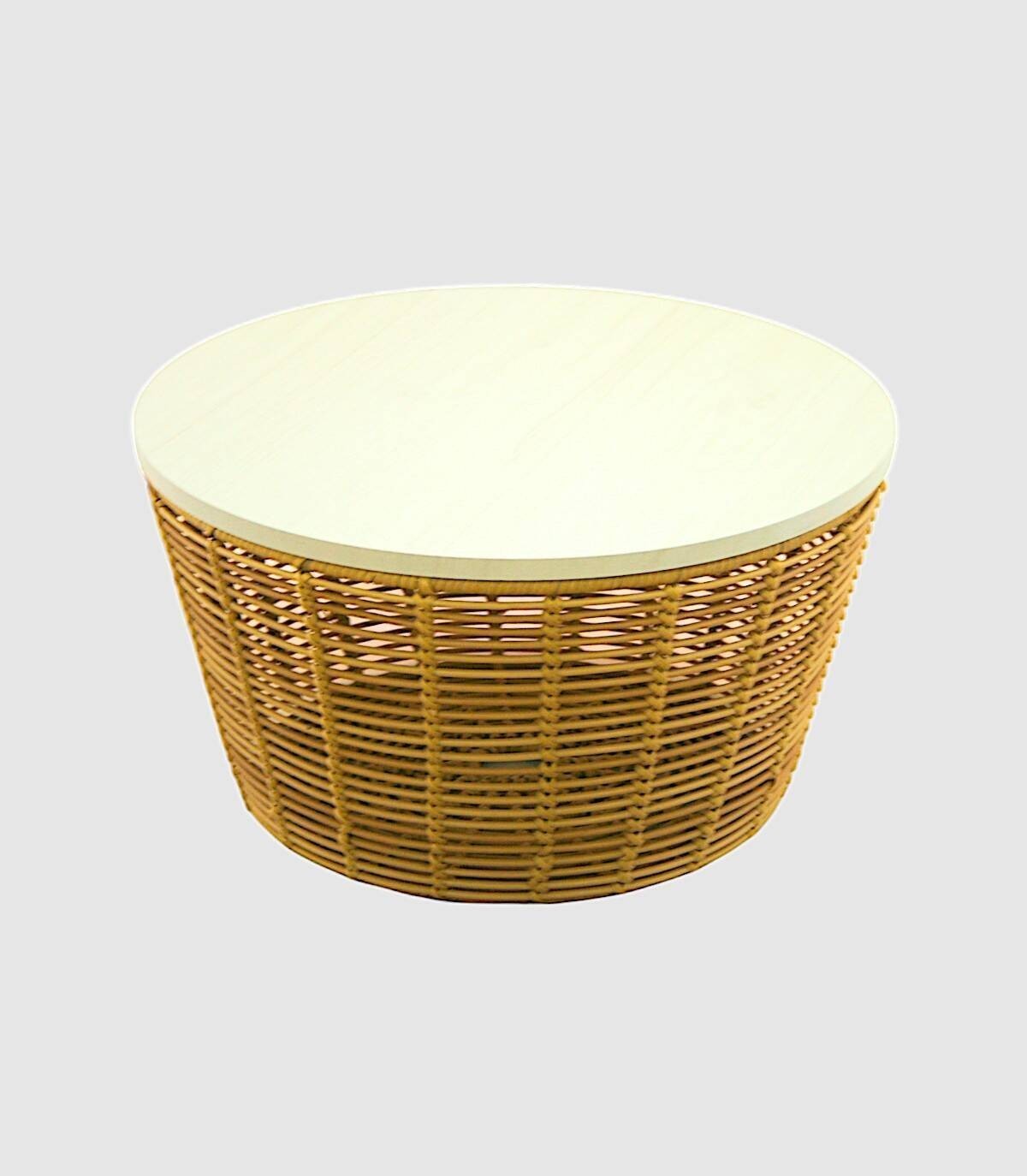 La mesa de ratán sintetico redonda se compone de una estructura de metal pintado de color beige cubierta con un entramado de ratán sintetico con tapa de madera blanca que permite destaparse.
