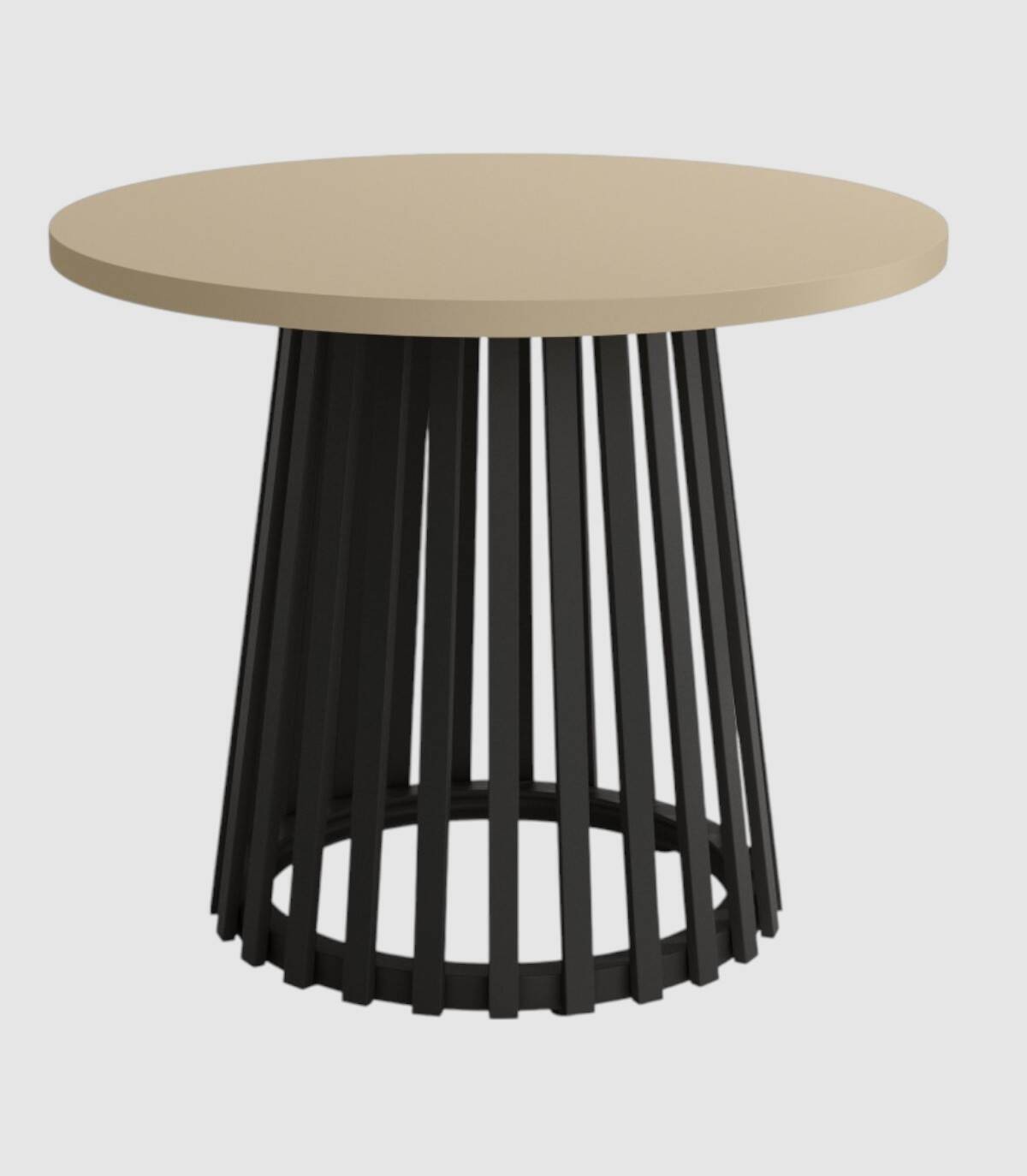La mesa de centro redonda Delta se compone de tablero acabado en melaminas sobre estructura metálica pintada de color negro con diseño de barras verticales.