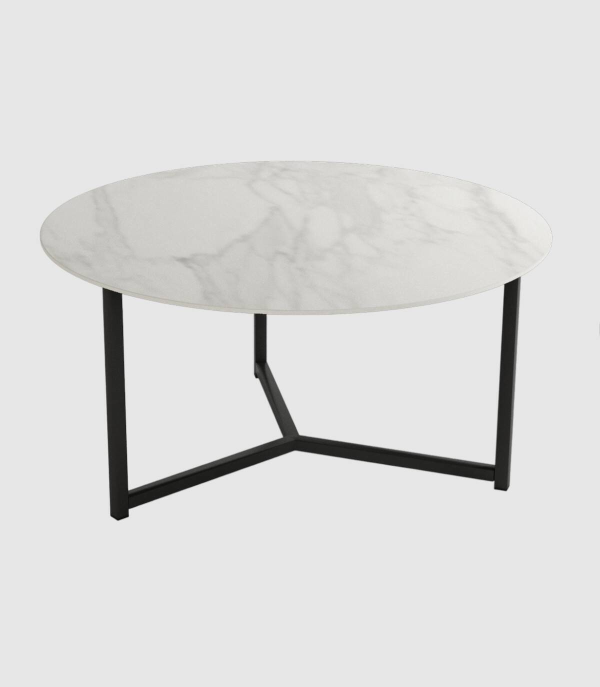 La mesa Balear de centro redonda se compone de tablero porcelánico de acabado en piedras sobre estructura de aluminio pintada de color negro con diseño de tres patas unidas por los extremos.