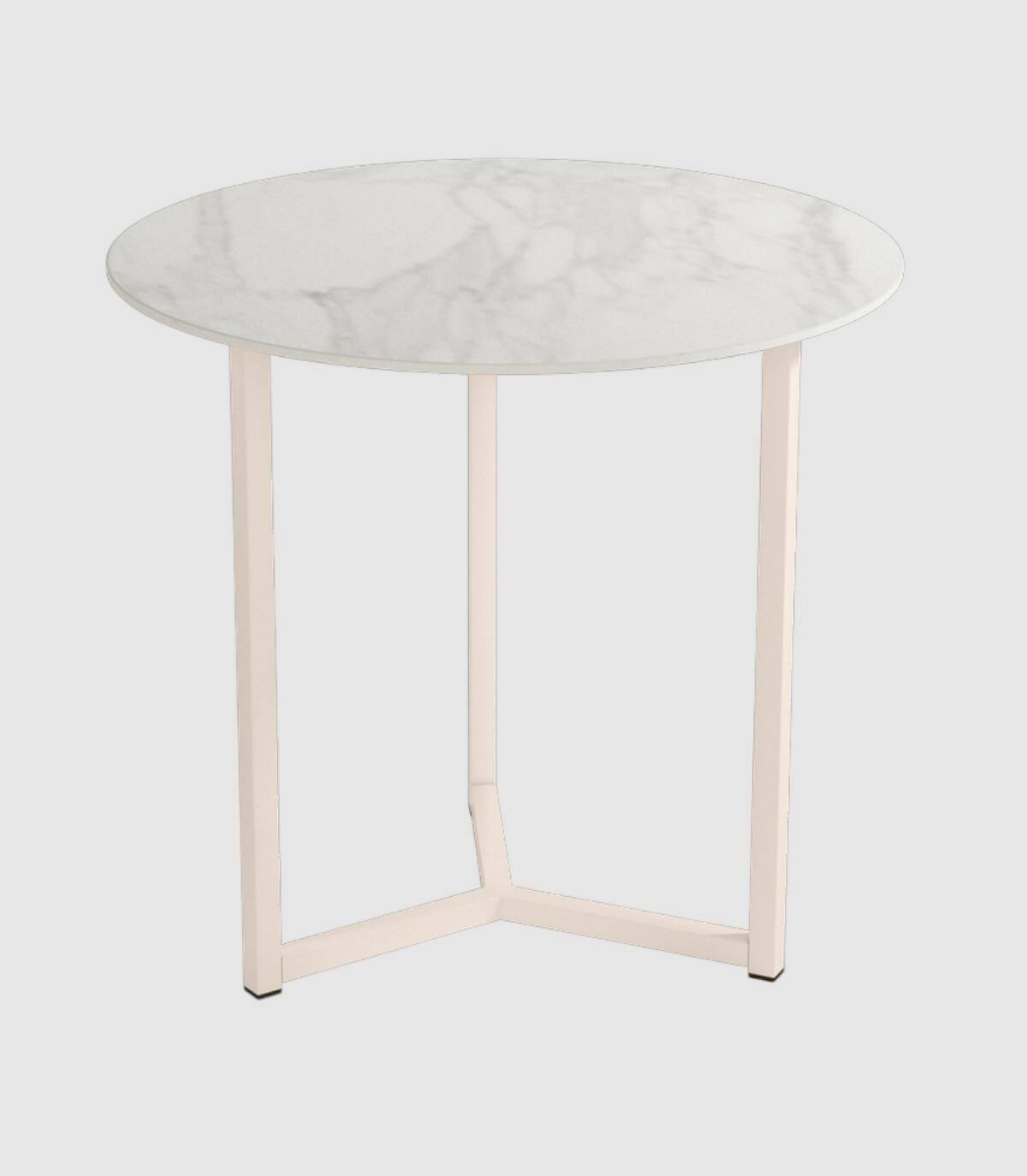La mesa Balear de centro redonda se compone de tablero porcelánico de acabado en piedras sobre estructura de aluminio pintada de color marfil con diseño de tres patas unidas por los extremos.