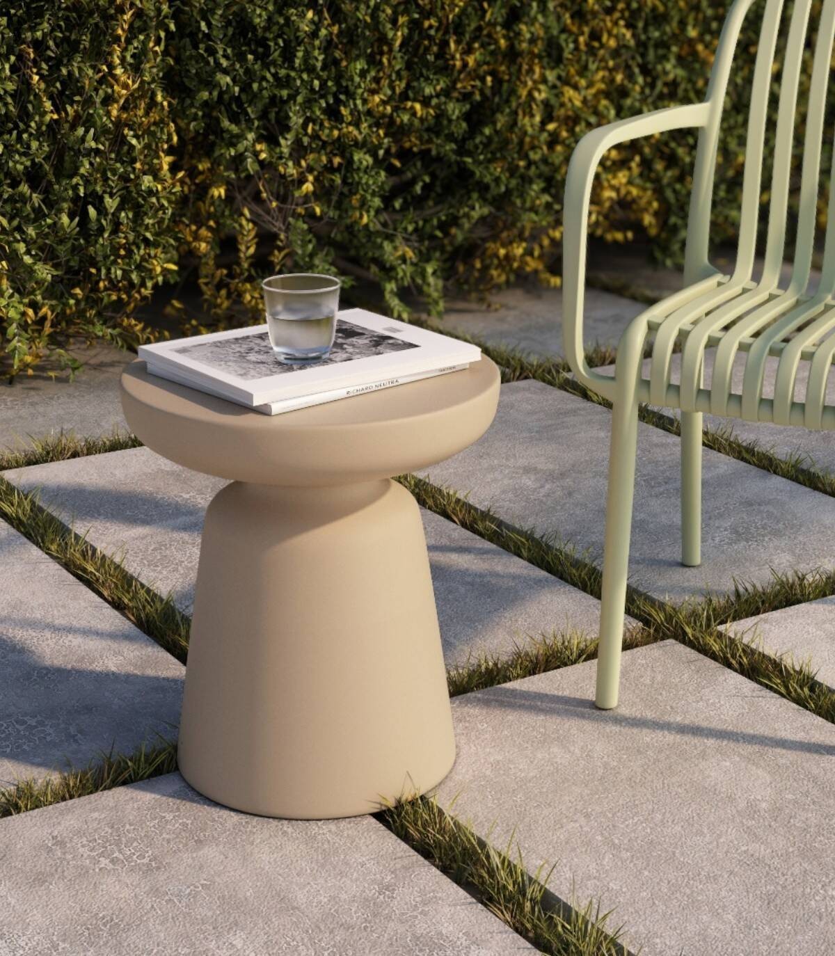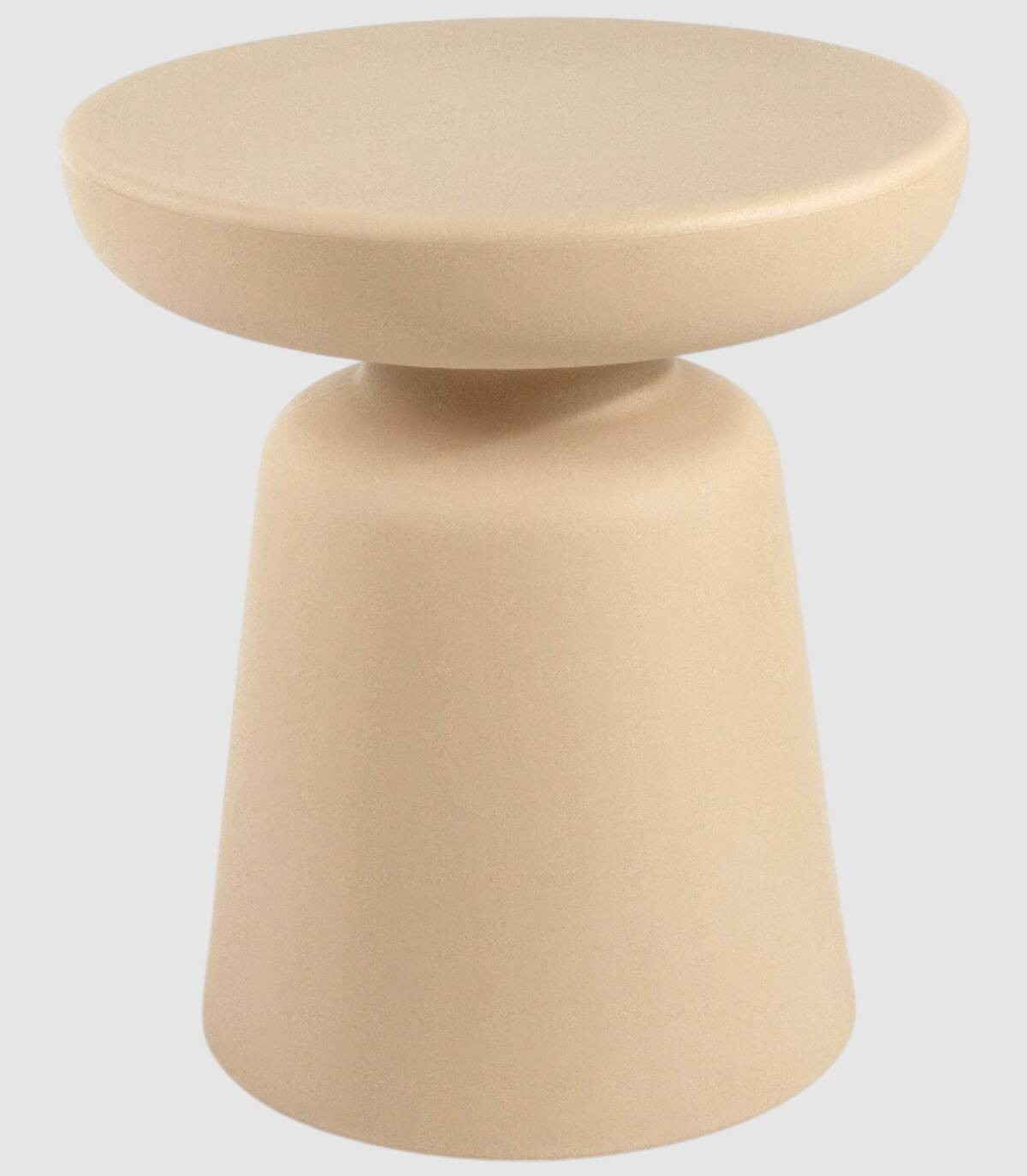 La mesa de centro Borneo redonda de exterior se compone de una pieza de polipropileno de color arena.