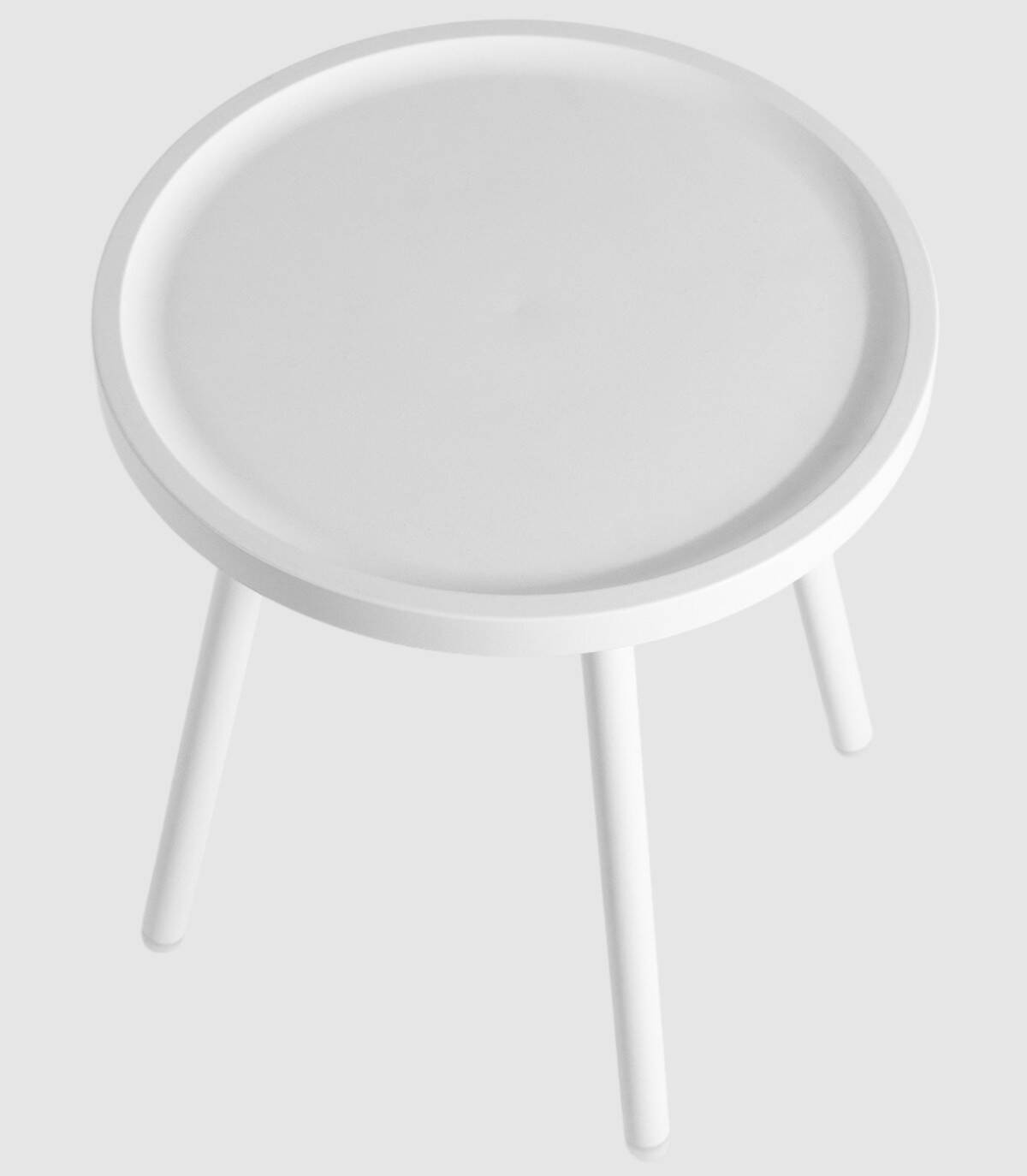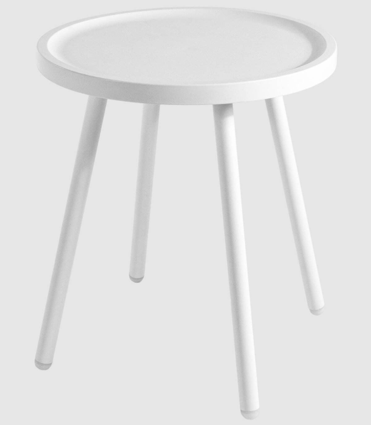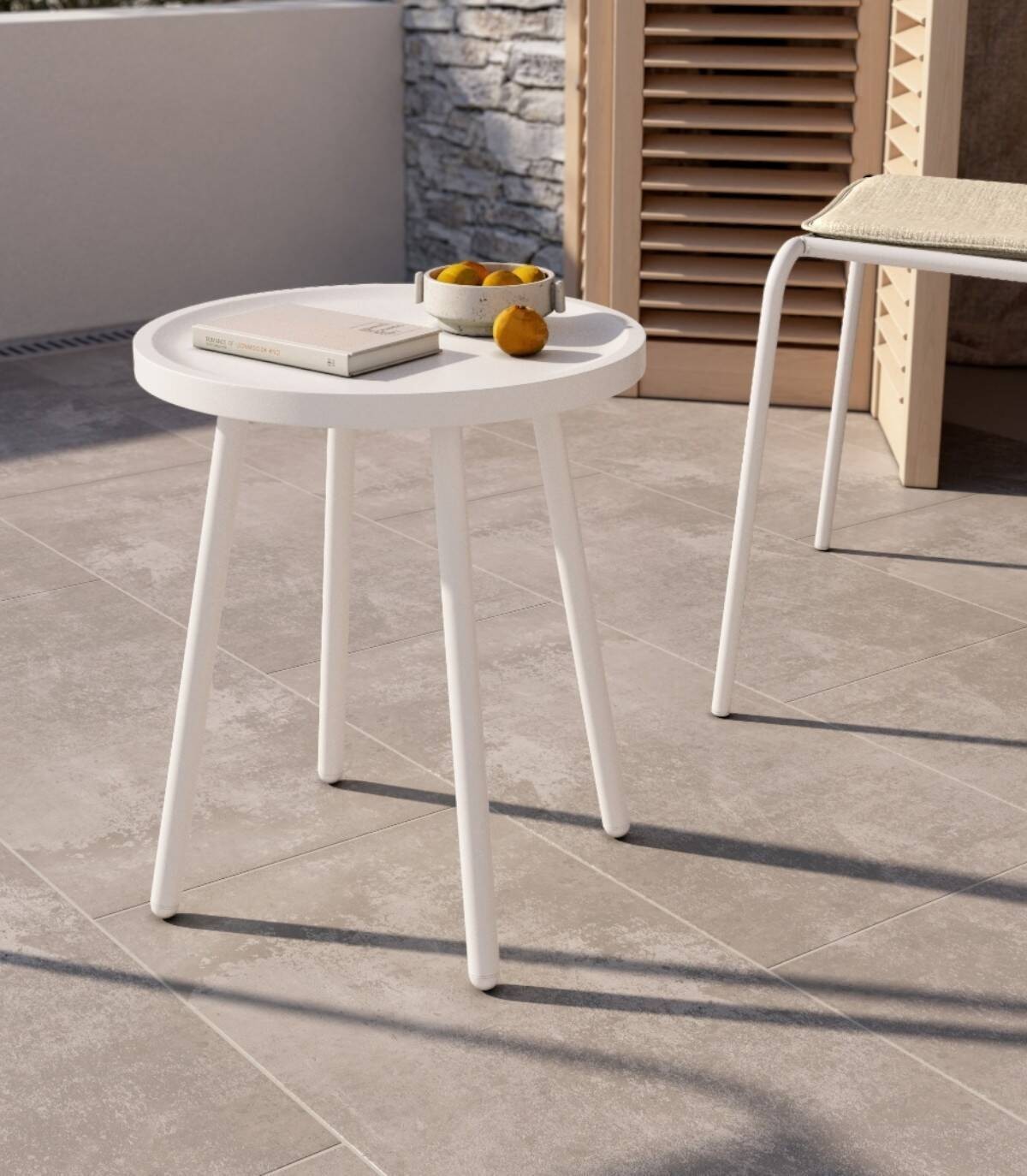 La mesa de centro Saba redonda de exterior se compone de sobre de polipropileno y cuatro patas metálicas pintadas del mismo color.