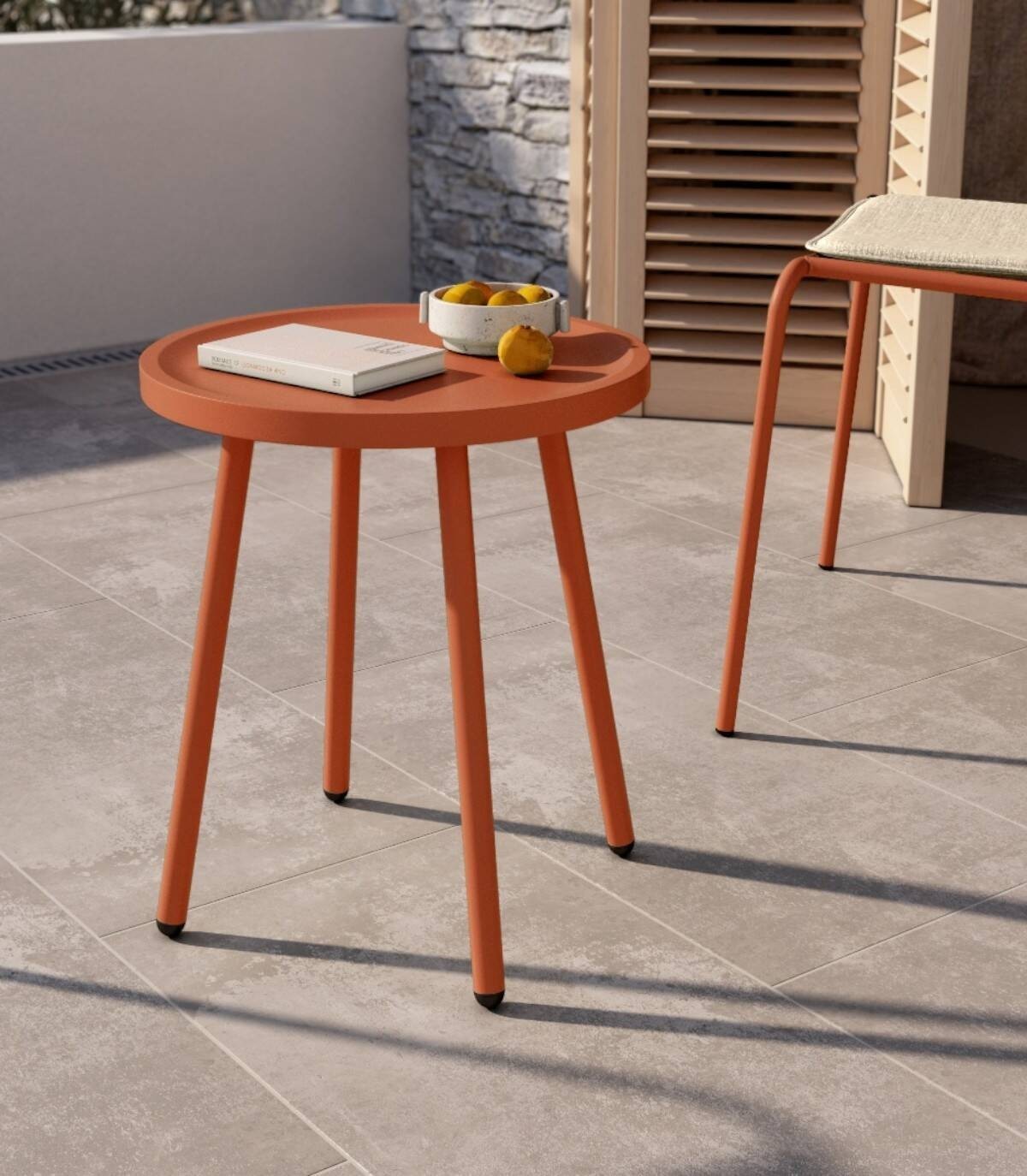 La mesa de centro Saba redonda de exterior se compone de sobre de polipropileno y cuatro patas metálicas pintadas del mismo color.