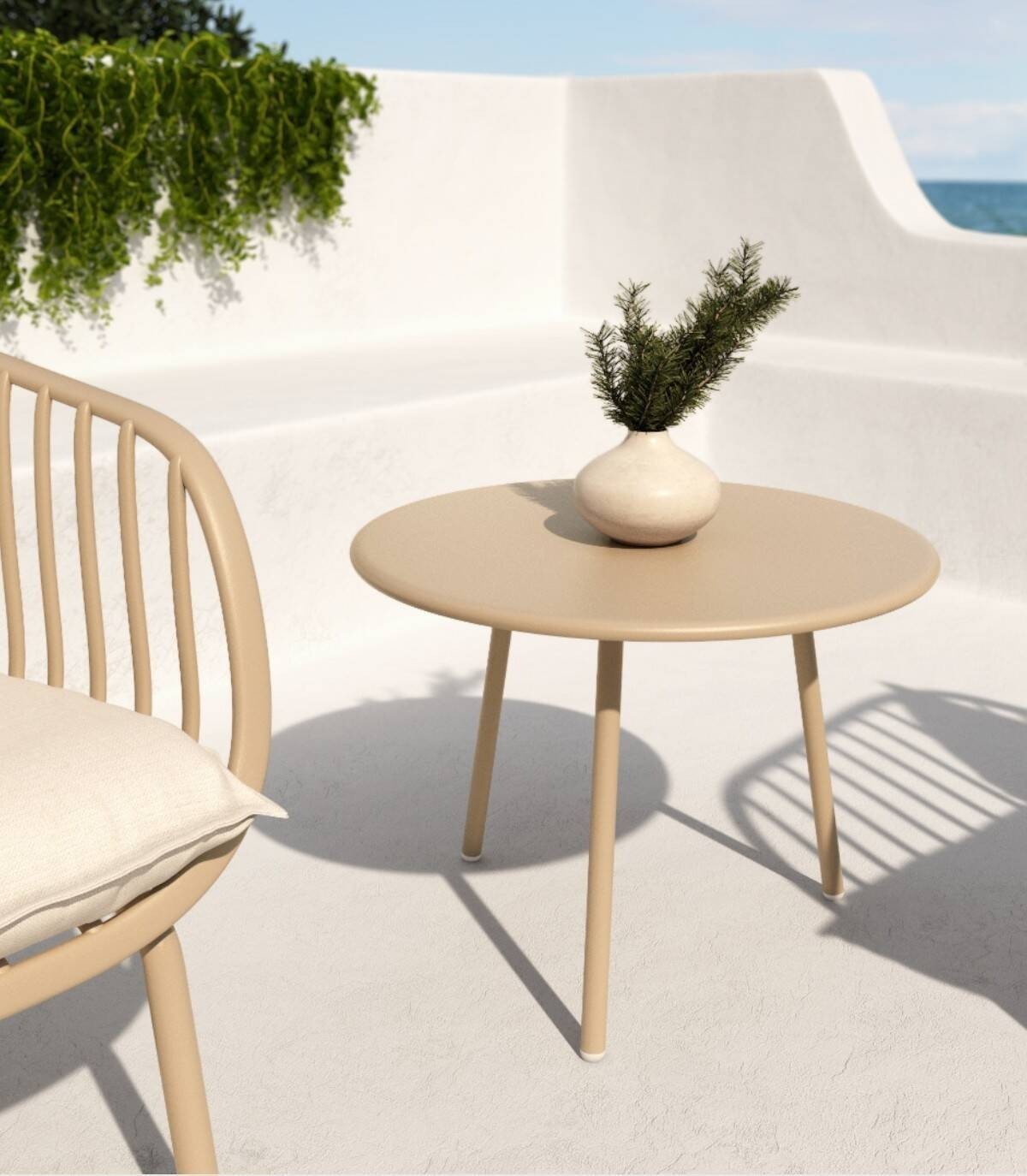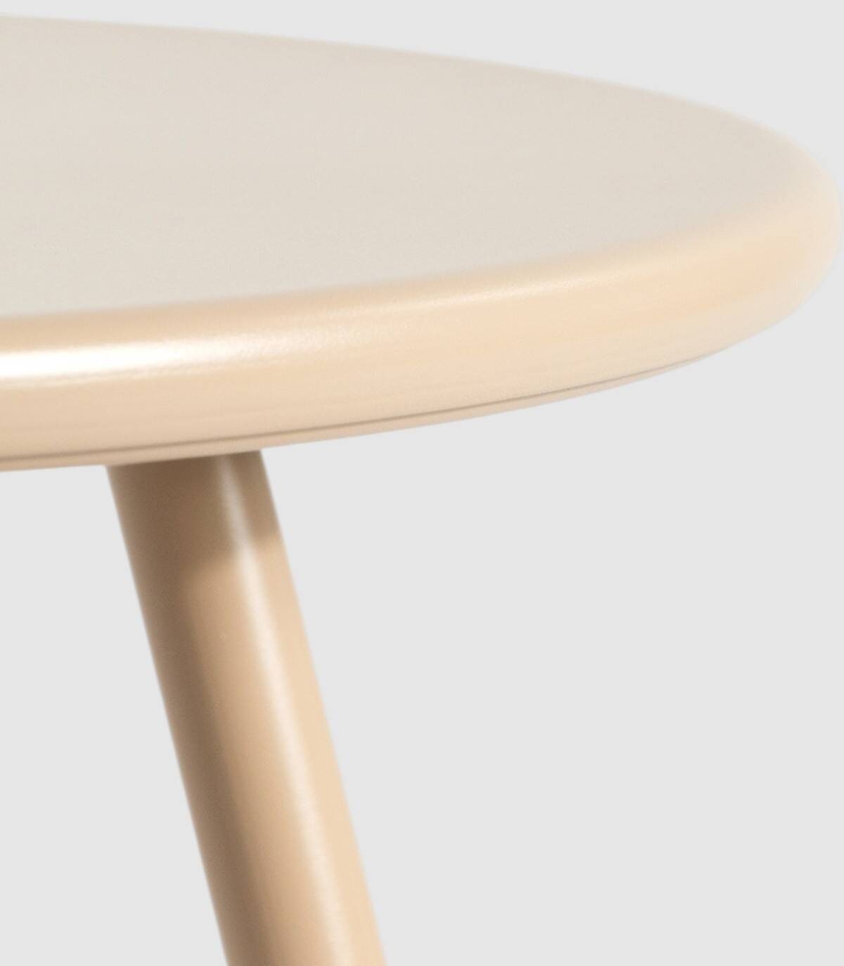 La mesa de centro Samoa redonda de exterior se compone de sobre metálico y tres patas metálicas pintadas del mismo color.