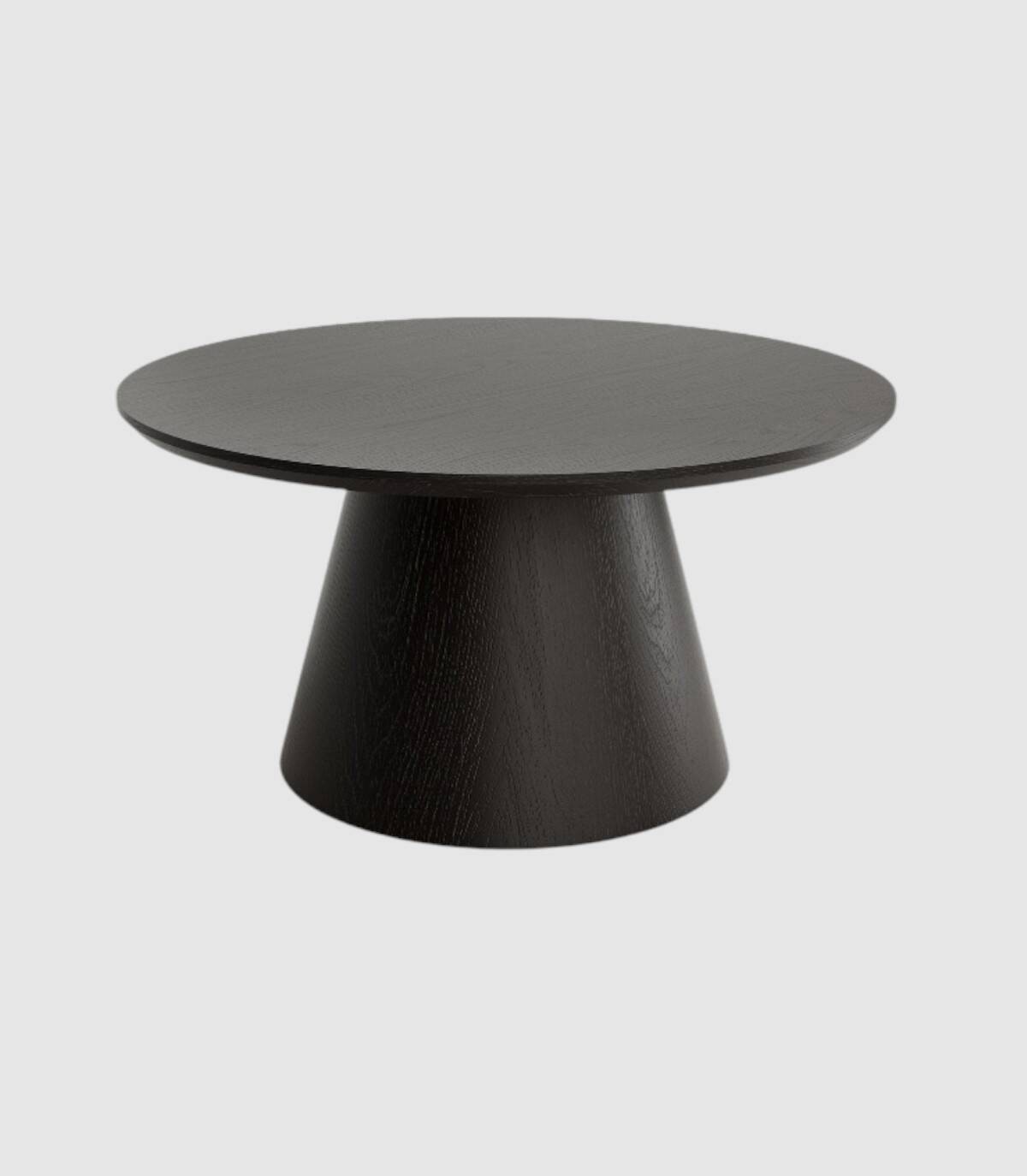 La mesa Namib de centro redonda se compone de tablero de madera biselado en acabado de madera de roble sobre pata central de madera en forma de cono.